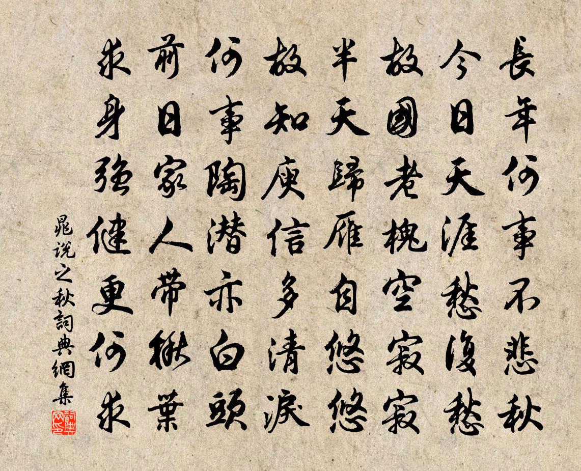 詩詞名句歷史字典書法欣賞書法字典國語詞典說文解字康熙字典古漢語字典標 題 作 者 詩 句 秋作者:晁說之 朝代:宋代秋原文長年何事不悲秋,今日天涯愁復愁。故國老槐空寂寂,半天歸雁自悠悠。故知庾信多清淚,何事陶潛亦白頭。前日家人帶楸葉,求身強健更何求。詩詞問答問:秋的作者是誰?答:晁說之問:秋寫於哪個朝代?答:宋代晁說之秋書法欣賞秋書法作品詩詞推薦鷓鴣天葛長庚〔宋代〕西畔雙松百尺長。當時親自見劉王。山前今日蓮花水,往者將軍洗馬塘。南粵路,漢宮牆。晚風歷歷說興亡。摩挲太皇太后合春帖子六首蘇頌〔宋代〕聖詔頒寬大,天恩遍邇遐。雷風孚號令,草木動萌芽。酬樂天東南行詩一百韻元稹〔唐代〕我病方吟越,君行已過湖。去應緣直道,哭不為窮途。亞竹寒驚牖,空堂夜向隅。暗魂思背燭,危夢怯乘桴。坐痛呈羅叔異三首曾豐〔宋代〕吾疑子亦慣乘機,乃枉華軒扣竹扉。不是梅花不相外,囊猶未癭若為歸。燕子來舟中作杜甫〔唐代〕湖南為客動經春,燕子銜泥兩度新。舊入故園常識主,如今社日遠看人。可憐處處巢君室,何異飄飄托此身。暫語鼷鼠操王令〔宋代〕鼷鼠鼷鼠,實食其牛,牛則不知。彼牛彼牛,既卜以郊,傷則免之。和東林湛堂禪師喜雪韻五首袁燮〔宋代〕祈禱精誠凱上通,培祥未與去年同。老懷日夜憂無奈,安得寒花屢舞風。題臨江清遠軒壁趙汝礩〔宋代〕江清疑可濯吾纓,小泊扁舟繞寺行。對岸丹楓尋不見,雨雲遮斷古蕭城。偈頌一百零一首釋慧性〔宋代〕無語中有語,名曰死句。有語中無語,名曰活句。可謂剜肉作瘡,皮穿骨露。舉不顧,即差牙,閃電光中走鳥兔。夜過李商叟趙蕃〔宋代〕每見必匆匆,談詩口不空。林間驚落月,坐上覺生風。老大君無敵,飄零我漫窮。問的才半百,歸及未成翁。趟資政號節齊釋慧開〔宋代〕著鞭占得地頭寬,高節心空立處端,多向渭川煙外望,這邊風月少人看。臨雲閣舒坦〔宋代〕高僧終日笑憑欄,亦似無心懶出山。幾度海風吹散雨,坐看彩翠落人間。詠梅周南〔宋代〕此君一日不可欠,獨爾梅花動隔年。更有晦冥風雨在,可能相見不依然。觀王氏書梅堯臣〔宋代〕先觀書雍姬舞六書麼,妍葩書發艷春風搖。舞罷英英書大字,玉指握書濃雲飄。風馳雨驟起變怪,文鰩晝飛明珠跳接家書劉黻〔宋代〕朝朝聽來鴻,來鴻一何邈。秋往冬又至,爾鴻胡來遲。凝眸屢東眺,飛雲渺天角。薄晚雲四低,來鴻似微雀。習習春日北山二首高翥〔宋代〕人緣白石溯清溪,手剝蒼苔認舊題。春色滿山歸不去,柝桐花裹畫眉啼。騎驢二首陳師道〔宋代〕沖籬突市不逡巡,掠面驚風撲眼塵。出手推敲寧避尹,題門吟詠不逢人。夜雨暴至陸游〔宋代〕堂中虛窗雨氣入,堂前叢竹雨聲急;山童束縕走求火,屋漏惟愁打書濕。秋風罷亞九千頃,此夕真成傾玉粒。蹋歌客枕聞鵑吳錫疇〔宋代〕煙新寒食過,月皎子規來。萬里他鄉恨,千年故國哀。窗深欹枕聽,夢短到家回。為爾添愁寂,春風不耐催。郡齋感懷寄呈參政給事同年宋庠〔宋代〕老持藩印守河衛,苟祿惟知戀軾熊。游舊最叨青眼客,埏陶今仰黑頭公。巢由逸躅心空斷,儒墨常談耳欲聾。自笑名句推薦誰問旗亭,美酒斗十千。賀鑄《行路難·縛虎手》 其交也以道,其接也以禮孟子《孟子·萬章章句下·第四節》 寧可人負我,切莫我負人。佚名《增廣賢文·上集》 疏條交映,有時見日。吳均《與朱元思書》 滿招損,謙受益佚名《尚書·虞書·大禹謨》 秋色到空閨,夜掃梧桐葉。夏完淳《卜運算元·秋色到空閨》 斟酌姮娥,九秋宮殿冷。史達祖《齊天樂·中秋宿真定驛》 醉里挑燈看劍,夢回吹角連營。辛棄疾《破陣子·為陳同甫賦壯詞以寄之》 理無常是,事無常非。列子及其弟子《列子·說符》 國之寶器,其在得賢。李大師、李延壽《北史·列傳·卷五十一》