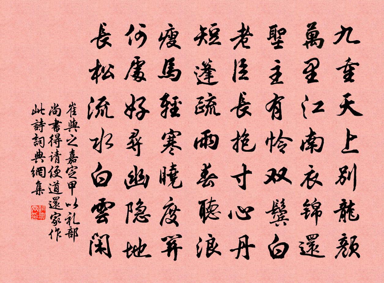 詩詞名句歷史字典書法欣賞書法字典國語詞典說文解字康熙字典古漢語字典標 題 作 者 詩 句 嘉定甲以禮部尚書得請便道還家作此詩作者:崔與之 朝代:宋代原文九重天上別龍顏,萬里江南衣錦還。聖主有憐雙鬢白,老臣長抱寸心丹。短篷疏雨春聽浪,瘦馬輕寒曉度關。何處好尋幽隱地,長松流水白雲閒。詩詞問答問:《嘉定甲以禮部尚書得請便道還家作此詩》的作者是誰?答:崔與之問:該詩寫於哪個朝代?答:宋代書法欣賞嘉定甲以禮部尚書得請便道還家作此詩書法作品詩詞推薦送人南遊釋智圓〔宋代〕難阻南遊興,酣歌出故林。路分滄海闊,山疊瘴雲深。馬援碑寧在,重華廟可尋。他年卻歸此,閒話學夷音。題蓮華寺黃庭堅〔宋代〕狂卒猝起金坑西,脅從數百馬百蹄。所過州縣不敢誰,肩輿擄載三十妻。伍生有膽無智略,謂河可馮虎可搏。身膏古意唐士恥〔宋代〕天公與世人,幽明分懸隔。無口難得言,欲言但以臆。以臆或未喻,寄之夜檐滴。懇款語世人,世人還不識。無夢令侯善淵〔元代〕地水火風四大。為你百端為害。逐便各別離,遣我法身輕快。自在。自在。攝化超靈三界。馬上口占三絕鄭剛中〔宋代〕露濃紅透棠梨葉,風緊落疏蕎麥花。馬首漸東京洛近,小寒無用苦思家。相和歌辭。子夜四時歌六首。冬歌二首郭元振〔唐代〕北極嚴氣升,南至溫風謝。調絲競短歌,拂枕憐長夜。帷橫雙翡翠,被卷兩鴛鴦。婉態不自得,宛轉君王床。煙江疊嶂范成大〔宋代〕太湖嵌根藏洞宮,槎牙石生奫淪中。波濤投隙漱且囓,歲久缺罅深重重。水空發聲夜鏜鈶,中有晴江煙嶂疊。誰歟何正言母安人輓詩洪咨夔〔宋代〕鳳采生丹穴,螢光聚絳幃。兩登黃甲去,一佩皂囊歸。萱老悲方切,蘭枯夢又非。青山秋寂歷,客淚不勝揮。行雲歐陽修〔宋代〕疊疊煙波隔夢思,離愁幾日減要圍。行雲自亦傷無定,莫就行雲托信歸。和韓子云見寄二首吳芾〔宋代〕投紱歸來意適然,從今免詠式微篇。但令晚歲胸中適,安用虛名身後傳。顧我只宜乘載月,如君端合上凌煙。功成過明叔有詩次韻趙蕃〔宋代〕出門無所詣,引興獨茲長。萬事一杯酒,三春百草芳。暇能過巷隱,痴豈累官忙。久坐疑成晚,樵歸漁返鄉。秋夜耿湋〔唐代〕高秋夜分後,遠客雁來時。寂寞重門掩,無人問所思。送夔師楊校書解印還鄉二首項安世〔宋代〕清秋丹鳳不蓬萊,驚倒瞿唐灩澦堆。監國入堂催議事,相公開館夢翹材。未甘直上青雲上,更欲斜飛錦水回。一片惟初釋文珦〔宋代〕惟初結髮時,志氣凌蒼昊。飄然去園廬,名山縱幽討。流光暗相催,於今已衰老。滿眼皆少年,誰堪寫懷抱。潛蹤班婕妤崔道融〔唐代〕寵極辭同輦,恩深棄後宮。自題秋扇後,不敢怨春風。入山謁怡然上人因成短篇皆書即時事強至〔宋代〕行穿六松陰,鳥語逢人寂。林僧洗山缽,正了寒堂食。揖我喜滿顏,吟窗半軒闢。鳳凰不無情,天外送佳色。春風逍遙詠宋太宗〔宋代〕還源根本杳難窮,秘密玄微造化中。白日昏迷常不見,青龍霧曉大家同。陰陽青里和煙碧,天地相鮮似火紅。直要謁張果先生李頎〔唐代〕先生穀神者,甲子焉能計。自說軒轅師,於今幾千歲。寓游城郭里,浪跡希夷際。應物雲無心,逢時舟不系。餐霞垂柳李商隱〔唐代〕垂柳碧鬅茸,樓昏雨帶容。思量成夜夢,束久廢春慵。梳洗憑張敞,乘騎笑稚恭。碧虛隨轉笠,紅燭近高舂。怨目明發曲坑二首楊萬里〔宋代〕雲橫平野近人低,似縠如紗只隔溪。行到溪東元不見,回頭卻復在溪西。名句推薦君馬黃,我馬白。李白《君馬黃》 霜草蒼蒼蟲切切,村南村北行人絕。白居易《村夜》 家童掃蘿徑,昨與故人期。錢起《谷口書齋寄楊補闕》 月既不解飲,影徒隨我身。李白《月下獨酌四首·其一》 綴玉聯珠六十年,誰教冥路作詩仙。李忱《吊白居易》 人不閒,勿事攪。人不安,勿話擾。李毓秀《弟子規·泛愛眾》 百川東到海,何時復西歸?佚名《長歌行》 人情送匹馬,買賣不饒針!佚名《增廣賢文·下集》 力田已告成,計日宜收藏。黃燮清《秋日田家雜詠》 半溪流水綠,千樹落花紅。車萬育《聲律啟蒙·上卷·一 東》