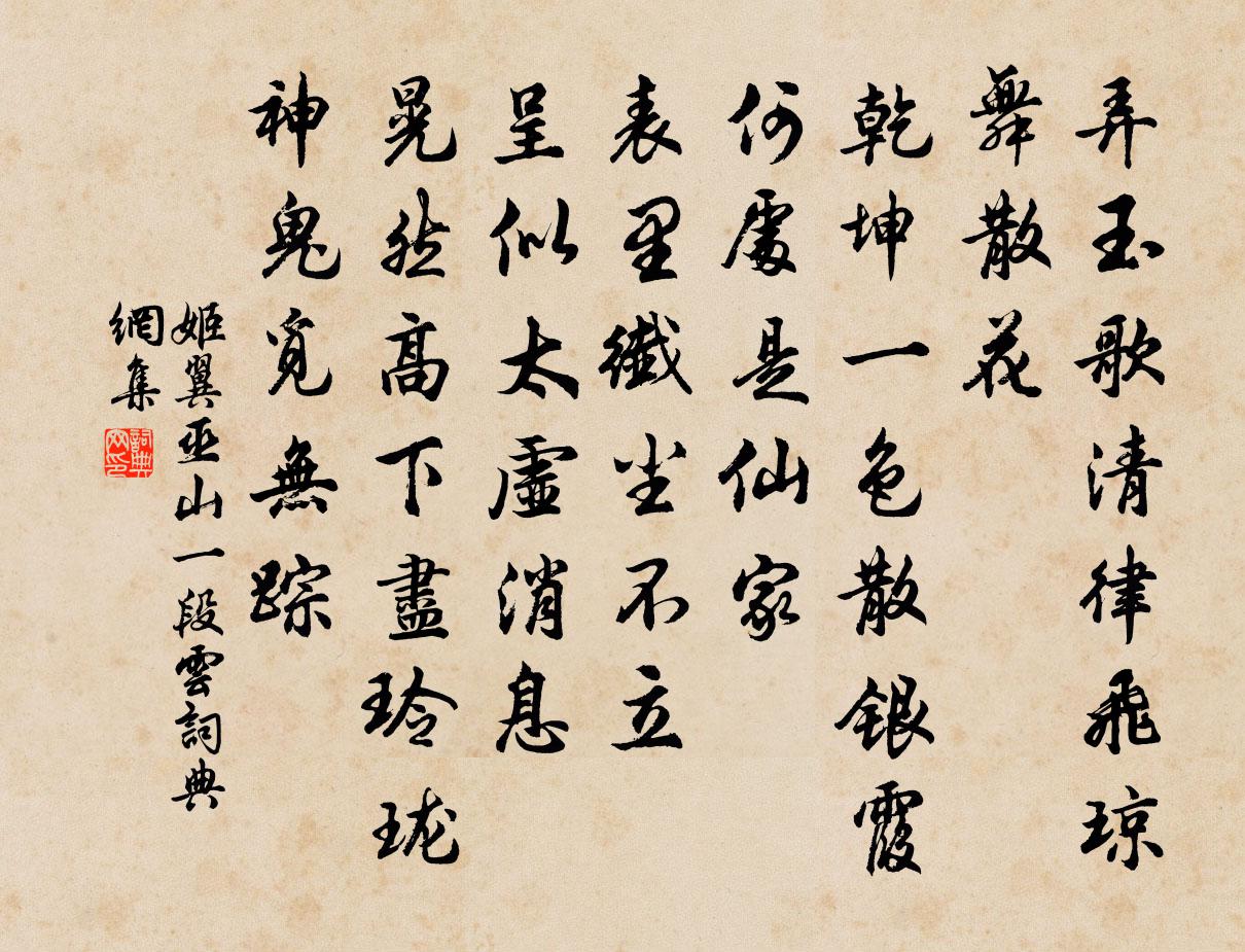 詩詞名句歷史字典書法欣賞書法字典國語詞典說文解字康熙字典古漢語字典標 題 作 者 詩 句 巫山一段雲作者:姬翼 朝代:元代巫山一段雲原文弄玉歌清律,飛瓊舞散花。乾坤一色散銀霞。何處是仙家。表里纖塵不立。呈似太虛訊息。晃然高下盡玲瓏。神鬼覓無蹤。詩詞問答問:巫山一段雲的作者是誰?答:姬翼問:巫山一段雲寫於哪個朝代?答:元代問:巫山一段雲是什麼體裁?答:詞姬翼巫山一段雲書法欣賞巫山一段雲書法作品詩詞推薦殢人嬌(王都尉席上贈侍人)蘇軾〔宋代〕滿院桃花,儘是劉郎未見。於中更、一枝纖軟。仙家日月,笑人間春晚。濃睡起,驚飛亂紅千片。密意難傳,羞容正月九日微雪二首趙蕃〔宋代〕霰雪纖纖晚倍寒,梅花清瘦不 * 。小園準擬尋詩去,少待侵苔屐齒乾。與崔二十一游鏡湖寄包賀二公孟浩然〔唐代〕試覽鏡湖物,中流見底清。不知鱸魚味,但識鷗鳥情。帆得樵風送,春逢穀雨晴。將探夏禹穴,稍背越王城。府掾步桐台詩江淹〔南北朝〕客子畏霜雪。憂至竟悠哉。綺帷生網羅。寶刀積塵埃。思君出漢北。鞍馬登楚台。歲彩合雲光。平原秋色來。寂聽題君子亭廖行之〔宋代〕疏池種瓊瑤,築屋看雲錦。愛渠花種賢,佳處心自領。我愛池中花,花中有君子。相看亭上人,其人亦如是。行香子 京山道中宋褧〔元代〕竹院松庭。犬吠雞鳴。被田家、畫出昇平。園林掩映,鞍馬經行。悵暮天低,寒日澹,曉風輕。浮世浮名。役使神秦樓月蒲道源〔元代〕皇都曉。堯階奉引瞻天表。瞻天表。麒麟不動,御香輕梟。電光曾記樞星繞。昇平自此開先兆。開先兆。堯天日月秋雨嘆陸游〔宋代〕淙淙雨聲瀉高秋,稻粱浸瀾雨不休。志士仁人萬行淚,孤臣孽子無窮憂。一身窮困未暇恤,如此無事理有不?聖言六月晦日同樓少府由錢塘門至上竺遂游下中竺喻良能〔宋代〕聯輿緩步踏蔥蒼,十里荷香雜稻香。庚暑此時無一點,秋風明月灑長廊。林間岩洞侵衣潤,水際亭台徹骨涼。何處古風一首送常明仲還里社吳潛〔宋代〕韙軒吾石友,相從三十年。舌本多文獻,胸笥皆簡編。脊樑硬於鐵,雖貧不言錢。古井波愈靜,老乾骨尤堅。眨眼哭芸居胡仲弓〔宋代〕錦囊方絡繹,忽報殞吟身。泉壤悲千古,江湖少一人。病懷詩眷屬,醫欠藥君臣。脂嶺西風急,興思暗愴神。江南雜詠陳維崧〔清代〕雞狗騷然,朝驚北陌暮南阡。印響西風猩作記,如鬼,老券排家驗鈐尾。送朱制乾象祖文天祥〔宋代〕一官聱漫任如何,屢疏箋天氣不磨。宋祚萬年陳大計,周圖五字訂前訛。重尋范老憂時箸,旁豎文公衛道戈。投匭紹興十三年發皇后冊寶十三首佚名〔宋代〕天子當陽,群工就列。冊寶既陳,鐘鼓德設。上公奉事,容莊心協。克相盛禮,光昭玉牒。次韻何文縝墨梅二絕張子文〔宋代〕仙衣雲樣拂輕緇,林下神情特地宜。妒婦津頭風恐急,壞妝聊為變冰姿。武夷山仙城徐凝〔唐代〕武夷無上路,毛徑不通風。欲共 * 住,仙城半在空。花犯 詠梅周邦彥〔宋代〕粉牆花低,梅花照眼花,依然舊風味。露痕輕綴。疑淨洗鉛華,無限佳麗。去年勝賞曾孤倚,冰盤共燕喜。更可惜五言夜集聯句顏真卿〔唐代〕寒花護月色,墜葉占風音。 ——皎然茲夕無塵慮,高雲共片心。 ——顏真卿成都蕭遘〔唐代〕月曉已開花市合,江平偏見竹簰多。好教載取芳菲樹,剩照岷天瑟瑟波。句方公權〔宋代〕一身擔得烏山起,雙手拿將龍□歸。名句推薦雲來山更佳,雲去山如畫。張養浩《雁兒落兼得勝令》 君子反道以修德;正德以出樂;和樂以成順。呂不韋《呂氏春秋·紀·季夏紀》 雍雍新雁咽寒聲,愁恨年年長相似。李煜《謝新恩·冉冉秋光留不住》 柳絮風輕,梨花雨細。謝逸《踏莎行·柳絮風輕》 君寵益嬌態,君憐無是非。王維《西施詠》 春山暖日和風,闌乾樓閣簾櫳,楊柳鞦韆院中。白樸《天淨沙·春》 菱葉縈波荷颭風,荷花深處小船通。白居易《採蓮曲》 水至清則無魚,人至察則無徒。班固《漢書·傳·東方朔傳》 當場不論,過後枉然。佚名《增廣賢文·下集》 青春花姊不同時。淒涼生較遲。吳文英《醉桃源·芙蓉》