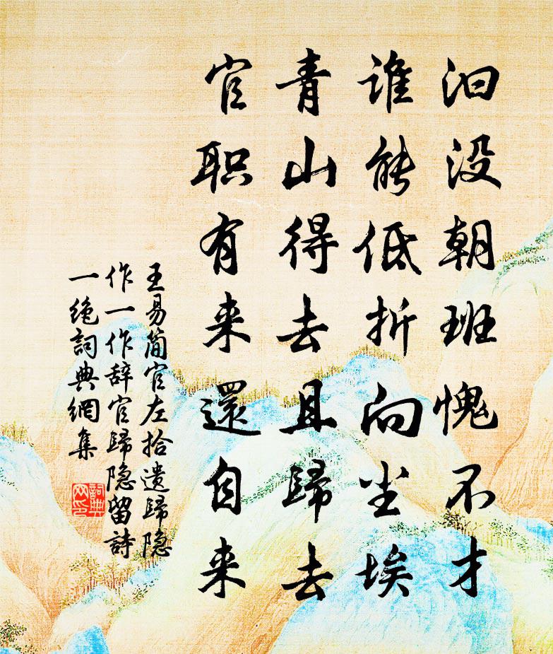詩詞名句歷史字典書法欣賞書法字典國語詞典說文解字康熙字典古漢語字典標 題 作 者 詩 句 官左拾遺歸隱作(一作辭官歸隱,留詩一絕)作者:王易簡 朝代:宋代原文汩沒朝班愧不才,誰能低折向塵埃。青山得去且歸去,官職有來還自來。詩詞問答問:《官左拾遺歸隱作(一作辭官歸隱,留詩一絕)》的作者是誰?答:王易簡問:該詩寫於哪個朝代?答:宋代問:該詩是什麼體裁?答:七絕書法欣賞官左拾遺歸隱作(一作辭官歸隱,留詩一絕)書法作品注釋全唐詩:卷734-12詩詞推薦再病書懷呈仲良楊萬里〔宋代〕功名銷盡向來心,詩酒從今也不禁。夜雨遣人歸思動,不知湘水幾篙深。憶人人/鵲橋仙佚名〔宋代〕前村深雪,難尋幽艷,無奈清香漏綻。煙梢霜萼出牆時,似暗妒、壽陽妝面。幽香浮動,無緣攀賞,但只心勞魂亂鵲橋仙(二色蓮)趙彥端〔宋代〕藕花亭上,無塵無暑,灩灩一池秋韻。綠羅寶蓋碧瓊竿,翠浪里、亭亭月影。一家姊妹,兩般梳洗,濃淡施朱傅粉題黃居寀秋山圖徐光溥〔唐代〕天與黃筌藝奇絕,筆精回感重瞳悅。運思潛通造化工,揮毫定得神仙訣。秋來奉詔寫秋山,寫在輕綃數幅間。高低憶瑤姬曹組〔宋代〕雨細雲輕,花嬌玉軟,於中好個情性。爭奈無緣相見,有分孤零。香箋細寫頻相問。我一句句兒都聽。到如今,不岳王墳唐順之〔明代〕國恥猶未雪,身危亦自甘。九原人不返,萬壑氣長寒。豈恨藏弓早,終知借劍難。吾生非壯士,於此發衝冠。海仙花詩王禹偁〔宋代〕一堆絳雪壓春叢,嫋嫋長條弄曉風。借問開時何所似,似將繡被覆薰籠。偈二首釋彌光〔宋代〕夢幻空花,何勞把捉。得失是非,一時放卻。齊天樂 薊門寒食朱唏顏〔元代〕青煙一夜傳宮燭,朝來管弦都試。寶扇傳歌,銀瓶索酒,柳下驕驄曾系。憐紅嫵翠。任栲栳量珠,伴春俱醉。不道清平樂(嘲人)戴復古〔宋代〕醉狂痴作。誤信青樓約。酒醒梅花吹畫角。翻得一場寂寞。相如謾賦凌雲。琴台不遇文君。江上琵琶舊曲,只堪分春雪二首張耒〔宋代〕春雲驕不行,凍雨作飛雪。夜深歸無燭,已覺馬蹄滑。那知事未已,通夕注不歇。堂寒曉附火,檐滴更清絕。前者送曾德邁歸寧宜春曹鄴〔唐代〕湘東山水有清輝,袁水詞人得意歸。幾府爭傳毛義檄,一鄉看侍老萊衣。筵開灞岸臨清淺,路去藍關入翠微。想到郊廟歌辭。享先農樂章。鹹和佚名〔唐代〕三推禮就,萬庾祈凝。夤賓志遠,藨袞惟興。降歆肅薦,垂祐祗膺。送神有樂,神其上升。靜觀堂十偈汪晫〔宋代〕有時檢點舊閒游,出岫行雲野渡舟。驀地靜中訊息好,夕陽西下水東流。鵲橋仙(歸舟過六和塔)趙師俠〔宋代〕風波平地,塵埃撲面,總是爭名競利。悟時不必苦貪圖,但言任、流行坎止。忽來忽去,何榮何辱,天也知人深意游普向十首陳造〔宋代〕西湖西岸三百寺,一一題名嗟未能。他日誅茅追勝賞,卻尋詩版驗吾曾。偈頌三十六首釋如珙〔宋代〕群陰欲去未去之際,一陽欲來未來之時。樓上鐘鳴,堂前鼓響,凡聖交參,一期事畢。次韻劉養源見寄高斯得〔宋代〕咨余暮齒依蒲柳,見君無門慚九九。小臣久去孔鸞庭,太史曾供牛馬走。忽聞妖彗出不虞,天子驚惶下手書。孤忠歐陽新卿賦薇藥張明中〔宋代〕東皇又罷調春手,花飛十不啻 * 。不論韋曲與少城,卸盡錦機忍回首。唯餘芍藥不攙先,卻與薔薇相爭妍。小欄意難忘張炎〔宋代〕風月吳娃。柳陰中認得,第二香車。春深妝減艷,波轉影流花。鶯語滑,透紋紗。有低唱人夸。怕誤卻,周郎醉眼名句推薦半天涼月色,一笛酒人心。袁枚《夜過借園見主人坐月下吹笛》 若言言悅耳,事事快心,便把此生埋在鴆毒中矣。洪應明《菜根譚·概論》 故園東望路漫漫,雙袖龍鍾淚不乾。岑參《逢入京使》 酒意詩情誰與共?淚融殘粉花鈿重。李清照《蝶戀花·暖雨晴風初破凍》 山遠翠眉長。高處淒涼。菊花清瘦杜秋娘。吳文英《浪淘沙·九日從吳見山覓酒》 人刑者非人也,罰人者非罰也。來俊臣《羅織經·刑罰卷第十一》 平明尋白羽,沒在石棱中。盧綸《和張僕射塞下曲六首》 閉門覓句陳無己,對客揮毫秦少游。黃庭堅《病起荊江亭即事》 妝罷低聲問夫婿,畫眉深淺入時無。朱慶餘《近試上張籍水部 / 近試上張水部 / 閨意獻張水部》 嘆息聊自思,此生豈我情。王績《石竹詠》