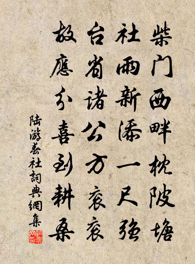 詩詞名句歷史字典書法欣賞書法字典國語詞典說文解字康熙字典古漢語字典標 題 作 者 詩 句 春社作者:陸游 朝代:宋代春社原文柴門西畔枕陂塘,社雨新添一尺強。台省諸公方袞袞,故應分喜到耕桑。詩詞問答問:春社的作者是誰?答:陸游問:春社寫於哪個朝代?答:宋代問:陸游的名句有哪些?答:陸游名句大全陸遊春社書法欣賞春社書法作品詩詞推薦綺寮怨·上馬人扶殘醉周邦彥〔宋代〕上馬人扶殘醉,曉風吹未醒。映水曲、翠瓦朱檐,垂楊里、乍見津亭。當時曾題敗壁,蛛絲罩、淡墨苔暈青。念去廣寒游趙汝鐩〔宋代〕九秋半矩月團團,瓊瑤世界夜氣寒。羽士躍身導阿瞞,麾斥八極青雲端。老柯擲桂香不死,銀橋跨空一萬里。飛步壽致政徐光祿趙汝騰〔宋代〕易躋廿四中書考,難聚三千聽講生。入侍親庭為一笑,方瞳弘景轉精神。【雙調】風入松_翠樓紅袖倒佚名〔元代〕翠樓紅袖倒金壺,春色滿皇都。夜闌地燒銀燭,那其間多少歡娛。薄利虛名間阻,俏風格以此消疏。 【喬牌對酒勸令公開春遊宴白居易〔唐代〕時泰歲豐無事日,功成名遂自由身。前頭更有忘憂日,向上應無快活人。自去年來多事故,從今日去少交親。宜須庚子年還朝飲酒絕句韓駒〔宋代〕三年逐客臥江皋,自與田翁酌小槽。飲慣茅柴諳苦硬,不知如蜜有香醪。楊柳枝詞二首皇甫松〔唐代〕爛漫春歸水國時,吳王宮殿柳絲垂。黃鶯長叫空閨畔,西子無因更得知。春入行宮映翠微,玄宗侍女舞菸絲。如今永新賀升卿著春秋會正論屢督跋戲往周必大〔宋代〕三傳名家各是非,聖經元自許傳疑。遲遲著語君知否,游夏猶難措一辭。感秋六首鄭獬〔宋代〕軒軒蒼角鷹,殺氣凌高秋。一息一萬里,獨與長風游。獵騎走霹靂,落臂無虛投。古冢白鼻狐,立死不得留。飛霜眼兒媚·平沙芳草渡頭洪咨夔〔宋代〕平沙芳草渡頭村。綠遍去年痕。遊絲下上,流鶯來往,無限銷魂。綺窗深靜人歸晚,金鴨水沈溫。海棠影下,子規戲成白髮二首張鎡〔宋代〕怕見人言老,梳頭夜二更。誰知燈燭夜,漏逗愈分明。挽水心先生二首劉克莊〔宋代〕一夢孝皇初,恓然四紀餘。國人莫知我,天下孰宗予。散地雖無柄,名山盡有書。烏虖傳萬世,猶足矯玄虛。偈頌三十八首釋如淨〔宋代〕結夏已過了,解夏猶未來。中間一句子,蓮花照水開。因甚落草止啼,元只為嬰孩。偈頌二百零五首釋正覺〔宋代〕不居功,不合半,脫體其間過一遍。夢覺船浮明月波,眼寒雪擁蘆華岸。吏隱宜春郡詩十首祖無擇〔宋代〕吏隱宜春郡,閒思應舉時,端居苦貧賤,徒步入京師。誤寵乘軒鶴,均憂入廟犧。功名在何許,雙鬢已垂絲。大雷雨方岳〔宋代〕黑雲壓山雨如鏃,霹靂火光龍起陸。四壁淋漓風撼屋,一窗寒燈臥空谷。龍簡龍簡盍歸來,先生床濕生青苔。未識經耒陽杜工部墓羅隱〔唐代〕紫菊馨香覆楚醪,奠君江畔雨蕭騷。旅魂自是才相累,閒骨何妨冢更高。騄驥喪來空蹇蹶,芝蘭衰後長蓬蒿。屈原不寐姜特立〔宋代〕老人夜不瞑,宿鳥未安棲。送睡馮杯酒,思晨聽曉雞。分蜂於石〔宋代〕群蜂割據作生涯,戶牖新開蜜釀花。漢世侯王自分國,秦民父子各當家。尊卑兩盡君臣義,朝夕爭趨南北衙。因感早秋龍興寺江亭閒眺憶龍門山居寄崔張舊從事(宜春作)李德裕〔唐代〕江亭感秋至,蘭徑悲露泫。粳稻秀晚川,杉松郁晴巘。嗟予有林壑,茲夕念原衍。綠筱連嶺多,青莎近溪淺。淵明名句推薦誠信者,天下之結也。管仲《管子·樞言》 仁義禮善之於人也,辟之若貨財粟米之於家也。荀子《荀子·大略》 黃埃散漫風蕭索,雲棧縈紆登劍閣。白居易《長恨歌》 留連光景惜朱顏,黃昏獨倚闌。李煜《阮郎歸·呈鄭王十二弟》 世間花葉不相倫,花入金盆葉作塵。李商隱《贈荷花》 無言暗將紅淚彈。闌珊,香銷輕夢還。納蘭性德《河傳·春淺》 喜遇重陽,更佳釀今朝新熟。宋江《滿江紅·喜遇重陽》 造物無言卻有情,每於寒盡覺春生。張維屏《新雷》 胭脂淚,相留醉,幾時重。李煜《相見歡·林花謝了春紅》 接漢疑星落,依樓似月懸。盧照鄰《十五夜觀燈》