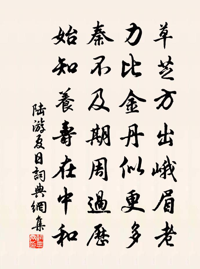 詩詞名句歷史字典書法欣賞書法字典國語詞典說文解字康熙字典古漢語字典標 題 作 者 詩 句 夏日作者:陸游 朝代:宋代夏日原文草芝方出峨眉老,力比金丹似更多。秦不及期周過歷,始知養壽在中和。詩詞問答問:夏日的作者是誰?答:陸游問:夏日寫於哪個朝代?答:宋代問:陸游的名句有哪些?答:陸游名句大全陸游夏日書法欣賞夏日書法作品詩詞推薦鶴林寺馮多福〔宋代〕春郊躬勸相,稅駕擬禪關。院古深藏竹,堂虛淨對山。日曛農父醉,雲伴老僧閒。暇日還攜茗,同來淪虎斑。晚出昇州門王同祖〔宋代〕晚驅贏馬出東城,過盡三崗路卻平。村店夜深人語靜,隔橋風遞暗潮聲。和顏長官百詠城市朱繼芳〔宋代〕山人只合住山中,入得城來調不同。滿面紅塵無處避,手攜白羽障西風。送韓十四江東省覲杜甫〔唐代〕兵戈不見老萊衣,嘆息人間萬事非。我已無家尋弟妹,君今何處訪庭闈。黃牛峽靜灘聲轉,白馬江寒樹影稀。此別清明雨寒八首楊萬里〔宋代〕苦階滴雨翠方濃,須把寒珠濺鹿蔥。梅子猶粘雪前蕊,海棠生恨夜來風。柳絮錢惟演〔宋代〕三月江南花漸稀,春陰漠漠雪霏霏。章台街里翩輕吹,灞水橋邊送落暉。陸凱傳精梅暗落,韓憑遺恨蝶爭飛。詔書漁父詞薛師石〔宋代〕繫船蘭沚鱠長鱸,白袷方袍忽訪吾。神甚爽,貌全枯,莫是當年楚大夫。晦庵文公祠堂和令君韻袁甫〔宋代〕當年獨抱伯牙名,身後祠堂列佩衾。官職平生安義命,詩書終老惜光陰。一椽古歙溪山窟,千古長松風月林。彭令大風過彭浪磯晁補之〔宋代〕山束江窮方崒起,江盤山過卻重回。無風此水常呼洶,正用風狂水斗來。春江花月詞曹勛〔宋代〕群芳珠箔映青樓,樓上珠簾卷玉鉤。十二香衢遍羅綺,青樓和月為君愁。夜行船(詠美人)趙長卿〔宋代〕龜甲爐煙輕裊。簾櫳靜、乳鶯啼曉。拂掠新妝,時宜頭面,繡草冠兒小。衫子揉藍初著了。身材稱、就中恰好。手新燕齊己〔唐代〕棲托近佳人,應憐巧語新。風光華屋暖,弦管牡丹晨。遠采江泥膩,雙飛麥雨勻。差池自有便,敢觸杏梁塵。贈王尊師姚合〔唐代〕先生自說瀛洲路,多在青松白石間。海岸夜中常見日,仙宮深處卻無山。犬隨鶴去游諸洞,龍作人來問大還。今日君用承事載酒筠溪上分韻得竹字李彌遜〔宋代〕高荷蓋水臨風曲,美人卻扇耀紅玉。溪翁愛這看不卟,密竹陰中坐幽獨。南鄰新醅手自灑,貯以鴟夷轉山腹。折松題海棠二首李石〔宋代〕百鳥啼春樹樹紅,輕舟掠岸往來風。江南江北花多少,都在先生酒盞中。燭影搖紅(再次虛齋先生梅詞韻)張榘〔宋代〕春小寒輕,南枝一夜陽和轉。東君先遞玉麟香,冷蕊幽芳滿。應把朱簾暮卷。更何須、金猊煙暖。千山月淡,萬里偈頌七十六首釋師觀〔宋代〕一日不作,一日不食。木平搬土,石霜泥壁。范山斷足,仰山作息。澄翠門下,朝朝入室。如上所供,並皆詣實。雙頭蓮(雙調)周邦彥〔宋代〕一抹殘霞,幾行新雁,天染雲斷,紅迷陣影,隱約望中,點破晚空澄碧。助秋色。門掩西風,橋橫斜照,青翼未來喜錢左丞再除華州以詩伸賀白居易〔唐代〕左轄輟中台,門東委上才。彤襜經宿到,絳帳及春開。民望懇難奪,天心慈易回。那知不隔歲,重借寇恂來。荔枝堂夕眺三首楊萬里〔宋代〕夕峰褪日半鉦多,秋漢吹雲一絮過。寂寂庭松今兩月,鶴雛去盡只留窠。名句推薦初聞征雁已無蟬,百尺樓高水接天。李商隱《霜月》 隔水氈鄉,落日牛羊下,區脫縱橫。張孝祥《六州歌頭·長淮望斷》 到家應是,童稚牽衣,笑我華顛。吳激《訴衷情·夜寒茅店不成眠》 悲莫悲生離別,樂莫樂新相識,兒女古今情。辛棄疾《水調歌頭·壬子三山被召陳端仁給事飲餞席上作》 等閒識得東風面,萬紫千紅總是春。朱熹《春日》 想文君望久,倚竹愁生步羅襪。姜夔《八歸·湘中送胡德華》 鎮日思歸歸未得,孤負殷勤杜宇。王瀾《念奴嬌·避地溢江書於新亭》 楚水巴山江雨多,巴人能唱本鄉歌。劉禹錫《竹枝詞二首·其二》 春來茗葉還爭白,臘盡梅梢盡放紅。韓元吉《送陸務觀福建提倉》 感之欲嘆息,對酒還自傾。李白《春日醉起言志》