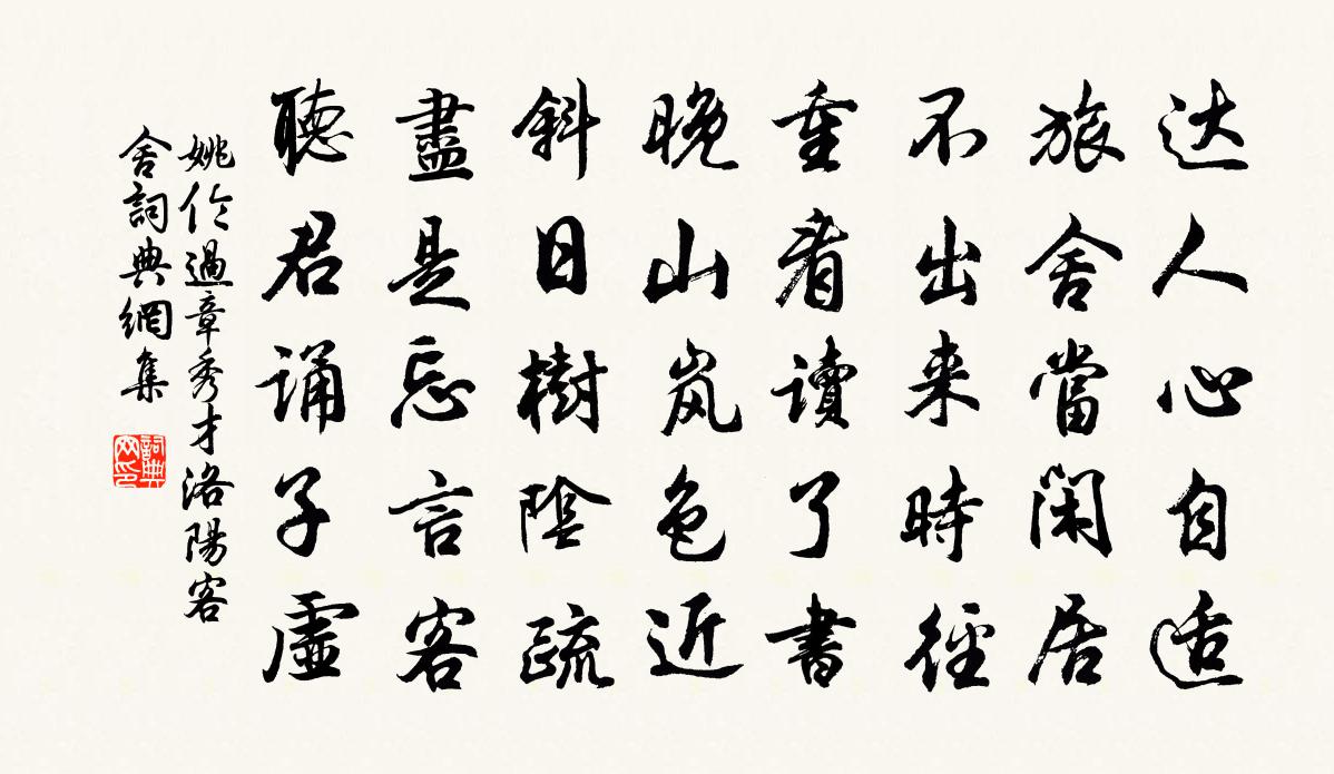詩詞名句歷史字典書法欣賞書法字典國語詞典說文解字康熙字典古漢語字典標 題 作 者 詩 句 過章秀才洛陽客舍作者:姚倫 朝代:唐代過章秀才洛陽客舍原文達人心自適,旅舍當閒居。不出來時徑,重看讀了書。晚山嵐色近,斜日樹陰疏。儘是忘言客,聽君誦子虛。詩詞問答問:過章秀才洛陽客舍的作者是誰?答:姚倫問:過章秀才洛陽客舍寫於哪個朝代?答:唐代問:過章秀才洛陽客舍是什麼體裁?答:五律姚倫過章秀才洛陽客舍書法欣賞過章秀才洛陽客舍書法作品注釋全唐詩:卷272_11詩詞推薦浣溪沙·天碧羅衣拂地垂歐陽炯〔五代〕天碧羅衣拂地垂,美人初著更相宜,宛風如舞透香肌。獨坐含顰吹鳳竹,園中緩步折花枝,有情無力泥人時。奉和竇使君同恭法師詠高僧二首竺佛圖澄慧宣〔唐代〕大誓憫塗炭,乘機入生死。中州法既弘,葛陂暴亦止。乳孔光一室,掌鏡徹千里。道盛咒蓮華,災生吟棘子。埋石春盤方岳〔宋代〕萊服根松縷冰玉,蔞蒿苗肥點寒綠。霜鞭行茁軟於酥,雪樹生釘勝肉。與吾同味蔊絲辣,知我長貧韭俎熟。更蒸{寒雨中偶賦陸游〔宋代〕暮年心事與誰同?到處飄然一病翁。斷夢淒涼燈影里,殘詩零落雨聲中。莫驚顏鬢渾非昨,略數朋儕已半空。祠祿水調歌頭曹勛〔宋代〕江影浮空闊,江水拍天流。山藏地秘,偉觀須是偉人收。聞道煙斜雨暗,還留月底風邊,墨客一凝眸。闌檻隨指顧石鈞父之官火井乞詩贈行李流謙〔宋代〕君家嶙峋兩冰柱,黃塵漲天不敢污。阿雲醉臥呼不譍,斷碑零落荒阡雨。君今去作火井縣,山中嬰兒待慈母。前日卜運算元·五月八日夜鳳凰亭納涼葉夢得〔宋代〕新月掛林梢,暗水鳴枯沼。時見疏星落畫檐,幾點流螢小。歸意已無多,故作連環繞。欲寄新聲問采菱,水闊煙波和陶歸鳥吳芾〔宋代〕翩翩歸鳥,慮患徘徊。四顧萬里,獨有故棲。故棲來反,所願已諧。毋思寥廓,擾擾此懷。縱筆陸游〔宋代〕溫溫地爐紅,皎皎紙窗白。忽聞啄木聲,疑是敲門客。三姝媚 過都城舊居有感吳文英〔宋代〕湖山經醉慣。潰春衫、啼痕酒痕無限。又客長安,嘆斷襟零袂,涴塵誰浣。紫曲門荒,沿敗井、風搖青蔓。對語東滿江紅 大德己亥冬,余再至京師,聞中書掾劉敏中〔元代〕間,名聲籍籍。已而認君於王禮部博家,歲余,君篆秩滿,出尹余鄉陽丘。陽丘大縣,繁阜難治,君至,刳疣抉蠹閉戶釋文珦〔宋代〕閉戶秋風裡,寥寥絕往還。菊開無俗艷,木落見真山。心比孤蟾淨,身同野鹿閒。困來雖就枕,無夢到人間。瀟湘夜雨(和潘都曹九日詞)周紫芝〔宋代〕江繞淮城,雲昏楚觀,一枝煙笛誰橫。曉風吹帽,霜日照人明。暗惱潘郎舊恨,應追念、菊老殘英。秋空晚,茱萸滿江紅吳文英〔宋代〕翠暮深庭,露紅晚、閒花自發。春不斷、亭台成趣,翠陰蒙密。紫燕雛飛簾額靜,金鱗影轉池心闊。有花香、竹色滄海行李呂〔宋代〕滄海有船不可流,痴人求仙死不悟。兒郎斷乳能幾時,忍令萬里投蛟螭。兒牽母衣抱父泣,文書催行星火急。樓船頌古二十四首釋宗演〔宋代〕有一語,沒人知。最親切,又希奇。曉來和露看,只欠一聲啼。雜曲歌辭別離曲張籍〔唐代〕行人結束出門去,馬蹄幾時踏門路。憶昔君初納彩時,不言身屬遼陽戍。早知今日當別離,成君家計良為誰。男兒自陳適齊戲題蘇轍〔宋代〕庠齋三歲最無功,羞愧宣王祿萬鍾。猶欲談經誰覆信,相招執龠便須從。陳風清淨眠真足,齊俗強梁懶不容。久爾故比部李郎中輓歌四首楊億〔宋代〕美疢漳濱臥,營魂東岱歸。故人空瀆酒,侍史罷薰衣。盡像留家廟,銘旌出帝幾。浮生除壽考,享福似君稀。鴛鴦湖棹歌 之六十八朱彝尊〔清代〕阿儂家住秦溪頭,日長愛棹橫湖舟。沾雲寺東花已放,義婦堰南春可游。名句推薦少年辛苦終身事,莫向光陰惰寸功。杜荀鶴《題弟侄書堂》 外游者,求備於物;內觀者,取足於身。列子及其弟子《列子·仲尼》 盡日空濛無所見,雁行斜去字聯聯。韋莊《登鹹陽縣樓望雨》 在天成象,在地成形。脫脫《宋史·志·卷五十二》 前度綠陰載酒,枝頭色比舞裙同。王沂孫《慶清朝·榴花》 三杯吐然諾,五嶽倒為輕。李白《俠客行》 裊裊兮秋風,洞庭波兮木葉下。屈原《九歌·湘夫人》 馬先馴而後求良,人先信而後求能。劉安及其門客《淮南子·說林訓》 昔聞洞庭水,今上岳陽樓杜甫《登岳陽樓》 翰林風月三千首,寄與吳姬忍淚看。劉著《鷓鴣天·雪照山城玉指寒》