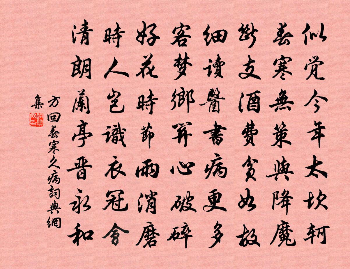 詩詞名句歷史字典書法欣賞書法字典國語詞典說文解字康熙字典古漢語字典標 題 作 者 詩 句 春寒久病作者:方回 朝代:宋代春寒久病原文似覺今年太坎軻,春寒無策與降魔。斷支酒費貧如故,細讀醫書病更多。客夢鄉關心破碎,好花時節雨消磨。時人豈識衣冠會,清朗蘭亭晉永和。詩詞問答問:春寒久病的作者是誰?答:方回問:春寒久病寫於哪個朝代?答:宋代方回春寒久病書法欣賞春寒久病書法作品詩詞推薦婺州水館重陽日作韋莊〔唐代〕異國逢佳節,憑高獨若吟。一杯今日醉,萬里故園心。水館紅蘭合,山城紫菊深。白衣雖不至,鷗鳥自相尋。挽趙秋曉葉特〔宋代〕枕竅榮名未一炊,谷陵事異賸堪悲。應嗟公子猶麟趾,無奈宗周已黍離。更恨并州同逆旅,何堪蒿里致哀詞。詩書頌古二十四首釋勝〔宋代〕握七星刀尋作者,倒司農印對冤讎。當陽一句分賓主,九曲黃河水逆流。和張器先十絕楊萬里〔宋代〕台家搜遍北山萊,傾國如君不用媒。次第幽人出空谷,鶴書即傍日邊來。次韻陳元述見寄謝茶葛立方〔宋代〕露窠那畏主林神,小摘筠籃手自親。旋轉注湯雲作腳,繽紛出磨麴為塵。睡魔已戰三竿日,詩社聊嘗一信春。不把玩溪沙王吉昌〔元代〕飲息時時藥味加。五神運起海金沙。天河仙子度靈槎。水滿金城凝露冷,人牛不見月空華。清風捧擁笑歸家。題沖沼上人院許渾〔唐代〕劚石種松子,數根侵杳冥。天寒猶講律,雨暗尚尋經。小殿燈千盞,深爐水一瓶。碧雲多別思,休到望溪亭。宿孔野雲丹房湯漢〔宋代〕天師煉丹時,丹鼎見龍虎。丹成天師去,龍虎名萬古。溪深松杪風,山明夜來雨。雨後丹鳳鳴,風前黃鵠舉。犬鳶白居易〔唐代〕晚來天氣好,散步中門前。門前何所有,偶睹犬與鳶。鳶飽凌風飛,犬暖向日眠。腹舒穩貼地,翅凝高摩天。上無薛景石兄弟問詩於徐道暉請使行質以子錢畀之葉適〔宋代〕彈九舊是吟邊物,珠走錢流義自通。認得徐家生活句,新來欄典諱詩窮。重題八詠樓姜特立〔宋代〕每到樓中憶沈郎,碑間文字爛生光。四時山色藏煙雨,兩派波光下夕陽。湛輩僅能登峴首,召南元自愛甘棠。英流東畿舟居阻雪懷寄二三知舊三首之二賀鑄〔宋代〕寒洛未澌結,東趨江海深。舟人驚朝鼓,歛繂逗長林。林端落滯雪,沙際起鳴禽。病客坐長嘆,攝衣涕流襟。親朋曉晴孫應時〔宋代〕短髮日夜白,年華令我愁。平生幾蠟屐,舊隱一漁舟。漫有詩陶寫,應須酒拍浮。相過慰情素,數肯抱琴不。獨坐敬亭山李白〔唐代〕眾鳥高飛盡,孤雲獨去閒。相看兩不厭,只有敬亭山。瑞龍吟(壽吳丞相·壽詞)陳允平〔宋代〕雙溪墅。重見種玉鋤雲,採花研露。遙知綠野芳濃,錦堂燕子,迎門共舞。近前語。還問去年山館,舊經行處。西留春令晏幾道〔宋代〕採蓮舟上,夜來陡覺,十分秋意。懊惱寒花暫時香,與情淺、人相似。玉蕊歌清招晚醉,戀小橋風細。水濕紅裙酒室思徐幹〔魏晉〕人靡不有初,想君能終之。別來歷年歲,舊恩何可期。重新而忘故,君子所尤譏。寄身雖在遠,豈忘君須臾。既厚群鶴詠蕭道成〔南北朝〕八風儛遙翮,九野弄清音。一摧雲間志,為君苑中禽。花庵獨坐司馬光〔宋代〕荒園才一畝,意足已為多。雖不居丘壑,常如隱薜蘿。忘機林鳥下,極目塞鴻過。為問市朝客,紅塵深幾何。賦石廩峰張栻〔宋代〕巋然高廩倚晴天,獨得佳葉自古傳。多謝山中出雲氣,人間長與作豐年。名句推薦今夜偏知春氣暖,蟲聲新透綠窗紗。劉方平《夜月 / 月夜》 風風雨雨梨花,窄索簾櫳,巧小窗紗。喬吉《折桂令·客窗清明》 陽關萬里道,不見一人歸。庾信《重別周尚書》 春風十里揚州路,卷上珠簾總不如。杜牧《贈別》 晚風收暑,小池塘荷淨。劉光祖《洞仙歌·荷花》 掛席幾千里,名山都未逢。孟浩然《晚泊潯陽望廬山》 日照新妝水底明,風飄香袂空中舉。李白《採蓮曲》 教小兒宜嚴,嚴氣足以平躁氣王永彬《圍爐夜話·第八則》 明月何皎皎,照我羅床幃。佚名《明月何皎皎》 驕奢淫逸,所自邪也。左丘明《左傳·隱公·隱公三年》