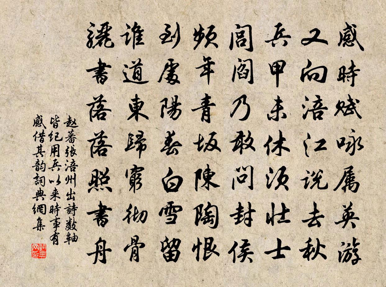 詩詞名句歷史字典書法欣賞書法字典國語詞典說文解字康熙字典古漢語字典標 題 作 者 詩 句 張涪州出詩數軸皆紀用兵以來時事有感借其韻作者:趙蕃 朝代:宋代原文感時賦詠屬英游,又向涪江說去秋。兵甲未休須壯士,閭閻乃敢問封侯。頻年青坂陳陶恨,到處陽春白雪留。誰道東歸窮徹骨,驪書落落照書舟。詩詞問答問:《張涪州出詩數軸皆紀用兵以來時事有感借其韻》的作者是誰?答:趙蕃問:該詩寫於哪個朝代?答:宋代書法欣賞張涪州出詩數軸皆紀用兵以來時事有感借其韻書法作品詩詞推薦劍篇次元汝功韻郭印〔宋代〕陽金為魂陰為魄,百鍊寧容垢膩蝕。出匣風雲凜凜寒,觀者堵牆皆辟易。發硎利刃思一試,佩刀匕首都棄置。鯨鯢自金山放船至焦山蘇軾〔宋代〕金山樓觀何眈眈,撞鐘擊鼓聞淮南。焦山何有有修竹,採薪汲水僧兩三。雲霾浪打人跡絕,時有沙戶祈春蠶。我來鄭子仁生朝項安世〔宋代〕萬紫千紅變綠時,高門廣路繡弧垂。梅梢暗結和羹實,蠶簇初抽演綍絲。首占夏時天已許,名喧春牓世方知。家傅偈頌七十八首釋正覺〔宋代〕聲色見聞鬧浩浩,怡似兒時鬥百草。兩家拈出一般般,相對無言點頭笑。仲秉再用前韻為梅解嘲復和之張栻〔宋代〕東君豈是結新知,誰共群芳較疾遲。不但一花高一世,更看嘉實滿青枝。謝公像曾極〔宋代〕失喜向來因折屐,含悲今日為聞箏。人間悲喜何時了,攜伎東山載酒行。書上元夜遊蘇軾〔宋代〕 己卯上元,予在儋州,有老書生數人來過,曰:“良月嘉夜,先生能一出乎?”予欣然從之。步城西,入僧舍送裴宣城上元所居李嘉祐〔唐代〕水流過海稀,爾去換春衣。淚向檳榔盡,身隨鴻雁歸。草思晴後發,花怨雨中飛。想到金陵渚,酣歌對落暉。雞鳴歌佚名〔〕東方欲明星爛爛,汝南晨雞登壇喚。曲終漏盡嚴具陳,月沒星稀天下旦。千門萬戶遞魚鑰,宮中城上飛烏鵲。河冰稍解喜呈王適蘇轍〔宋代〕留滯江湖白髮生,西歸猶苦凍崢嶸。春風未到冰先解,河水初深船自輕。去國偶然經畫夢,逢人稍欲問都城。羈鴻沁園春吳勢卿〔宋代〕碧瓦霜融瓦,繡閣寒瓦經,春浮瓦壽杯。羨華年七帙,人生稀有,新陽七日,天意安排。丹鳳門開,黃麾仗立,此句勾台符〔宋代〕胚渾鑿開元精結,三十六峰排截嶭。送劉散員同賦陳思王詩遊人久不歸(一作賀朝或賀朝清)劉孝孫〔唐代〕鄉關渺天末,引領悵懷歸。羈旅久淫滯,物色屢芳菲。稍覺私意盡,行看蓬鬢衰。如何千里外,佇立沾裳衣。仁宗皇帝輓詩十首文同〔宋代〕徇速承王后,聰明復辟初。恩波同海浸,刑網比天疏。屢有搜賢詔,曾無諫獵書。惟余封禪事,應恨缺蒲車。山中秋曉蒲壽宬〔宋代〕命策空山風露冷,野花無數不知名。林叢深處無人問,時吐秋芬一樣清。同諸友城南張園賞梅十首邵雍〔宋代〕紅日墜時情更切,玉山頹處興還深。攀條時揀繁枝折,不插滿頭辜此心。禽言十詠百舌姚勉〔宋代〕百禽巧作百種音,一禽卻學百種禽。晴風暖日意自樂,圓吭變換皆清吟。多能不如止一得,多言不如止一獸。一朝三月二十日游南台賀鑄〔宋代〕晴春六十日,不與酒杯親。吏事豈無閒,風雨復兼旬。始作南城游,時物固已陳。掃不見桃李,濃綠迷荊榛。登高次韻高龍洲入道陳深〔宋代〕軒車絕華念,野服遂幽情。白鷺臨溪逈,玄蟬餘露清。棄家師季偉,蒔藥友通明。且結煙念客,誰論世上名。盧十五竹亭送侄偁歸山楊衡〔唐代〕落葉寒擁壁,清霜夜沾石。正是憶山時,復送歸山客。殷勤一尊酒,曉月當窗白。名句推薦冷冷水向橋東去。漠漠雲歸溪上住。劉鎮《玉樓春·東山探梅》 夜寒不近流蘇,只憐他、後庭梅瘦。毛滂《上林春令·十一月三十日見雪》 敗垣芳草,空廊落葉,深砌蒼苔。徐再思《人月圓·甘露懷古》 莫辭酒味薄,黍地無人耕。杜甫《羌村三首·其三》 但使龍城飛將在,不教胡馬度陰山。王昌齡《出塞二首》 桃花落,閒池閣。山盟雖在,錦書難托。陸游《釵頭鳳·紅酥手》 君思潁水綠,忽復歸嵩岑。李白《送裴十八圖南歸嵩山二首》 右手畫圓,左手畫方,不能兩成。韓非及後人《韓非子·功名》 別有根芽,不是人間富貴花。納蘭性德《採桑子·塞上詠雪花》 且夫義者,政也。無從下之政上,必從上之政下。墨子《墨子·26章 天志(上)》