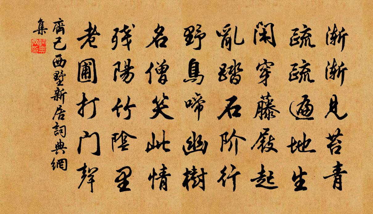 漸漸見苔青,疏疏遍地生。閒穿藤屐起,亂踏石階行。