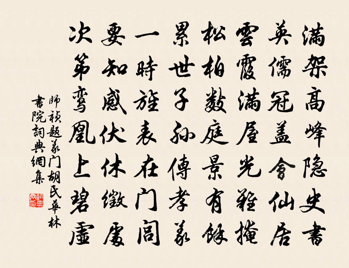 詩詞名句歷史字典書法欣賞書法字典國語詞典說文解字康熙字典古漢語字典標 題 作 者 詩 句 題義門胡氏華林書院作者:師禎 朝代:宋代題義門胡氏華林書院原文滿架高峰隱史書,英儒冠蓋會仙居。雲霞滿屋光難掩,松柏數庭景有餘。累世子孫傳孝義,一時旌表在門閭。要知感伏休徵處,次第鸞凰上碧虛。詩詞問答問:題義門胡氏華林書院的作者是誰?答:師禎問:題義門胡氏華林書院寫於哪個朝代?答:宋代師禎題義門胡氏華林書院書法欣賞題義門胡氏華林書院書法作品詩詞推薦雜詩張協〔魏晉〕朝霞迎白日,丹氣臨湯谷。繄繄結繁雲,森森散雨足。輕風摧勁草,凝霜竦高木。密葉日夜疏,叢林森如束。疇昔太常樂章三十首其二皇帝行奏隆安之曲楊億〔宋代〕祼鬯溥將,賓屍在位。玄德升聞,孝思光被。公卿庶政,傳御師氏。至誠感神,福祿來暨。上湖南孫漕四首廖行之〔宋代〕湘水湘江袞袞流,南連五嶺北荊州。造船行粟無遺算,自葉流根皆運籌。國計已多劉晏策,民情滋欲寇恂留。善刀和陳器之詩四首鹿仙山張耒〔宋代〕真人朝天去不還,千年鹿跡留空山。空山寂寞何所有,野殿荒涼松檜寒。桑田海水移今古,興亡萬變誰能數。五雲冬至日作蘇轍〔宋代〕羲和飛轡留不住,小兒逢節喜欲舞。人言老翁似小兒,烝豚釀酒多為具。潁川本自非吾鄉,鄰里十年成舊故。誰令浪淘沙·一泊沙來一泊去白居易〔唐代〕一泊沙來一泊去,一重浪滅一重生。相攪相淘無歇日,會教東海一時平。隱秀釋紹曇〔宋代〕觸戰蠻征總不知,樂羲皇世遁嘉肥。馨香靜掩芝蘭室,文采深藏錦繡機。伴野僧眠嵩少石,汲蒙泉煮首陽薇。簞瓢浪淘沙·岸柳可藏鴉吳琚〔宋代〕岸柳可藏鴉。路轉溪斜。忘機鷗鷺立汀沙。咫尺鍾山迷望眼,一半雲遮。臨水整烏紗。兩鬢蒼華。故鄉心事在天涯題趙君畫竹馬廷鸞〔宋代〕霜竿操尚特幽奇,直節端如正士姿。高拂九霄無曲處,古來惟有老天知。高光劉克莊〔宋代〕發兵坑黥布豎子,踞洗罵隋何腐儒。誰道東都重名節,故人只喚作狂奴。偈二十首釋鼎需〔宋代〕虎頭帶角人難措,石火電光須密布。假饒烈士薦應難,懵底那能解回互。次韻潘恕堂見寄真山民〔宋代〕抱瓮區區老漢陰,空齋擁鼻日長吟。青山隔截市朝面,白髮消磨豪傑心。書即無成休學劍,貴無可買恥言金。情知曹太尉西征石延年〔宋代〕仁者雖無敵,王師尚有徵。獨乘金廄馬,都領鐵林兵。肅氣關河暮,屯煙部落晴。旗光秋燒合,甲色夜江橫。士喜詠史上荀息陳普〔宋代〕三怨盈朝積不舒,奚齊卓子釜中魚。區區荀叔若乳嫗,智略無稱信有餘。壽高內翰汪莘〔宋代〕鶴立青松老令威,佳辰山水倍清輝。曾持東壁排雲出,幾跨蒼龍帶雨飛。竹簟水風須得意,玉堂春日即催歸。願公永嘉秋夕真山民〔宋代〕風戰枯桐敲紙窗,擁裘無寐夜偏長。樵樓三鼓夜將午,雲雁數聲天正霜。寓世此身驚逆旅,寬懷何處不吾鄉。江頭唐世有刺郡江表者時宰囑以新淦出筆……岳珂〔宋代〕世間示必無皋夔,九疑虞舜不可追。武皇銳意開絕漠,推鋒乃亦有衛霍。嗟哉格物本一理,僱人所用何如耳。筆工曉宴李群玉〔唐代〕金波西傾銀漢落,綠樹含煙倚朱閣。曉華朧日忽聞調笙,一點殘燈隔羅幕。達磨祖師贊釋慧遠〔宋代〕不是梁皇勘過,肯來少室冷坐。累佗二祖失心,被人喚作達磨。送李廷評知福清縣余靖〔宋代〕世閥茂儒紳,甌閩寵命新。縣圖遙盡海,鄉樹密藏春。供帳鶯將老,登車雉已馴。行聞趨召節,舊美政如神。名句推薦飢而欲食,寒而欲暖,勞而欲息,好利而惡害,是人之所生而有也。荀子《荀子·榮辱》 揚雲霓之晻藹兮,鳴玉鸞之啾啾。屈原《離騷》 不是花中偏愛菊,此花開盡更無花。元稹《菊花》 白日登山望烽火,黃昏飲馬傍交河。李頎《古從軍行》 而今識盡愁滋味,欲說還休。辛棄疾《醜奴兒·書博山道中壁》 愛之不以道,適所以害之也。司馬光《資治通鑑·晉紀十八》 半床落月蛩聲病,萬里寒雲雁陣遲。曹雪芹《殘菊》 燕歌未斷塞鴻飛,牧馬群嘶邊草綠。李益《塞下曲·其一》 傷心千古,秦淮一片明月!薩都剌《念奴嬌·登石頭城次東坡韻》 二月春花厭落梅。仙源歸路碧桃催。晏幾道《浣溪沙·二月春花厭落梅》