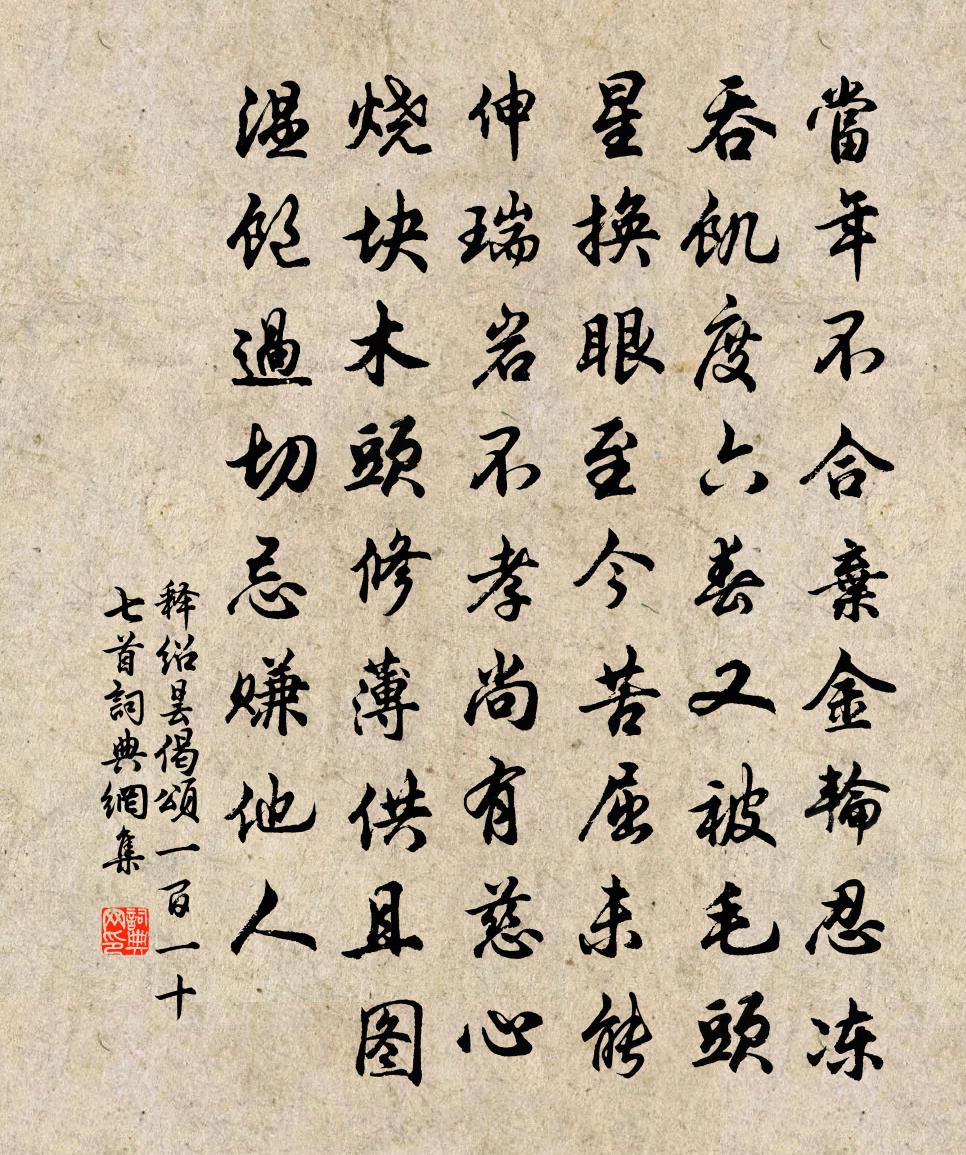 詩詞名句歷史字典書法欣賞書法字典國語詞典說文解字康熙字典古漢語字典標 題 作 者 詩 句 偈頌一百一十七首作者:釋紹曇 朝代:宋代偈頌一百一十七首原文當年不合棄金輪,忍凍吞飢度六春。又被毛頭星換眼,至今苦屈未能伸。瑞岩不孝,尚有慈心。燒塊木頭修薄供,且圖溫飽過,切忌賺他人。詩詞問答問:偈頌一百一十七首的作者是誰?答:釋紹曇問:偈頌一百一十七首寫於哪個朝代?答:宋代釋紹曇偈頌一百一十七首書法欣賞偈頌一百一十七首書法作品詩詞推薦新昌詠歸陳傅良〔宋代〕回頭三十二年非,木落霜空水見涯。萬事自憐多譽早,半生猶幸一官遲。好將翰墨付儕輩,去與漁樵相爾誰。還有踏沙行晏幾道〔宋代〕雪盡寒輕,月斜煙重,清歡猶記前時共。迎風朱戶背燈開,拂檐花影侵簾動。繡枕雙鴛,香苞翠鳳,從來往事都如馬郎婦釋祖欽〔宋代〕謾說教人學誦經,胸中涇渭甚分明。金沙影里無窮數,一灘流水聲。頌古九首靈雲桃華釋梵言〔宋代〕春風二月半,桃華紅爛漫。靈雲到處逢,衲僧著眼看。看,看,短棹孤舟,誰居彼岸。送方文甫判官劉克莊〔宋代〕檄筆騷情俱妙絕,它人才少子才多。分桐 * 從初祖,在孔門中占二科。此去潘輿添燕喜,向來韓木尚婆娑。傳聞浪淘沙·楊花李雯〔清代〕金縷曉風殘,素雪晴翻,為誰飛上玉雕闌?可惜章台新雨後,踏入沙間。沾惹忒無端,青鳥空銜,一春幽夢綠萍間過平望驛有懷湖州李使君二首陳舜俞〔宋代〕憑熊飛隼兩溪頭,人似冰壺住玉樓。事逐歡謠入漁釣,詩隨秋思滿汀洲。茶收顧渚旗猶卷,酒貰烏程蟻半浮。去路長沙勸耕真德秀〔宋代〕健訟翻成產禍胎,帶刀卻是殺身媒。爭先好勝災偏速,退步饒人福自來。古風其三十李白〔唐代〕玄風變太古。道喪無時還。擾擾季葉人。雞鳴趨四關。但識金馬門。誰知蓬萊山。白首死羅綺。笑歌無時閒。綠酒送權郡詹通判劉克莊〔宋代〕鎮靜一如無,頒條甫月餘。來惟居傳舍,去不識兵廚。健判風生筆,精祈雨灑車。丈夫何必假,行矣兩輪朱。壽大兄帥參開國陳宓〔宋代〕黃陂不撓已稱賢,況復胸中別有天。最好誕朝嘉節後,更斟壽酒菊花前。平生不作南金想,晚歲真成白璧全。退食運瀆朱存〔唐代〕舳艫銜尾日無虛,更塹都城引漕渠。何事餒來貪雀谷,不知留得紀幾儲。送韓玉汝太傅知洋州三首梅堯臣〔宋代〕春風東來幾萬里,相送入關如有情。灞陵原邊柳條暗,鹹陽橋畔桃花明。自古恨別此兩處,十千美酒卮璃傾。日落說詩宋湘〔清代〕池塘春草妙難尋,泥落空梁苦用心。若比大江流日夜,哀絲豪竹在知音。呈謝資深縣丞源趙蕃〔宋代〕平生夢寐臨川郡,故在溪堂竹友齋。句法已看行世集,風聲猶得起人懷。有孫住著園依水,薄宦舊來松儼槐。縱是春帖子詞皇后閣十首宋祁〔宋代〕曉天春氣淨融融,飛入天關第九重。靈沼水生初報雁,蓬萊雲暖即從龍。湖中曲李賀〔唐代〕長眉越沙采蘭若,桂葉水葒春漠漠。橫船醉眠白晝閒,渡口梅風歌扇薄。燕釵玉股照青渠,越王嬌郎小字書。蜀紙別子才司令方岳〔宋代〕不如意事常 * ,可與語人無二三。自識荊門子才甫,夢馳鐵馬戰城南。默默王安石〔宋代〕默默長年有所思,世間談笑強追隨。蒼髯欲出朱顏謝,更覺求田問舍遲。司空平章軍國事贈太師開國正獻呂公輓辭五首蘇頌〔宋代〕漢代明經相,唐朝鎮俗賢。時方尊長孺,天遽奪公權。袞冕頒新隧,笳簫入故阡。文成內外服,二美冠周篇。名句推薦五嶽尋仙不辭遠,一生好入名山游。李白《廬山謠寄盧侍御虛舟》 我見君來,頓覺吾廬,溪山美哉。辛棄疾《沁園春·和吳尉子似》 和氏之璧,不飾以五采;隋侯之珠,不飾以銀黃。其質至美,物不足以飾之。韓非及後人《韓非子·解老》 春草細還生,春雛養漸成。揭傒斯《畫鴨》 楊枝飄泊,桃根嬌小,獨自個思量。項鴻祚《太常引·客中聞歌》 小娃撐小艇,偷采白蓮回。白居易《池上》 悲懷感物來,泣涕應情隕。潘安《悼亡詩三首》 漸紅濕杏泥,愁燕無語。吳文英《掃花游·西湖寒食》 皮之不存,毛將安傅?左丘明《左傳·僖公·僖公十四年》 落絮無聲春墮淚,行雲有影月含羞。吳文英《浣溪沙·門隔花深夢舊遊》