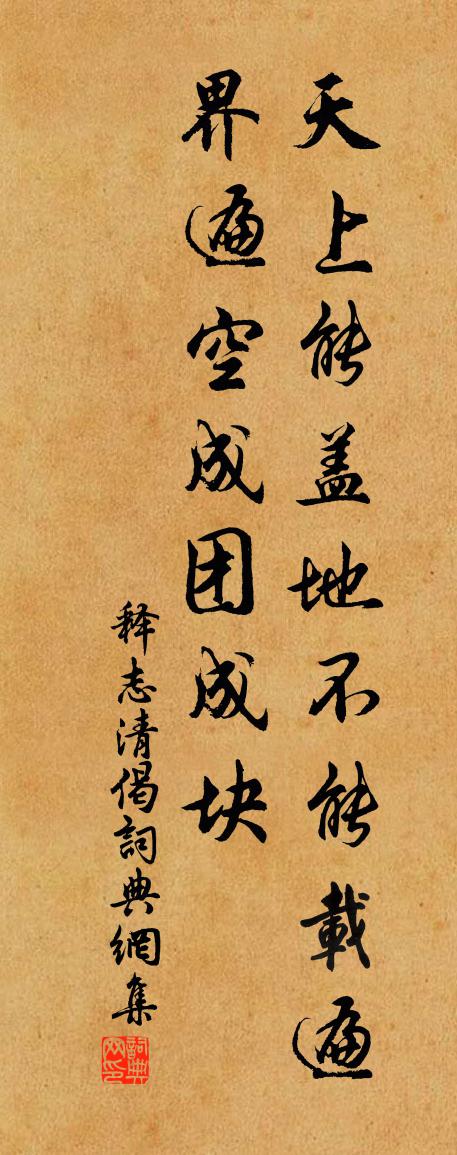詩詞名句歷史字典書法欣賞書法字典國語詞典說文解字康熙字典古漢語字典標 題 作 者 詩 句 偈作者:釋志清 朝代:宋代偈原文天上能蓋,地不能載。遍界遍空,成團成塊。詩詞問答問:偈的作者是誰?答:釋志清問:偈寫於哪個朝代?答:宋代釋志清偈書法欣賞偈書法作品詩詞推薦和天休舍人奉祠太一宮見寄宋祁〔宋代〕順祝齋琳館,翛然隔世埃。空歌靈鵠下,祠節寶雞來。瑞木千尋竦,仙圖幾卷開。如無清夜唱,誰識帝車回。戲作窗蠅詩鄭清之〔宋代〕曾記窗蠅古德詩,笑渠未有出頭時。驀然撞破窗間紙,透出虛空未是遲。上元蘇轍〔宋代〕上元車馬正喧喧,老病無聊長掩門。不著繁燈眩雙目,獨邀明月上前軒。跏趺默坐聞三鼓,寂寞誰來共一樽。已覺書事趙蕃〔宋代〕早禾雖登場,舂簸才足食。晚禾尚棲隴,登減未可必。吏持與催符,官趣違限責。為政本憂民,民憂政何德。詠史上貢禹陳普〔宋代〕殺傅囚師不敢言,奸人致意遂昏昏。明經潔行人如夢,莫把優遊議孝元。與碩父沈弟伯仲晚行河堤碩父欲作小亭於其上趙蕃〔宋代〕斷水橋橫獨木過,西南盡處得山多。自嗟不及兒童樂,橫笛騎牛穩下坡。頌古四十四首釋法泰〔宋代〕嵯峨萬仞是曹山,氣岸雄雄坐祖關。橫按鏌鋣全正令,太平寰宇斬痴頑。重陽有作呈朝宗吳芾〔宋代〕殘年腳力已摧頹,不謂登高尚可來。每恨故人多爽約,那知今日共銜杯。挪挲 * 香仍在,悵恨朱顏挽不回。君若寄方瞳胡先生陸游〔宋代〕形槁神彌王,心虛腦自凝。平生一酒榼,萬里兩行縢。安枕存玄牝,齋居養絳陵。他年喬嶽下,正晝看飛騰。秋試罷重九過滄峽林亦之〔宋代〕野闊村歸如暮鴉,路沿溪曲似春蛇。不諳水土愁多病,忽聽鄉談喜近家。一帶青山將屋繞,數行綠竹倚門斜。年年忠顯劉公輓詩四首張嵲〔宋代〕自從玉帛交殊域,一見寒盟為隱憂。亂相方虞鄰國難,廟堂誰聽徙薪謀。義和杞殖仍忠壯,識比申胥不怨尤。松柏遊仙都五首吳謹微〔宋代〕轍跡峰前聊息跡,忘歸洞口未能歸。往來名利憧憧者,著腳仙都亦自稀。示子虡陸游〔宋代〕好學承家夙所奇,蠹編殘簡共娛嬉。一婚倘畢吾無累,三釜雖微汝有期。聿弟元知是難弟,德兒稍長豈常兒。要令雜劇·漢鍾離度脫藍采和佚名〔元代〕第一折(沖末扮鍾離上,詩云)生我之門死我戶,幾個惺惺幾個悟。夜來鐵漢自尋思,長生不死由人做。貧遭覆姓玉樓春杜安世〔宋代〕春景拋人無處問。多謝石榴花又噴。茜羅揉出碎英繁,紅蠟縷成香萼潤。血色新裙羞莫近。密葉柔條相間襯。雨餘表兄峽山蕭伯鈞至會昌久之以歸歟字韻丐詩為曾豐〔宋代〕久離空嚮往,重見少相依。款曲論心約,因循與願違。今逢聲氣是,但覺鬢毛非。禍患今相問,從此死處歸。真定懷古石延年〔宋代〕光定經營業未興,王郎兵革暫憑陵。須知後漢功臣力,不及滹沱一片冰。洗心司馬退之〔唐代〕不踐名利道,始覺塵土腥。不味稻粱食,始覺精神清。羅浮奔走外,日月無短明。山瘦松亦勁,鶴老飛更輕。逍遙聞升甫南池觀魚所獲無幾戲成小詩奉呈強至〔宋代〕巨鱗非尺澤,多目漫污池。網漏從今日,筌忘復幾時。饔人顏慘澹,漁子興參差。豈似任公捷,群鰲一釣絲。凌煙嶂劉仲堪〔宋代〕崟崟才數仞,邐迤極幽致。藤蘿與苔蘚,蔓延相□□。青天煉可補,滄海鞭難至。造物者何為,並此儕魑魅。名句推薦素手把芙蓉,虛步躡太清。李白《古風·其十九》 當年曾勝賞,生香熏袖,活火分茶。李清照《轉調滿庭芳·芳草池塘》 橋成漢渚星波外,人在鸞歌鳳舞前。晏幾道《鷓鴣天·當日佳期鵲誤傳》 桑柘外鞦韆女兒,髻雙鴉斜插花枝。盧摯《蟾宮曲·寒食新野道中》 女子今有行,大江溯輕舟。韋應物《送楊氏女》 姑蘇城外寒山寺,夜半鐘聲到客船張繼《楓橋夜泊》 塵緣一點,回首西風又陳跡。吳文英《六么令·夷則宮七夕》 或飲食,或坐走。長者先,幼者後。李毓秀《弟子規·出則弟》 為上者疑,為下者懼。上下背德,禍必興焉。來俊臣《羅織經·事上卷第二》 小來思報國,不是愛封侯。岑參《送人赴安西》
