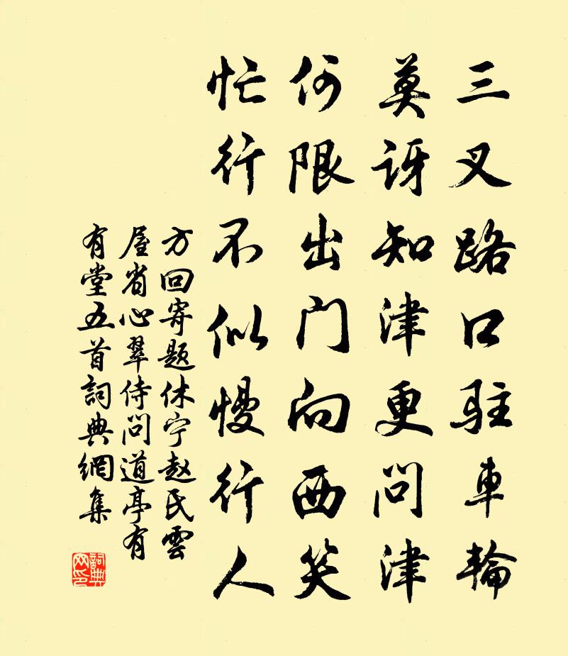 詩詞名句歷史字典書法欣賞書法字典國語詞典說文解字康熙字典古漢語字典標 題 作 者 詩 句 寄題休寧趙氏雲屋省心翠侍問道亭有有堂五首作者:方回 朝代:宋代原文三叉路口駐車輪,莫訝知津更問津。何限出門向西笑,忙行不似慢行人。詩詞問答問:《寄題休寧趙氏雲屋省心翠侍問道亭有有堂五首》的作者是誰?答:方回問:該詩寫於哪個朝代?答:宋代書法欣賞寄題休寧趙氏雲屋省心翠侍問道亭有有堂五首書法作品詩詞推薦奉和陳閣老寒食初假當直從東省往集賢…寄張蔣二閣老權德輿〔唐代〕晝漏沈沈倦瑣闈,西垣東觀閱芳菲。繁花滿樹似留客,應為主人休浣歸。太師汪煥章社日勸農余出湖曲葛紹體〔宋代〕春勸老農夸歲歲,晚飛新燕賀年年。鑑湖一棹煙波客,燕舞農歌伴醉眠。書扇二首趙文〔宋代〕牆外數莖新竹,樓西一抹斜陽。偶游蟻穴初覺,細聽蟬聲自涼。談禪趙汝鐩〔宋代〕禪僧晚相投,貌古似落魄,說性說虛空,雕心苦摸索。千百則公案,信口無一錯。有蟬隔窗鳴,與僧恣酬酢。僧喝對雪釋智圓〔宋代〕冷結平湖絕棹過,紛紛盈目趣如何。侯門歌舞看難足,編戶饑寒心厭多。旋滿閒庭夸玉砌,重欹幽樹斗瓊柯。夜來和錢德循古意二首之二賀鑄〔宋代〕 * 南有箕,垂象列三辰。長司簸揚職,糠秕居前塵。拜明招二先生墓有感王柏〔宋代〕仲氏孤忠徹九天,青原淡月慘遺篇。摩挲朱子嗚呼字,寂寂庭前重愴然。採桑子朱藻〔宋代〕障泥油壁人歸後,滿院花陰。樓影沈沈。中有傷春一片心。間穿綠樹尋梅子,斜日籠明。團扇風輕。一徑楊花不避南歌子趙子發〔宋代〕天末疑無路,波翻欲御風。此身忽在玉壺中。醉倒不知、南北與西東。獵獵遙鳴草,颼颼靜打篷。與君回棹碧雲濃玉溪曉步高述〔宋代〕平生丘壑情,得此真忘形。摳衣跨石角,開道披林坰。日影曉峰翠,猿啼山柿青。三潭在何許,已約摸重屏。與蔡吏部林直院別江樓方岳〔宋代〕又拋蓑笠出山來,那得江鷗不見猜。一醉真成吞溟涬,三人曾共住蓬萊,翰林詞伯玉為骨,直指繡衣霜作台。莫笑晚飲東湖亭用碩夫韻李彌遜〔宋代〕秋後高荷與砌平,暫回眼白為君表。喔詩太瘦真成癖,對酒清狂不礙醒。健筆縱橫那可繼,醉歌悲壯亦堪聽。如何運判再以前韻見寄韓維〔宋代〕突兀朱堂冠北城,雲峰滿目互陰晴。憑欄不負思山意,對酒何煩考鼓聲。清話從容雙塵禿,雕章溫麗百金輕。歸軒虞美人(蔣園醉歸)舒亶〔宋代〕重簾小閣香雲暖。黛拂梳妝淺。玉簫一曲杜韋娘。誰是蘇州刺史、斷人腸。醉歸旋撥紅爐火。卻倚屏山坐。銀缸明盆池邵雍〔宋代〕三五小圓荷,盆容水不多。難非大藪澤,亦有小風波。粗起江湖趣,殊無鴛鷺過。幽人興難遏,時繞醉吟喔。山中五詠遠山皇甫冉〔唐代〕少室盡西峰,鳴皋隱南面。柴門縱復關,終日窗中見。答陳楙伯二首劉克莊〔宋代〕聖處分明世鮮知,古人豈是異肝脾。謂鰲可釣無傳法,視虱如輪有悟時。老子夢中還說夢,郎君詩外試求詩。向來春晚王令〔宋代〕三月殘花落更開,小檐日日燕飛來。子規夜半猶啼血,不信東風喚不回。贈史文通奉議二首蘇轍〔宋代〕有叟住東野,畏人希入城。君時共還往,我欲問修行。早歲識岩客,近時逢絳生。真能訪茅屋,屣履試將迎。述九頌耀德程公許〔宋代〕郊見帝兮琮璜,瑟彼瓚兮流斯黃。物有專兮靈粹,寧糅雜兮尋常。懿君子兮毓協,可蠡測兮蘊藏。稟堪輿兮間氣,名句推薦巫峽啼猿數行淚,衡陽歸雁幾封書。高適《送李少府貶峽中王少府貶長沙》 高風吹玉柱,萬籟忽齊飄司空曙《風箏》 哀蟬無留響,叢雁鳴雲霄。陶淵明《己酉歲九月九日》 遊人日暮相將去,醒醉喧譁。歐陽修《採桑子·清明上巳西湖好》 法莫如顯,而術不欲見韓非及後人《韓非子·難三》 但恨處非位,愴悢使心傷。阮籍《詠懷八十二首·其七十九》 昔時人已沒,今日水猶寒。駱賓王《於易水送人 / 於易水送別》 父子有親,君臣有義,夫婦有別,長幼有序,朋友有信。孟子《孟子·滕文公章句上·第四節》 故人南燕吏,籍籍名更香。岑參《至大梁卻寄匡城主人》 來如風雨,去似微塵。佚名《增廣賢文·上集》