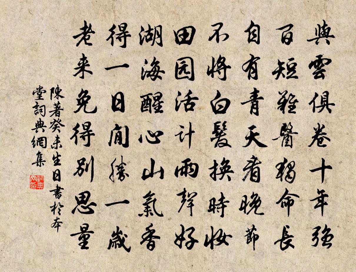 詩詞名句歷史字典書法欣賞書法字典國語詞典說文解字康熙字典古漢語字典標 題 作 者 詩 句 癸未生日書於本堂作者:陳著 朝代:宋代癸未生日書於本堂原文與雲俱卷十年強,百短難醫獨命長。自有青天看晚節,不將白髮換時妝。田園活計雨聲好,湖海醒心山氣香。得一日閒勝一歲,老來免得別思量。詩詞問答問:癸未生日書於本堂的作者是誰?答:陳著問:癸未生日書於本堂寫於哪個朝代?答:宋代陳著癸未生日書於本堂書法欣賞癸未生日書於本堂書法作品詩詞推薦又登碧雲亭感懷三十首吳芾〔宋代〕晚上危亭憶令威,凌虛山上悟玄機。丹成不見升騰跡,徒想當年化鶴飛。古意耿湋〔唐代〕雖言千騎上頭居,一世生離恨有餘。葉下綺窗銀燭冷,含啼自草錦中書。梅花十絕方岳〔宋代〕有梅無雪不精神,有雪無詩俗了人。薄暮詩成天又雪,與梅並作十分春。白苧歌許志仁〔宋代〕大垂手,小垂手,江南白苧世希有。白苧新裁舞衣小。秋江四面繞吳宮,吳宮霜橘樹樹紅。吳王夜宴不知曉,但見天竺禱晴樓鑰〔宋代〕早奉天香禱白衣,遲明宿霧故淒迷。忽驚紅日穿林薄,無數碧山明澗溪。上竺寺連中竺寺,蘇公堤映白公堤。湖光胡監岳輓詞樓鑰〔宋代〕賦就八叉手,文高三折肱。青衫雙鬢雪,黃卷短檠燈。夢斷采芹水,神淒下馬陵。諸郎追五桂,洗眼看飛騰。喜翁文堯員外病起黃滔〔唐代〕衛玠羊車懸,長卿駟馬姿。天嫌太端正,神乃減風儀。飲冰俾消渴,斷谷皆清羸。越僧夸艾炷,秦女隔花枝。自能游鄞陸游〔宋代〕晚雨初收旋作晴,買舟訪舊海邊城。高帆斜掛夕陽色,急櫓不聞人語聲。掠水翻翻沙鷺過,供廚片片雪鱗明。山川壽邵陽唐倅二首廖行之〔宋代〕瑞蓂八葉開蕤賓,湘川當年生俊人。天孫織裳雲錦新。下與聖世為卿雲。妙齡材策趣金鑾,從橫禮樂波瀾翻。結知寶善堂為薛玄卿題黃叔美〔宋代〕人孰不有母,鮮能報其恩。人孰不有弟,鮮能念同根。漢興尺布謠,鄭有誓泉言。所以憂世事,永嘆鶺鴒原。緬懷句石東震〔宋代〕門前碧蘸一溪斜,仿佛逃秦處士家。煙寺晚鐘陳孚〔元代〕山深不見寺,藤陰鎖修竹。忽聞疏鐘聲,白雲滿空谷。老僧汲水歸,松露墮衣綠。鍾殘寺門掩,山鳥自爭宿。十六日水退雨不已次受益韻二首方回〔宋代〕暑雨民咨怨,由來直匪今。濕能蒸病骨,滴欲碎歸心。積水連村郭,前途昧淺深。雄風楚台上,誰且獨披襟。句釋曉瑩〔宋代〕談笑會當同。頌古一百則釋正覺〔宋代〕拂牛劍氣洗兵威,定亂歸功更是誰。一旦氛埃清四海,垂衣皇化目無為。頌古釋道顏〔宋代〕胡亂三十年,不少鹽與醬。江西馬大師,南嶽讓和尚。題採石蛾眉山佚名〔宋代〕一島烽煙斡怒流,烯犀捉月兩悠悠。蛾眉中劃三千丈,不著人間半點愁。論語絕句一百首張九成〔宋代〕所長孰不願施之,豈肯言吾未信斯。大是此心真不昧,斷知天地不容欺。冬日淮上別文上人(一作酬和友人見寄)慕幽〔唐代〕家國各萬里,同吟六七年。可堪隨北雁,迢遞向南天。水共行人遠,山將落日連。春淮有雙鯉,莫忘尺書傳。梅花劉克莊〔宋代〕木落山空獨占春,十分清瘦轉精神。雪疏雪密花添伴,溪踐溪深樹寫真。三弄笛聲風過耳,一枝筇影月隨身。吟罷名句推薦角聲吹徹小梅花。夜長人憶家。趙長卿《阮郎歸·客中見梅》 昨夢西湖,老扁舟身世。吳文英《拜星月慢·林鐘羽姜石帚以盆蓮數十置中庭宴客其中》 朔吹飄夜香,繁霜滋曉白。柳宗元《早梅》 請君看取東流水,方識人間別意長。嚴仁《鷓鴣天·惜別》 三百年間同曉夢,鐘山何處有龍盤。李商隱《詠史二首·其一》 子規啼徹四更時,起視蠶稠怕葉稀。謝枋得《蠶婦吟》 枝上流鶯和淚聞,新啼痕間舊啼痕。秦觀《鷓鴣天·枝上流鶯和淚聞》 綠葉陰濃,遍池亭水閣,偏趁涼多。元好問《驟雨打新荷》 春水別來應到海,小松生命合禁霜李覯《秋晚悲懷》 罩向金籠好羽儀,分明喉舌似君稀僧定渚《詠鸚鵡》