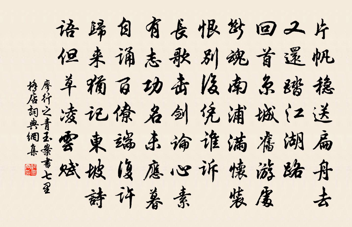 詩詞名句歷史字典書法欣賞書法字典國語詞典說文解字康熙字典古漢語字典標 題 作 者 詩 句 青玉案(書七里橋店)作者:廖行之 朝代:宋代青玉案(書七里橋店)原文片帆穩送扁舟去。又還踏、江湖路。回首京城舊遊處。斷魂南浦,滿懷裝恨,別後憑誰訴。長歌擊劍論心素。有志功名未應暮。自誦百僚端復許。歸來猶記,東坡詩語,但草凌雲賦。詩詞問答問:青玉案(書七里橋店)的作者是誰?答:廖行之問:青玉案(書七里橋店)寫於哪個朝代?答:宋代問:青玉案(書七里橋店)是什麼體裁?答:詞廖行之青玉案(書七里橋店)書法欣賞青玉案(書七里橋店)書法作品詩詞推薦雜興陸游〔宋代〕讀詩讀七月,治書治無逸,王業與農功,事異理則一。此外復何為,齊民有遺術,一飽不啻足,切必為利訹。大屋圓相觀音菩薩瑞像頌釋彥泯〔宋代〕妙覺慈生主,身雲瑩碧霞。光輪停夜月,瓔珞綴千花。無車臉心普,分形應類差。圓通斯第一,名號遍恆沙。處處踏雲行馬鈺〔元代〕自在閒人,逍遙烈士。清貧快樂忘塵事。風前月下撫心琴,龍吟虎嘯來參侍。或隱山林,或居*市。勸人回首頭頭觀道人求頌釋曇華〔宋代〕學佛從來境界多,不能降伏便成魔。降魔能用無心法,六賊傾城盡倒戈。鷓鴣天劉秉忠〔元代〕花滿尊前酒滿卮。不開笑口是痴兒。山林鐘鼎都休問,且聽雙蛾合一詞。春爛處,夜晴時。玉壺香裊冷胭脂。海棠三月三日上忠襄墳,因之行散,得十絕句楊萬里〔宋代〕女唱兒歌去蹈青,阿婆笑語伴渠行。只虧郎罷優輕殺,櫑子雙檐挈酒餅。聞喜宴薛和御製惕進士詩程公許〔宋代〕九五天臨德有元,自應皇化軼義軒,囊封何日無忠諫,延策今年許盡言。端籍多才戡世難,心銷殺氣作春溫。萬間示諸子蘇轍〔宋代〕老去惟堪一味閒,坐令諸子了生綠。般柴運水皆行道,挾策讀書那廢田。兄弟躬耕真盡力,鄉鄰不慣枉稱賢。裕人奉和聖制立春日侍宴內殿出剪彩花應制劉憲〔唐代〕上林宮館好,春光獨早知。剪花疑始發,刻燕似新窺。色濃輕雪點,香淺嫩風吹。此日叨陪侍,恩榮得數枝。告春亭朱翌〔宋代〕一丈寬鋤地,三重密蓋茅。分封鷗鷺境,拾翠芰荷{左土右幻}。正樂賓中主,居然國外郊。老來俱倒置,營圃不次韻東坡武昌西山詩樓鑰〔宋代〕黨論一興誰可回,賢路荊棘爭先栽。竄流多能擅筆墨,囚拘或可為鹽梅。雪堂先生萬人敵,議論磊落心崔嵬。向來次韻玉汝韓維〔宋代〕浮生難得是華顛,美景能並屬禁菸。況值公庭多暇日,且欣農畝兆豐年。曾裁酒量容杯斝,謂品歌聲被管弦。莫道次韻答提刑孫都官二首李覯〔宋代〕病樹難隨萬木榮,閉門終日自愁縈。繡衣使者知何取,肯向民間問死生。李康靖少傅夫人輓詞二首梅堯臣〔宋代〕九月秋風急,三川苦霧迷。卜邙新隧啟,度鞏短簫齊。寶劍知終合,靈蟾已隕西。松門來會葬,車馬幾千蹄。贊真覺釋堅璧〔宋代〕三回九度,見神見鬼。德山一棒,痛徹骨髓。敲老觀門,潑瓦官水。而今冷坐眼麻眉,錯認東瓜作碓觜。邵伯溫聞見錄載范忠宣帥慶陽時總管種詁無訟岳珂〔宋代〕君不見孫融昔日見李膺,百世尚以通家稱。又不見孔融後來薦鴻豫,卵翼方成比行路。北海平生開酒尊,未應賓客送雍陶入蜀賈島〔唐代〕江山事若諳,那肯滯雲南。草色分危磴,杉陰近古潭。日斜褒谷鳥,夏淺巂州蠶。吾自疑雙鬢,相逢更不堪。再過宜興舟中見芍藥數枝憶淮鄉花之盛為之悵仲並〔宋代〕少時暮暮復朝朝,一水相望恨未消。岸曲橫舟試回首,隔簾斜立數妖嬈。早春司空圖〔唐代〕傷懷同客處,病眼卻花朝。草嫩侵沙短,冰輕著雨消。風光知可愛,容發不相饒。早晚丹丘去,飛書肯見招。晚步吳可〔宋代〕野樹疏疏透夕陽,歸鴉零亂不成行。春風可是閒來往,時送江梅一陣香。名句推薦感時花濺淚,恨別鳥驚心。杜甫《春望》 絲長魚誤恐,枝弱禽驚踐。崔護《五月水邊柳》 老母與子別,呼天野草間。李白《豫章行》 黃河捧土尚可塞,北風雨雪恨難裁。李白《北風行》 北風利如劍,布絮不蔽身。白居易《村居苦寒》 憐不可存,憐人者無證其忠。友宜重懲,援友者惟其害。來俊臣《羅織經·問罪卷第十》 半生已分孤眠過,山枕檀痕涴。納蘭性德《虞美人·曲闌深處重相見》 吾生也有涯,而知也無涯。莊子《莊子·內篇·養生主原文》 秋雨一何碧,山色倚晴空。方岳《水調歌頭·平山堂用東坡韻》 聚如丘山,散如風雨,迅如雷電,捷如鷹鶻宋濂、王褘《元史·列傳·卷四十四》