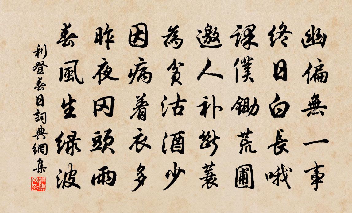 詩詞名句歷史字典書法欣賞書法字典國語詞典說文解字康熙字典古漢語字典標 題 作 者 詩 句 春日作者:利登 朝代:宋代春日原文幽偏無一事,終日白長喔。課仆鋤荒圃,邀人補斷蓑。為貧沽酒少,因病著衣多。昨夜岡頭雨,春風生綠波。詩詞問答問:春日的作者是誰?答:利登問:春日寫於哪個朝代?答:宋代利登春日書法欣賞春日書法作品詩詞推薦過櫟陽山谿陳羽〔唐代〕眾草穿沙芳色齊,蹋莎行草過春溪。閒雲相引上山去,人到山頭雲卻低。陳元叟清軒鄭俠〔宋代〕塵坌中軒戶,誰標似水名。物訛空自汩,人性本來清。天上雲藏月,人間石裹英。雲開與石裂,精瑩自分明。相和歌辭。昭君詞張文琮〔唐代〕戒途飛萬里,回首望三秦。忽見天山雪,還疑上苑春。玉痕垂粉淚,羅袂拂胡塵。為得胡中曲,還悲遠嫁人。題延平招演堂陳宓〔宋代〕好山四繞作銀屏,秀水忝流玉樣青。雨後龍精穿皦日,夜初漁火混疏星。躊躇直擬長來宅,取次都堪小結亭。謾酌憲宗章武孝皇帝輓歌詞三首元稹〔唐代〕國付宮重離後,宮身隨十聖宮仙。北辰移帝座,西日到虞泉。方丈言虛設,華胥事眇然。觸鱗曾在宥,偏哭墮髯前哭邢芻父六首蘇泂〔宋代〕頤養花能秀,謙卑玉似溫。當家衣缽受,外氏典型存。逸驥方開路,歸雲遽斂昏。胸中何事了,地下與誰論。對月六首白玉蟾〔宋代〕深秋荷敗柳枯時,霜蟹香棖副所思。月要人窺嬌不上,風知我醉放多吹。沁園春 寄崑山友人並自述謝應芳〔元代〕泉石膏盲,塵土驅馳,還家鬢霜。想吟邊茗碗,清風習習,醉中琴操,流水洋洋。口不雌黃,眼無青白,鳧鶴從教浣溪沙(檐卜)楊 * 〔宋代〕原上芳華已亂飛。林間佛日卻暉暉。一花六葉殿春歸。身外色香空荏苒,鼻端訊息正霏微。禪林曲幾坐忘時。入京逢故人薛嵎〔宋代〕長貧復羈旅,共爽十年歡。在世誰無累,如君事獨難。蹴居憐火後,多病臥春殘。縱決歸山計,煙蘿不療寒。玉抱肚楊無咎〔宋代〕同行同坐。同攜同臥。正朝朝暮暮同歡,怎知終有拋嚲。記江皋惜別,那堪被、流水無情送輕舸。有愁萬種,恨未立春帖子太上皇帝閣周必大〔宋代〕一年好處是初春,十閣爭先奉聖人。彩勝寶幡簪帽巧,蘭芽蔬甲族盤新。記顏劉克莊〔宋代〕喚做農夫卻逢掖,道是禪和又幅巾。灞陵雪中聳肩客,天津橋上皺眉人。南湖賦冬青花四首張鎡〔宋代〕酷烈深憐格外香,樹邊苔氣與蒼涼。莫教糝徑渾如雪,快向青陰置竹床。鄱陽湖觀打魚楊時〔宋代〕秋高水初落,鱗介滿沙脊。浩如太倉粟,寧複數以粒。紛紛漁舟子,疑若挽可拾。橫湖沉密網,脫漏百無十。蟲蝦游天竺釋紹嵩〔宋代〕天竺秋重入,翛然適此心。路尋流水遠,門閉野雲深。澹濘生真趣,幽閒且自任。殘陽應更好,蟬合伴清吟。過眼吟邵雍〔宋代〕紛紛過眼不須驚,利害相磨卒未平。伎倆雖多無實效,聰明到了是虛名。溫涼寒熱四時事,甘苦辛酸萬物情。除卻江神子 惜花張翥〔元代〕牡丹芍藥冠池台。縷金杯。錦雲堆。最恨顛風,橫雨故相催。國色天香虛過了,紅片片,臥蒼苔。綠陰籬落暗香來崴晚出城楊萬里〔宋代〕溫飽能消底?奔忙自作痴。平生腳已繭,今日鬢將絲。山刻霜余骨,梅臨水底枝。只嫌長落莫,不道許幽奇。寄玉溪林逢吉六首戴復古〔宋代〕心腹相知會面稀,一春未有盍簪期。西窗風雨愁眠夜,夢到君家賦小詩。名句推薦未覺池塘春草夢,階前梧葉已秋聲。朱熹《偶成》 惟有今宵,皓彩皆同普。郭應祥《醉落魄·丙寅中秋》 不負東籬約,攜尊過草堂。妙信《九日酬諸子》 遙憶獨眠人,早寒驚夢頻。顧貞觀《菩薩蠻·山城夜半催金柝》 是他春帶愁來,春歸何處。辛棄疾《祝英台近·晚春》 卜鄰近三徑,植果盈千樹。孟浩然《田園作》 安土重遷,黎民之性;骨肉相附,人情所願也。班固《漢書·紀·元帝紀》 傍枯林古道,長河飲馬,此意悠悠。張炎《八聲甘州·記玉關踏雪事清游》 縱使有花兼有月,可堪無酒又無人。李商隱《春日寄懷》 平生不會相思,才會相思,便害相思。徐再思《折桂令·春情》