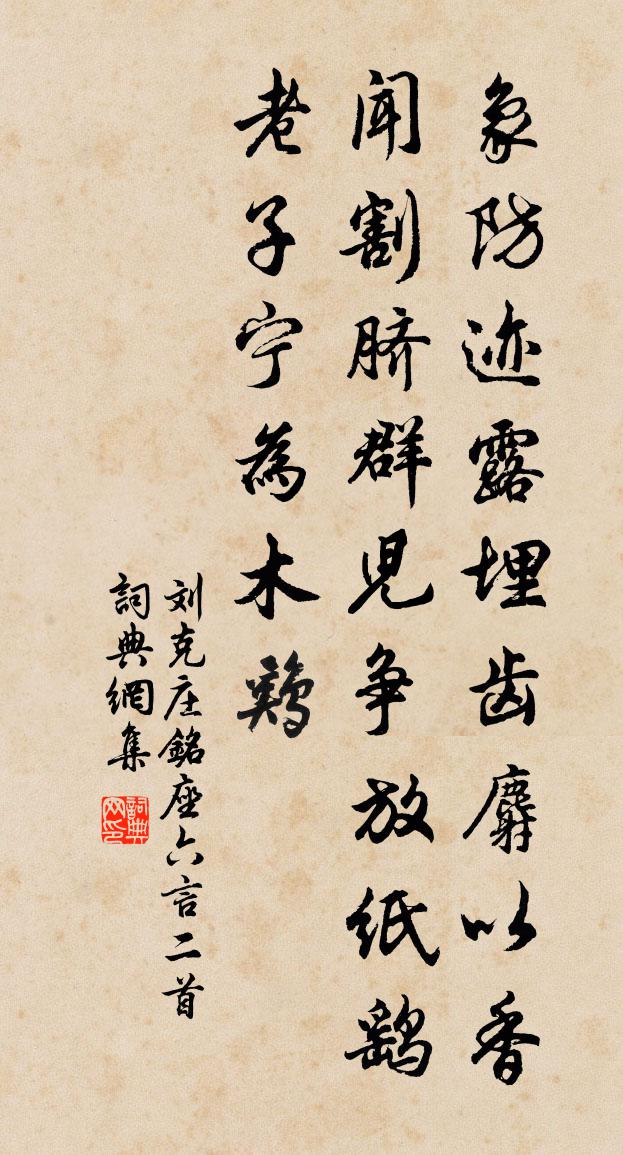 詩詞名句歷史字典書法欣賞書法字典國語詞典說文解字康熙字典古漢語字典標 題 作 者 詩 句 銘座六言二首作者:劉克莊 朝代:宋代銘座六言二首原文象防跡露埋齒,麝以香聞割臍。群兒爭放紙鷂,老子寧為木雞。詩詞問答問:銘座六言二首的作者是誰?答:劉克莊問:銘座六言二首寫於哪個朝代?答:宋代問:劉克莊的名句有哪些?答:劉克莊名句大全劉克莊銘座六言二首書法欣賞銘座六言二首書法作品詩詞推薦釣車徐夤〔唐代〕荻灣漁客巧妝成,硾鑄銀星一點輕。拋過碧江岸,軋殘金井轆轤聲。軸磨騂角冰光滑,輪卷春絲水面平。把向嚴灘洪州曾鞏〔宋代〕洪州城中荒且遠,每到弱馬常驅馳。交朋顧我亦已厚,謝詞有禮寧當違。人生有累乃汲汲,萬事敦迫如銜羈。山中挽林德遇主學劉克莊〔宋代〕摛掞多新意,研尋最苦心。可憐策名晚,誰遣讀書深。兄老悲長枕,妻賢斂短衾。近書猶未答,展玩一沾襟。竹溪直院盛稱起予草堂詩之善暇日覽之多有可劉克莊〔宋代〕不為劉郎屈,蕭然釣遠汀。當時無此客,其象見於星。龍袞思同學,羊裘謁廣庭。九行仰黃道,一曜動青冥。帝座題汪水雲詩卷十一首劉師復〔宋代〕詩翁老去尚兒嬉,撩撥歌鬟笑挽衣。草草杯盤隨處飲,西泠橋入斷橋歸。題寒山拾得畫像方回〔宋代〕我讀寒山拾得詩,唐初武德貞觀時。此必前朝老進士,開皇大業不仕隋。長歌短舞芙蓉句,開元元和尚無之。一箒經溳川館寄使府群公李涉〔唐代〕溳川水竹十家餘,漁艇蓬門對岸居。大勝塵中走鞍馬,與他軍府判文書。燕雀湖楊修〔宋代〕平湖岸側見高墳,萬土銜來燕雀群。鑒面無波天一色,此中文藻似儲君。偈頌十一首釋了演〔宋代〕今朝四月初一,即辰孟夏漸熱。伏惟大眾增休,各各眼橫鼻直。若謂世諦流通,燋盤重添艾灸。若作佛法商量,瞎懷古呂定〔宋代〕我昔游海上,東望三神山。風波幾萬里,蒼茫雲靄間。魚龍自掀舞。天空日月閒。神仙渺無跡,徐福去不還。空餘贈禮部邵安簡公輓詞王珪〔唐代〕獨騎箕尾去凌虛,枉駕追鋒作召車。衣褐誰陳定羌冊,汗青猶載立儲書。春風澤國吟箋冷,夜雨溪堂燕豆疏。曾向詩思方回〔宋代〕野眺荒山外,詩愁細雨中。肯令一字俗,已拼百年窮。病體皮膚皺,寒庖糗餌空。戎葵獨何事,故作向人紅。無題蘇軾〔宋代〕六秩行當啟,區中緣更疏。不貪為我寶,安步當君車。故國多喬木,先人有敝廬。誓將閒散好,不著一行書。顏徒貧樂齋二首黃庭堅〔宋代〕衡門低首過,環堵容膝坐。四旁無給侍,百衲自纏裹。論事直如弦,觀書曲肱臥。飢來或乞食,有道無不可。秦淮次北谷羅疊韻葉輝〔宋代〕人言王氣在鄣州,嬴政因來鑿此流。地脈何曾真斷得,幾多天子御宸樓。酒泉子 武水幽瀾(在縣東三十六里武水)吳鎮〔元代〕一*幽瀾,景德廊西苔蘚合,茶經第七品其泉。清冽有靈源。亭間梁棟書題滿。翠竹蕭森映池館。門前一水接華亭趙用甫提舉夢中得片雲不隔梅花月之句時被命戴復古〔宋代〕一時議論動諸公,有詔西來玉節東。又見清朝更大化,好趨丹陛奏孤忠。片雲不隔梅花月,一雪翻成柳絮風。把酒頌石頭和尚草庵歌釋印肅〔宋代〕破後還將茅草蓋,雨過風吹無罣礙。垢衣那肯便拋遺,切恐眾生難理會。徐伯壽求贊釋曇華〔宋代〕大海波濤闊,千峰氣象雄。當頭俱坐斷,直下展家風。一喝分賓主,三玄辨正宗。其餘都莫問,今古有盲聾。節惠劉克莊〔宋代〕醉似東皋子,愚於北谷去。何當節一惠,單謚作愚翁。名句推薦鼙鼓動時雷隱隱,獸頭凌處雪微微。盧肇《競渡詩 / 及第後江寧觀競渡寄袁州剌史成應元》 大風起兮雲飛揚。威加海內兮歸故鄉。劉邦《大風歌》 還背垂虹秋去,四橋煙雨,一宵歌酒。吳文英《瑞龍吟·送梅津》 笑漸不聞聲漸悄,多情卻被無情惱。蘇軾《蝶戀花·春景》 虛負凌雲萬丈才,一生襟抱未曾開。崔珏《哭李商隱》 休說鱸魚堪膾,盡西風,季鷹歸未?辛棄疾《水龍吟·登建康賞心亭》 秋草六朝寒,花雨空壇。更無人處一憑闌。朱彝尊《賣花聲·雨花台》 滿腹詩書漫古今,頻年流落易傷心。宇文虛中《在金日作·選二》 邊雪藏行徑,林風透臥衣。賈島《送鄒明府游靈武》 身既死兮神以靈,魂魄毅兮為鬼雄。屈原《國殤》