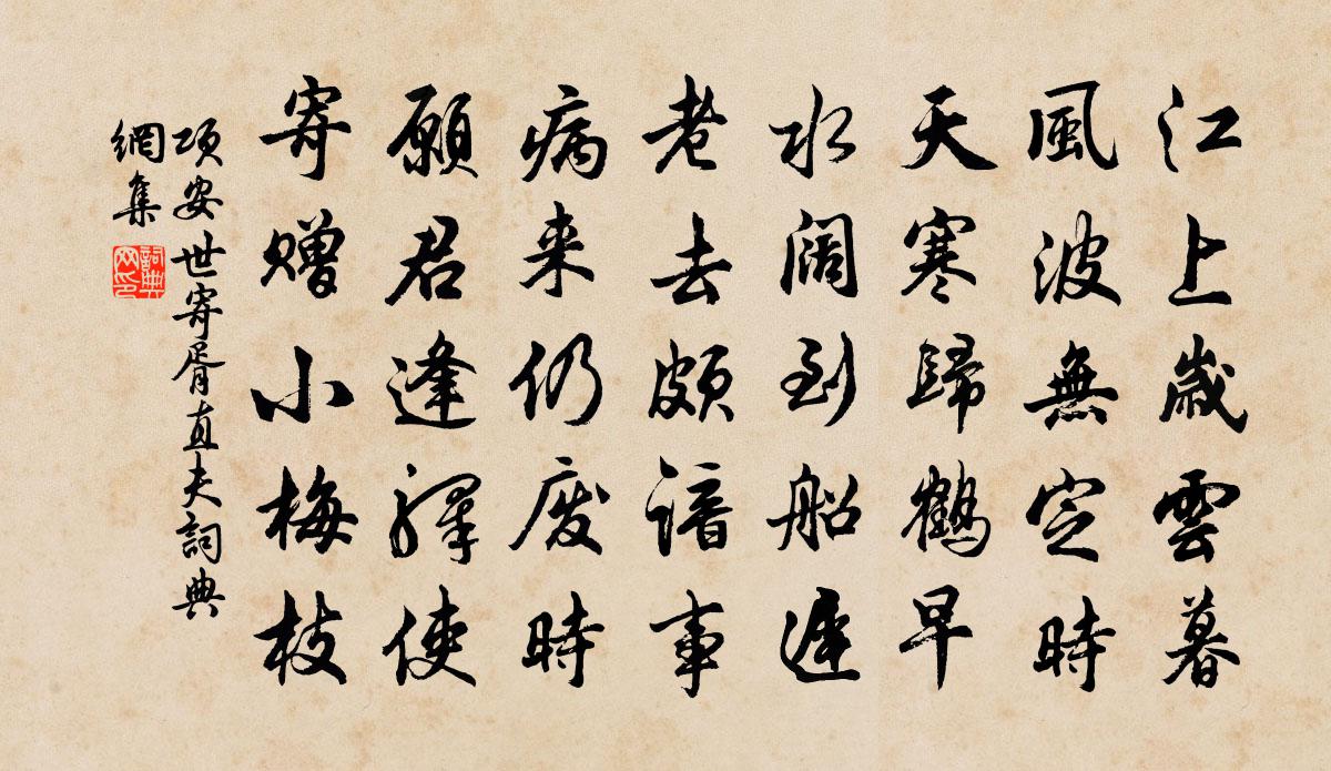 詩詞名句歷史字典書法欣賞書法字典國語詞典說文解字康熙字典古漢語字典標 題 作 者 詩 句 寄胥直夫作者:項安世 朝代:宋代寄胥直夫原文江上歲雲暮,風波無定時。天寒歸鶴早,水闊到船遲。老去頗諳事,病來仍廢時。願君逢驛使,寄贈小梅枝。詩詞問答問:寄胥直夫的作者是誰?答:項安世問:寄胥直夫寫於哪個朝代?答:宋代項安世寄胥直夫書法欣賞寄胥直夫書法作品詩詞推薦同年楊謹仲教授以詩慶予得郡次韻二首周必大〔宋代〕謬向初元從九旒,坐狂朝跡自宜收。虛名誰競兩蝸角,懶性敢居千騎頭。聞道宵衣勞聖主,有時夜舞憶神州。二千題翠蛟亭胡榘〔宋代〕山英藏水巧能欺,動地雷聲發駭機。驚看玉淵千浪聳,挽回銀浦一支飛。流霞未引松花酒,湔雪先霑槲葉衣。坐覺南鄉子吳潛〔宋代〕野景有誰收,只在蒼鷗白鷺洲。風樹飄搖雲樹暗,衣颼。目斷青天天際頭。壯志世難酬,丹桂紅蕖又晚秋。多少心賀新郎(十三日,小園梅枝微紅點綴,便覺可句)韓淲〔宋代〕梅蕊依稀矣。歲華深、然但把,杖藜閒倚。山繞荒林紅葉下,落日孤城煙水。意興寄、云何則是。底事疏枝橫絕峭李監宅杜甫〔唐代〕尚覺王孫貴,豪家意頗濃。屏開金孔雀,褥隱繡芙蓉。且食雙魚美,誰看異味重。門闌多喜色,女婿近乘龍。木蘭花慢楊子鹹〔宋代〕紫凋紅落後,忽十丈,玉虬橫。望眾綠幃中,藍田璞碎,鮫室珠傾。柔條系風無力,更不禁、連日峭寒清。空與蝶偈頌一百零九首釋可湘〔宋代〕摩胸告,展腳示。有來由,沒巴鼻。佛滅二千年,比丘少慚愧。陳總領輓詩三首魏了翁〔宋代〕舉頭西日遠,滿扇北塵污。病已關心腹,吾何愛髮膚。彎名逃越難,微服過商都。忽復天開霽,依然只故吾。歲暮江軒寄盧端公趙嘏〔唐代〕積水生高浪,長風自北時。萬艘俱擁棹,上客獨吟詩。路以重湖阻,心將小謝期。渚雲愁正斷,江雁重驚悲。笑憶謁金門沈端節〔宋代〕春欲去。人瘦不勝金縷。門巷陰陰飛絮舞。斷腸雙燕語。孤坐晚窗閒處。月 * 亭午。寒色著人無意緒。竹鳴風句宋敏求〔宋代〕林腰似瀉瑰,水面如融汞。仙遊潭五首玉女洞蘇轍〔宋代〕洞門蒼蘚合,逼仄不容身。傳有虛明處,中藏窈窕人。吹笙橋上月,拾翠洞南春。往往來山下,蕭然雨灑塵。同鄔戴關中旅寓錢起〔唐代〕文士皆求遇,今人誰至公。靈台一寄宿,楊柳再春風。更惜忘形友,頻年失志同。羽毛齊燕雀,心事阻鴛鴻。留滯八公山王安石〔宋代〕淮山但有八公名,鴻寶燒金竟不成。身與仙人守都廁,可能雞犬得長生。訴衷情侯善淵〔元代〕林泉退隱作生涯。寂寞棄繁華。中山翠微仙子,滿目泛靈砂。凝素液,混丹霞。坼瑤葩。雲濤煙浪,島外方壺,那玉樓春石孝友〔宋代〕井花暖處新陽動。節物撩人添倥傯。寒齏冰齒暈輕澌,敗絮粟肌慳短夢。文章徹了成何用。悶撥爐灰窺飯瓮。尋思悼雲泉勤庵王曾幾〔宋代〕正坐長齋早得衰,中年一病莫醫治。懸知水複山重地,難度風饕雪虐時。乘興前村曾有約,寄聲絕頂可無詩。禪房送汲鵬賈島〔唐代〕淮南臥理後,復逢君姓汲。文采非尋常,志願期卓立。深江東泛舟,夕陽眺原隰。夏夜言詩會,往往追不及。肅客借重金紫綬袁說友〔宋代〕平生青紫濫於身,更冒金章肅使賓。何以假為誠豈敢,烏知非有笑無因。猨狙自是羞華服,鵷鷺姑容接後塵。回首和吉父贈谹父詩王洋〔宋代〕瘧有黎邱競出奇,操矛不報主人知。問渠去處終無定,與我周旋便有期。貧似淵明猶愛酒,瘦如工部只緣詩。但教名句推薦青天有月來幾時?我今停杯一問之。李白《把酒問月·故人賈淳令予問之》 不求金玉重重貴,但願兒孫個個賢。佚名《增廣賢文·上集》 潯陽江頭夜送客,楓葉荻花秋瑟瑟。白居易《琵琶行 / 琵琶引》 秋天一夜靜無雲,斷續鴻聲到曉聞。張仲素《秋閨思二首》 傷情燕足留紅線,惱人鸞影閒團扇。張可久《塞鴻秋·春情》 為山九仞,功虧一簣。佚名《尚書·周書·旅獒》 泠泠七弦上,靜聽松風寒。劉長卿《聽彈琴》 出於其類,拔乎其萃。孟子《孟子·公孫丑章句上·第二節》 但從今、記取楚樓風,裴台月。辛棄疾《滿江紅·漢水東流》 微雨眾卉新,一雷驚蟄始。韋應物《觀田家》