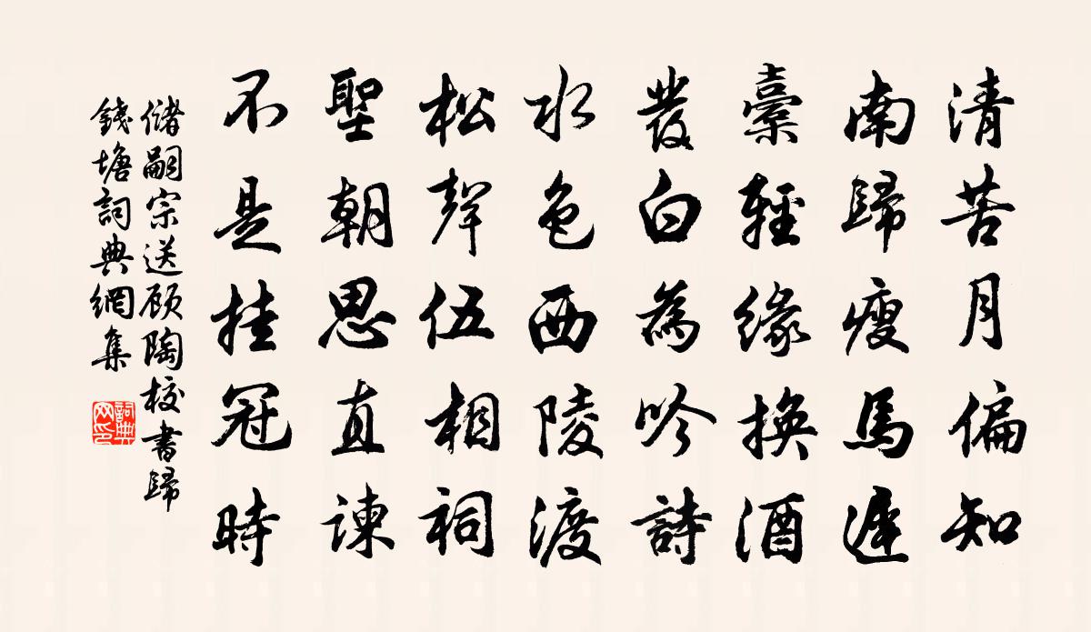 詩詞名句歷史字典書法欣賞書法字典國語詞典說文解字康熙字典古漢語字典標 題 作 者 詩 句 送顧陶校書歸錢塘作者:儲嗣宗 朝代:唐代送顧陶校書歸錢塘原文清苦月偏知,南歸瘦馬遲。橐輕緣換酒,發白為吟詩。水色西陵渡,松聲伍相祠。聖朝思直諫,不是掛冠時。詩詞問答問:送顧陶校書歸錢塘的作者是誰?答:儲嗣宗問:送顧陶校書歸錢塘寫於哪個朝代?答:唐代問:送顧陶校書歸錢塘是什麼體裁?答:五律儲嗣宗送顧陶校書歸錢塘書法欣賞送顧陶校書歸錢塘書法作品注釋全唐詩:卷594-38詩詞推薦賦張袁州隱齋三首度正〔宋代〕少時見敲搒,濈濈背欲汗。及壯事州縣,稍稍覺不憚。由來只一心,今昔非異見。君子遠庖廚,夫豈惡芻豢。長恐枕易連文鳳〔宋代〕身世相忘象外天,清風一枕幾千年。有時默默焚香坐,間看白雲心自玄。雜詠陸游〔宋代〕青羊宮中竹暗天,白馬廟畔柏如山。琴尊處處可消日,車馬紛紛自欠閒,登高涼山謁墓陳廷光〔宋代〕雲氣擁松楸,佳城生意幽。掃殘黃葉路,奠遍綠新篘。想像音容在,瞻衣涕泗流。東遷禱靈墓,端為護行舟。歲除示汝霖三絕胡寅〔宋代〕邂逅遮留閱歲寒,山餚溪蔌且同盤。不憂絕學商量少,只怕新詩屬和難。和蔣宣卿韻吳芾〔宋代〕不將有限逐無涯,聊為尋幽駐使華。千古山川埋劍氣,半空台閣雨天花。終期香火參同社,且賦新詩寄作家。歸晚又和董氏東園檜屏石床司馬光〔宋代〕密葉蕭森翠幕紆,暫來猶恨不長居。脫冠解帶坐終日,花落石床春自如。十六月夜再同子文、巨濟、李叔粲南溪步月楊萬里〔宋代〕際晚溪游暮欲歸,追涼逐勝卻成遲。月如醉眼生紅暈,山作愁眉帶淡姿。天下無人閒似我,秋邊有句說從誰。弟兄緣識宋太宗〔宋代〕予持齋,常清淨,心田澄寂無爭競。聞爾志念誦真經,明月窗中轉孤影。風自悠颺香滿室,因地修行不可得。善事初夏遣悶三絕趙伯溥〔宋代〕運行南陸赤精然,閣外新篁籜未蠲。冉冉綠陰剛晝永,焦桐謾欲繼薰弦。笑題明月池乾隆〔清代〕盤轉山腰至山寺,蒼松怪石清絕倫。寺額明月池三字,尋勝笑昔題非真。一泓椀大隱石罅,日間那乃瞻水輪。設雲臥病寄苗員外李端〔唐代〕故人初未貴,相見得淹留。一自朝天去,因成計日游。月明應獨醉,葉下肯同愁。因恨劉楨病,空園臥見秋。虞美人陳三聘〔宋代〕天公意向人情滿。燈月教同看。中秋雖是十分明。不比今宵處處、有華燈。艷桃穠李歌闌後。更醉青樓酒。不妨飲去郡登舟偶成一絕吳芾〔宋代〕脫得身來上短篷,飄然初試一帆風。孤城回首知何處?只有凌歊在眼中。雪作曾幾〔宋代〕臥聞微霰卻無聲,起看階前又不能。一夜紙窗明似月,多年布被冷於冰。履穿過我柴門客,笠重歸來竹院僧。三白樊將軍廟汪遵〔唐代〕玉輦曾經陷楚營,漢皇心怯擬休兵。當時不得將軍力,日月須分一半明。頌釋元易〔宋代〕撥動乾坤步轉移,南觀北斗有誰知。金烏暮向西山急,曉逐扶桑半夜飛。題郭恕先雪霽江行圖樓鑰〔宋代〕妙絕丹青郭恕先,幻成雪霽大江船。沿流更飽輕帆舉,上水仍勞百丈牽。捩柂長年渾欲動,褰帷佳客若將仙。侍親應製賦射弓詩楊億〔宋代〕水漲方塘綠,花開禁籞紅。同瞻萬乘主,親御六鈞弓。曲應騶虞節,春回太皡功。還須殪大兕,何祇落驚鴻。一箭新秋池上曉望汪宗臣〔宋代〕淨值香來水北,殘蟬聲度橋東。清沚金鱗漾綠,夕陽白鷺翻紅。名句推薦萬里辭家事鼓鼙,金陵驛路楚雲西。劉長卿《送李判官之潤州行營》 葡萄美酒夜光杯,欲飲琵琶馬上催。王翰《涼州詞二首·其一》 綴文者情動而辭發,觀文者披文以入情劉勰《文心雕龍·知音》 火冷燈稀霜露下,昏昏雪意雲垂野。蘇軾《蝶戀花·密州上元》 江山故宅空文藻,雲雨荒台豈夢思。杜甫《詠懷古蹟五首·其二》 山抹微雲,天連衰草,畫角聲斷譙門。秦觀《滿庭芳·山抹微雲》 青山霽後雲猶在,畫出東南四五峰。郎士元《柏林寺南望》 棲鴉流水點秋光,愛此蕭疏樹幾行。紀映淮《詠秋柳》 燕子歸來,雕梁何處,底事呢喃語。王瀾《念奴嬌·避地溢江書於新亭》 天街曾醉美人畔,涼枝移插烏巾。吳文英《夜飛鵲·蔡司戶席上南花》