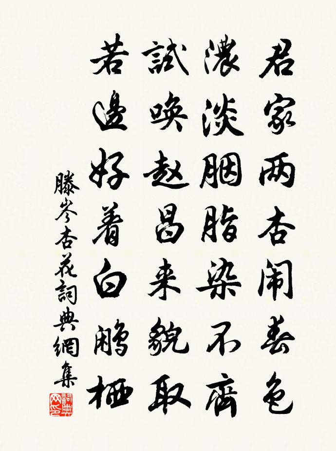 詩詞名句歷史字典書法欣賞書法字典國語詞典說文解字康熙字典古漢語字典標 題 作 者 詩 句 杏花作者:滕岑 朝代:宋代杏花原文君家兩杏鬧春色,濃淡胭脂染不齊。試喚趙昌來貌取,若邊好著白鷳棲。詩詞問答問:杏花的作者是誰?答:滕岑問:杏花寫於哪個朝代?答:宋代滕岑杏花書法欣賞杏花書法作品詩詞推薦蓬萊客 贈譚公子馬鈺〔元代〕人人急。人人海上為船客。為船客。業緣常做,福緣長隔。遇予勸化深宜測。焚燒船綱難功溺。難功溺。福緣善慶雜曲歌辭。甘州佚名〔唐代〕欲使傳訊息,空書意不任。寄君明月鏡,偏照故人心。別曹教授三首裘萬頃〔宋代〕一歲與君三別離,盍簪此去定何時。梅花未必堪相寄,待倩郵筒寄小詩。題項聖尹竹齋曾豐〔宋代〕之君命屯有孤辰,之子德孤無同人。天遣之君友之子,賓主相忘無彼此。出牆春梢道骨輕,侵書晚色天姿清。客來東都賦班固〔兩漢〕東都主人喟然而嘆曰:“痛乎風俗之移人也。子實秦人,矜誇館室,保界河山,信識昭、襄而知始皇矣,烏睹大漢和毛秀才江墅幽居好十首穆修〔宋代〕江墅幽居好,谿山數里長。徑通茶塢綠,門枕橘園香,藉石還勝榻,聽松不讓簧。閒遊驚里巷,自作隱淪裝。和元絳〔宋代〕晼晚年垂盡,陰沈氣始凝。雲霄方一色,霰雪忽相仍。何處茲辰好,吾州自古稱。稽山呈刻畫,鏗水弄鮮澄。佛土寄湖州刁殿丞趙湘〔唐代〕白苹溪湛五亭寒,物象全宜謝守閒。秋盡棋聲過竹寺,雨余詩思落茶山。鳥依高樹和煙宿,人釣清流帶月還。池館祇園寺綦毋潛〔唐代〕寶坊求往跡,神理駐沿洄。雁塔酬前願,王身更後來。加持將暝合,朗悟豁然開。兩世分明見,餘生復幾哉。題柳溪別墅姚孝錫〔宋代〕雨霽風和不動塵,柳邊攜酒賞晴春。頻來溪鳥渾相識,度水穿花不避人。長沙勸耕真德秀〔宋代〕鞠育當知父母恩,弟兄更合識卑尊。孝心盡處通天地,善行多時福子孫。尋孫花翁宋伯仁〔宋代〕東風吹雨濕西湖,未許蘇堤酒剩酤。試向花翁問花訊,不知花似去年無。蘇幕遮 滕奇放龜王哲〔元代〕此神龜,深謝放。厚德深恩,杳杳冥冥廣。毛寶當時還岸賞。答報於公,別有明明相。戲金蓮,通揖讓。千載遐齡詠懷阮籍〔魏晉〕湛湛長江水,上有楓樹林。皋蘭被徑路,青驪逝駸駸。遠望令人悲,春氣感我心。三楚多秀士,朝雲進荒淫。朱華孟子開宰餘杭二首袁說友〔宋代〕畿邑三年令,先聲百里春。公朝勤恤隱,吾道足親民。不作勞人想,猶堪發刃新。從渠清俗論,峨豸已知津。永叔贈酒梅堯臣〔宋代〕大門多奇醞,一斗市錢千。貧食尚不足,欲飲將何緣。豈能以口腹,屈節事豪權。閉戶飽於齏,作詩涌如泉。一日寄五師北山講主釋雲岫〔宋代〕一書不問不相違,指跡慕歸誰救遲。鶯脰湖邊官驛路,舟車十里到鳧磯。菩薩蠻(戲菱生)趙必〔宋代〕紅嬌翠溜歌喉急。舊弦撥斷新腔入。往事水東流。菱花曉帶秋。幃香雙鳳集。清淚層綃濕。殘夢五更頭。酒醒依舊酬發運馬子山少卿惠與詩張先〔宋代〕貢餘應惜點為山,絕唱兼遺致政官。嵰地雪甜多不識,吳人未食齒先寒。水龍吟 中秋和人韻王旭〔元代〕西風萬卷堂空,臥聽簫鼓誰家宴。多情惟有,碧霄明月,肯來相見。因記當年,南樓老子,座前賓滿。把清談當卻名句推薦大難不死,必有後祿。馮夢龍《喻世明言·卷二十一》 仲夏苦夜短,開軒納微涼。杜甫《夏夜嘆》 非知之難,行之為難;非行之難,終之斯難。吳兢《貞觀政要·卷十·論慎終》 日中則昃,月盈則食佚名《易傳·彖傳下·豐》 呵筆難臨帖,敲床且煮茶。大須《暮雪》 帝鄉三千里,杳在碧雲間。李白《登敬亭北二小山余時送客逢崔侍御並登此地》 父不慈則子不孝顏之推《顏氏家訓·治家篇》 遠送從此別,青山空復情。杜甫《奉濟驛重送嚴公四韻》 照花前後鏡,花面交相映。溫庭筠《菩薩蠻·小山重疊金明滅》 如知其非義,斯速已矣,何待來年。孟子《孟子·滕文公章句下·第八節》