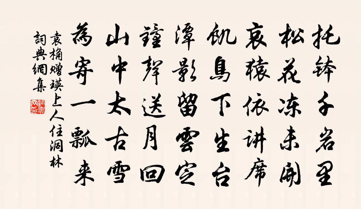 詩詞名句歷史字典書法欣賞書法字典國語詞典說文解字康熙字典古漢語字典標 題 作 者 詩 句 贈瑛上人住洞林作者:袁桷 朝代:元代贈瑛上人住洞林原文托缽千岩里,松花凍未開。哀猿依講席,飢鳥下生台。潭影留雲定,鐘聲送月回。山中太古雪,為寄一瓢來。詩詞問答問:贈瑛上人住洞林的作者是誰?答:袁桷問:贈瑛上人住洞林寫於哪個朝代?答:元代問:贈瑛上人住洞林是什麼體裁?答:五律袁桷贈瑛上人住洞林書法欣賞贈瑛上人住洞林書法作品注釋元詩別裁集詩詞推薦冬日孟郊〔唐代〕老人行人事,百一不及周。凍馬四蹄吃,陟卓難自收。短景仄飛過,午光不上頭。少壯日與輝,衰老日與愁。日愁和柯東海趣歸韻陳宓〔宋代〕塵土三年事一官,歸心如馬脫鞿鞍。莫嫌頭髮半斑白,留得雙眸看歲寒。偈頌一百二十三首釋崇岳〔宋代〕是即全是,非即全非。大用現前,攜手同歸,不知猶自涉離微。追次郡君至節韻方回〔宋代〕天地育萬物,風霜非作威。陰陽互闔辟,造化潛玄機。凍樹根本固,宿莽芽甲微。外貌若杭死,其中春已歸。志士好事近(詠梅)陳亮〔宋代〕的皪兩三枝,點破暮煙蒼碧。好在屋檐斜入,傍玉奴橫笛。月華如水過林塘,花陰弄苔石。欲向夢中飛蝶,恐幽香偈頌一百一十七首釋紹曇〔宋代〕一二三四五,六七 * 十。梵語華言譯不成,玉幾重新添註解。安義炳然,無人鄰解。賴有同風知,點頭道奇怪。滿庭芳馬子嚴〔宋代〕共慶春時,滿庭芳思,一枝心蕊非常。少年遊冶,何但折垂楊。曾向瑤台月下,逢解佩、玉女翻香。風光好,真珠醉中留別楊六兄弟 三月二十日別。白居易〔唐代〕春初攜手春深散,無日花間不醉狂。別後何人堪共醉,猶殘十日好風光。寄慈谿赭山寺主僧如岳陳著〔宋代〕薄俗久淪胥,交心獨抱初。孤岑千嶂外,兩載幾行書。歲晚梅花瘦,江空雁影疏。相逢不相見,近況定何如。偈頌十七首釋智愚〔宋代〕朝朝相似,日日一般。見面受用,千難萬難。因思臨濟掌黃檗,何以華亭把釣竿。鷓鴣天(繞花台)何澹〔宋代〕庾嶺移來傍桂業。繞花安敢望凌風。癯儒合作孤芳伴,四面相看一笑同。冰照座,玉橫空。雪花零落暗香中。有人朝中措王炎〔宋代〕杜鵑聲斷日曈曨。過雨濕殘紅。老色菱花影里,客愁蕉葉香中。柳梢飛絮,桃梢結子,斷送春風莫恨春無覓處,明沁園春毛滂〔宋代〕秀稟元精,靈鍾崧岳,命世大賢。自飛英任路,承流百里,郎官星彩,輝映經躔。勁柏凌霜,香梅嬌雪,珪月彎彎送趙一叔江西漕赴召三首趙蕃〔宋代〕兩載皇華使,江湖得少寬。見皆儒雅錄,聞絕惠文彈。內外有輕重,言行無易難。春秋賢者責,傾耳向長安。頌古一百二十一首釋宗杲〔宋代〕趙州有密語,文遠不覆藏。演出大藏教,功德實難量。楊柳枝詞九首劉禹錫〔唐代〕塞北梅花羌笛吹,淮南桂樹小山詞。請君莫奏前朝曲,聽唱新翻楊柳枝。南陌東城春早時,相逢何處不依依?桃紅歲晚雜興王同祖〔宋代〕撥盡寒灰恨轉添,不知片雪點疏簾。梅花帳冷爐煙歇,架上黃庭信手拈。鱸鄉亭林肇〔宋代〕膾鱸珍味是吳鄉,丞相曾過賦短章。新作水齋堪寓目,舊停桂棹有餘光。滿前野景煙波闊,自後秋風意氣長。莫待九月二十日微雪懷子由弟二首蘇軾〔宋代〕岐陽九月天微雪,已作蕭條歲暮心。短日送寒砧杵急,冷官無事屋廬深。愁腸別後能消酒,白髮秋來已上簪。近買春日迓新使君周南〔宋代〕半生窮巷抱遺經,多謝諸公說姓名。四十頭顱成底事,五更炊黍學將迎。名句推薦君子欲訥於言而敏於行。孔子弟子《論語·里仁篇》 記得短亭歸馬,暮衙蜂鬧。吳文英《天香·蠟梅》 孫郎微笑,坐來聲噴霜竹黃庭堅《念奴嬌·斷虹霽雨》 風吹古木晴天雨,月照平沙夏夜霜。白居易《江樓夕望招客》 梅子金黃杏子肥,麥花雪白菜花稀。范成大《四時田園雜興·其二》 萬里秋光客興賒,同人九日惜年華。沈輅《九日登高台寺》 山暝聞猿愁,滄江急夜流。孟浩然《宿桐廬江寄廣陵舊遊》 客子光陰詩卷里,杏花訊息雨聲中。陳與義《懷天經智老因訪之》 江帆幾片疾如箭,山泉千尺飛如電周德清《塞鴻秋·潯陽即景》 群山萬壑赴荊門,生長明妃尚有村。杜甫《詠懷古蹟五首·其三》