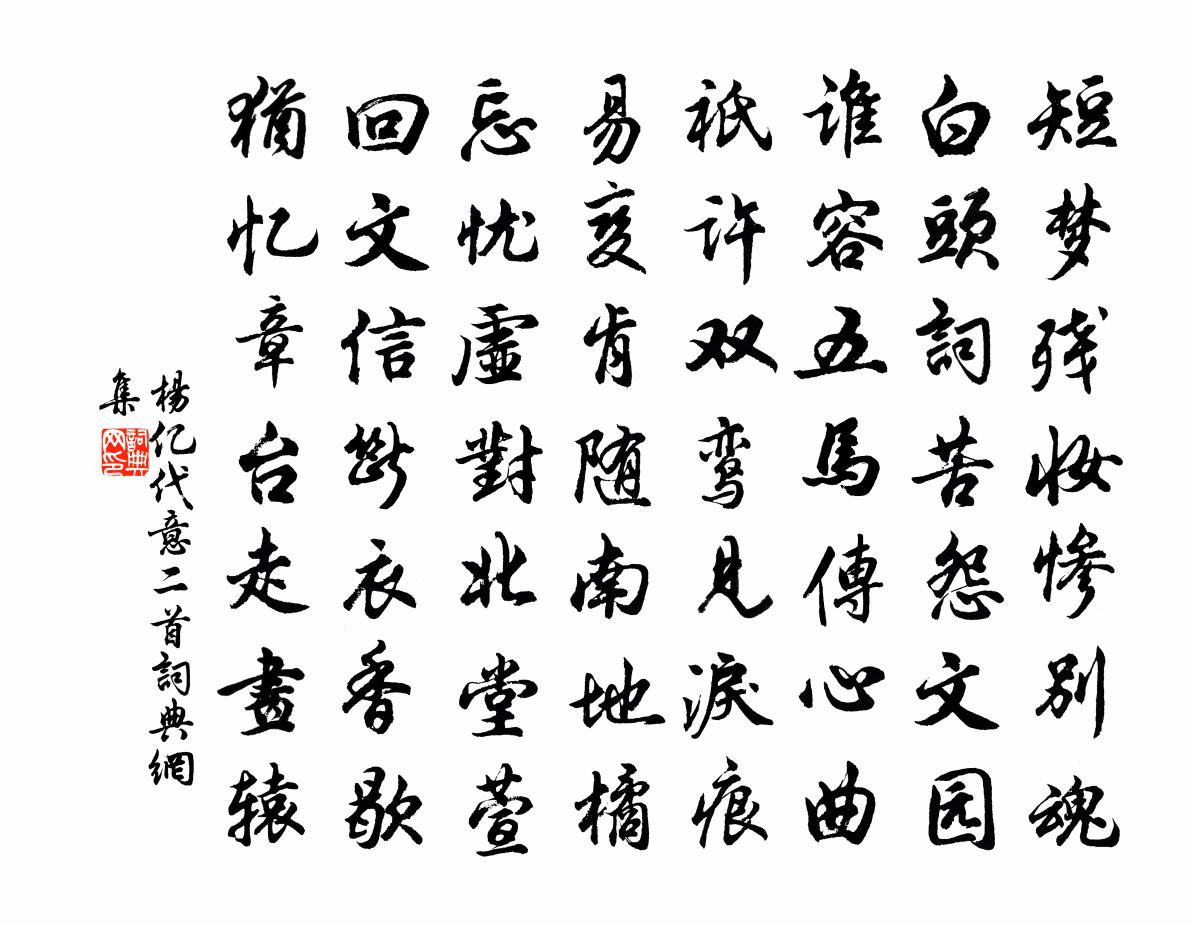 詩詞名句歷史字典書法欣賞書法字典國語詞典說文解字康熙字典古漢語字典標 題 作 者 詩 句 代意二首作者:楊億 朝代:宋代代意二首原文短夢殘妝慘別魂,白頭詞苦怨文園。誰容五馬傳心曲,祇許雙鸞見淚痕。易變肯隨南地橘,忘憂虛對北堂萱。回文信斷衣香歇,猶憶章台走畫轅。詩詞問答問:代意二首的作者是誰?答:楊億問:代意二首寫於哪個朝代?答:宋代問:代意二首是什麼體裁?答:七律楊億代意二首書法欣賞代意二首書法作品詩詞推薦飛雲樓王邁〔宋代〕亭前一望水東流,更有雄樓在上頭。燕子飛來春漠漠,鴟夷仙去水悠悠。神交故國三千里,目斷中原四百州。日暮十月中浣酒熟客至分韻得菊字方回〔宋代〕亂離脫此生,真復類殘菊。嚴霜百草死,愧我一影獨。鄉鄰豪奪兒,豈不金滿屋。或乃盜賊起,全家被屠戮。賈禍飲後戲示弟子白居易〔唐代〕吾為爾先生,爾為吾弟子。孔門有遺訓,復坐吾告爾。先生饌酒食,弟子服勞止。孝敬不在他,在茲而已矣。欲我奉和江沖陶居二十韻汪炎昶〔宋代〕清冷泉飛,蕭然瑟松風到。雖未計宮商,總是沖陶操。御溝水盧肇〔唐代〕萬壑朝溟海,縈迴歲月多。無如此溝水,咫尺奉天波。涼州詞孟浩然〔唐代〕渾成紫檀金屑文,作得琵琶聲入雲。胡地迢迢三萬里,那堪馬上送明君。異方之樂令人悲,羌笛胡笳不用吹。坐看好事近李之儀〔宋代〕相見兩無言,愁恨又還千疊。別有惱人深處,在懵騰雙睫。七弦雖妙不須彈,惟願醉香頰。只恐近來情緒,似風前送顏處士還長沙覲省皎然〔唐代〕西候風信起,三湘孤客心。天寒漢水廣,鄉遠楚雲深。服彩將侍膳,擷芳思滿襟。歸人忘艱阻,別恨獨何任。夢稚子司馬光〔宋代〕窮泉織骨已成塵,幽草閒化二十春。昔日相逢猶是夢,今宵夢裡更非真。扶病春亭劉言史〔唐代〕強梳稀發著綸巾,舍杖空行試病身。花間自欲裴回立,稚子牽衣不許人。甘露寺遭火蔡肇〔宋代〕聚墨魔宮殿,毗嵐 * 天。劫灰迷狠石,鉛水泫銅仙。扁榜無佳句,華榱有勝緣。大江春正碧,白晝島夷船。和仁仲春日十絕胡寅〔宋代〕洛陽風俗事栽花,流水園林眇一涯。移得舊根春不老,錯疑蜂蝶過鄰家。雁兒落過得勝令·憶別喬吉〔元代〕殷勤紅葉詩,冷淡黃花市。清江天水箋,白雁雲煙字。遊子去何之?無處寄新詞。酒醒燈昏夜,窗寒夢覺時。尋思古意宋祁〔宋代〕薄宦若秋帶,飄然去林枝。盲風不我愛,吹墮清淮湄。淮南苦憀慄,九月繁霜飛。晚蕙相為嘆,崇蘭偕此衰。凋落甘露歌王安石〔宋代〕折得一枝香在手。人間應未有。疑是經春雪未消。今日是何朝。代書示逸二首趙蕃〔宋代〕別日才留兩月糧,況經裘葛變炎涼。未知別後端何似,不見寄來書一行。故人許月卿〔宋代〕故人歸作山中相,老我聊乘雪夜舟。細君頗訝不入市,山中訪友將何求。扉屨資糧奪之去,毀車截鐙挽予留。一笑惜落花贈崔二十四白居易〔唐代〕漠漠紛紛不奈何,狂風急雨兩相和。晚來悵望君知否?枝上稀疏地上多。江總徐鈞〔宋代〕結綺臨春無處尋,人皆歸罪主荒淫。誰知文體傷輕艷,狎客迎逢罪更深。贈玻璃僧慧觀長老敖陶孫〔宋代〕千年觀一如,三日客同居。祗道清淮近,烏知濁世疏。地窮初限橘,水富巧藏魚。排闥風煙入,觀心視聽虛。飯香名句推薦雨過一蟬噪,飄蕭松桂秋。杜牧《題揚州禪智寺》 幅巾藜杖北城頭,捲地西風滿眼愁。陸游《秋晚登城北樓》 白髮書生神州淚,盡淒涼、不向牛山滴劉克莊《賀新郎·九日》 舊苑荒台楊柳新,菱歌清唱不勝春。李白《蘇台覽古》 十年花骨東風淚,幾點螺香素壁塵。史達祖《鷓鴣天·搭柳欄乾倚佇頻》 青女素娥俱耐冷,月中霜里斗嬋娟。李商隱《霜月》 似醉煙景凝,如愁月露泫。崔護《五月水邊柳》 藍橋何處覓雲英。只有多情流水、伴人行。蘇軾《南歌子·寓意》 明月照積雪,朔風勁且哀。謝靈運《歲暮》 獻賦十年猶未遇,羞將白髮對華簪。錢起《贈闕下裴舍人》