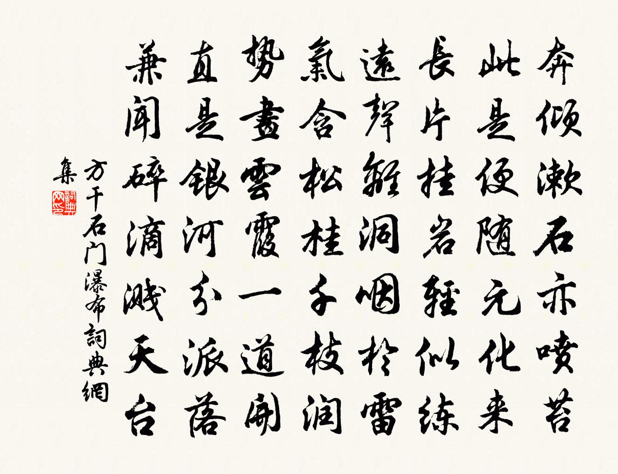 詩詞名句歷史字典書法欣賞書法字典國語詞典說文解字康熙字典古漢語字典標 題 作 者 詩 句 石門瀑布作者:方乾 朝代:唐代石門瀑布原文奔傾漱石亦噴苔,此是便隨元化來。長片掛岩輕似練,遠聲離洞咽於雷。氣含松桂千枝潤,勢畫雲霞一道開。直是銀河分派落,兼聞碎滴濺天台。詩詞問答問:石門瀑布的作者是誰?答:方乾問:石門瀑布寫於哪個朝代?答:唐代問:石門瀑布是什麼體裁?答:七律方乾石門瀑布書法欣賞石門瀑布書法作品注釋全唐詩:卷652-38詩詞推薦挽端州黃大用大用喜讀書有志行數過予講討雖胡寅〔宋代〕鋸屑霏談涉往今,濡毫灑紙掞詞林。聽歌鹿野三章後,帳下龍門九曲深。十口西疇貧縈莫,一官南選晚侵尋。早知雙雙燕王吉昌〔元代〕循環日月,春秋變榮枯,幾多相綴。唐朝漢闕,楚苑秦宮興替。愛海淪流何定,盡蕩蕩、無生淹滯。驚回浩劫塵情和徐徑坂帛詩韻並約徐立大同賦趙汝騰〔宋代〕謁想仙姿詩見之,壇高屈宋隸吾麾。在邦無怨仁何怨,與世多違道不違。一魯丈夫獨儒服,百曹相國漫戎衣。折衝船子贊釋師體〔宋代〕孤蹤短艇寓江濱,眼蓋乾坤徹骨貧。接了夾山鑽入水,至今恩怨不曾分。奉報翰林張舍人見遺之詩孟郊〔唐代〕百蟲笑秋律,清削月夜聞。曉棱視聽微,風剪葉已紛。君子鑒大雅,老人非俊群。收拾古所棄,俯仰補空文。孤韻櫻桃楊億〔宋代〕團於火色貝,燦極日光珠。西海瑤池苑,曾城寶樹區。鳳幘生猶嫩,龍睛未脫枯。彤標與霞彩,紫府閟雪腴。題瘦牛嶺楊萬里〔宋代〕牛頭定何向,牛尾定何指。我不炙汝心,我不穿汝鼻。如何不許見全牛?霧隱雲藏若相避。行行上牛背,上下三十九日送人陳顏〔宋代〕今夕遂獨坐,今晨已別離。同此良宵中,秋意各自知。灩灩潮與汐,來往亦何為。嗟爾扁舟子,何時老藩籬。游博羅香積寺蘇軾〔宋代〕二年流落蛙魚鄉,朝來喜見麥吐芒。東風搖波舞淨綠,初日泫露酣嬌黃。汪汪春泥已沒膝,剡剡秋谷初分秧。誰言曾夔州座右山水圖晁公溯〔宋代〕華堂左右皆山川,登堂一見心茫然。松林忽在素壁上,几杖卻對陰崖前。百年老樹橫高枝,正當太古陰雲垂。近前畫像題詩杜甫〔唐代〕迎旦東風騎蹇驢,旋呵凍手暖髯須。洛陽無限丹青手,還有功夫畫我無? 贈琴客齊己〔唐代〕曾攜五老峰前過,幾向雙松石上彈。此境此身誰更愛,掀天羯鼓滿長安。贈僧朝美李白〔唐代〕水客凌洪波,長鯨涌溟海。百川隨龍舟,噓吸竟安在。中有不死者,探得明月珠。高價傾宇宙,餘輝照江湖。苞卷圓機游秦州有詩相寄輒次韻作晁說之〔宋代〕風雨關心一夢難,欲於何地見征鸞。街亭應念貶三等,壠坻須憐持兩端。休聽鼓鼙參將幕,已驚鉛槧誤儒冠。瑤音萬峰庵黃登〔宋代〕上到山巔曉色分,眼看殘月待朝昕。望迷四雇渾如海,立欲移時只是雲。隱隱樓台平地見,行行鐘磬半天聞。舉頭朝陽對月贊釋智遇〔宋代〕寒暑不到處,山窮石自枯。涕零知骨冷,隨分著工夫。一卷無題目,持傍石根叫。眼昏嫌字小,華梵恐難分。幽居雜題陸游〔宋代〕雅意元知止,遄歸喜遂初。久閒棋格長,多病釣徒疏。漬藥三升酒,支頭一束書。兒曹看翁嬾,切勿厭蝸廬。洪橋客窗枕上陳郁〔宋代〕桐葉飄零月似冰,並河燈火夜寒生。闌乾倦倚投床去,臥聽趨朝過馬聲。挽故眉守張廷琛史堯弼〔宋代〕公典吾州日,人懷不忍欺。轅攀那復得,巷哭竟成悲。外祖松楸在,空山草木萎。魂游儻來否,尚作凱風思。經七里灘①孟浩然〔唐代〕余奉垂堂誡,千金非所輕。②為多山水樂,頻作泛舟行。五嶽追尚子,三湘吊屈平。③湖經洞庭闊,江入新安清。名句推薦漢帝重阿嬌,貯之黃金屋。李白《妾薄命》 松江上,念故人老矣,甘臥閒雲。吳文英《沁園春·送翁賓暘游鄂渚》 嘆人間,美中不足今方信。縱然是齊眉舉案,到底意難平。曹雪芹《紅樓夢·第五回》 德之不修,學之不講,聞義不能徙,不善不能改,是吾憂也。孔子弟子《論語·述而篇》 獨自上層樓,樓外青山遠。程垓《卜運算元·獨自上層樓》 命隨年欲盡,身與世俱忘;文天祥《除夜》 傷心枕上三更雨,點滴霖霪。李清照《添字醜奴兒·窗前誰種芭蕉樹》 君子不器。孔子弟子《論語·為政篇》 餘霞散成綺,澄江靜如練。謝朓《晚登三山還望京邑》 花繁柳密處,撥得開,才是手段;風狂雨急時,立得定,方見腳根。陳繼儒《小窗幽記·集醒篇》