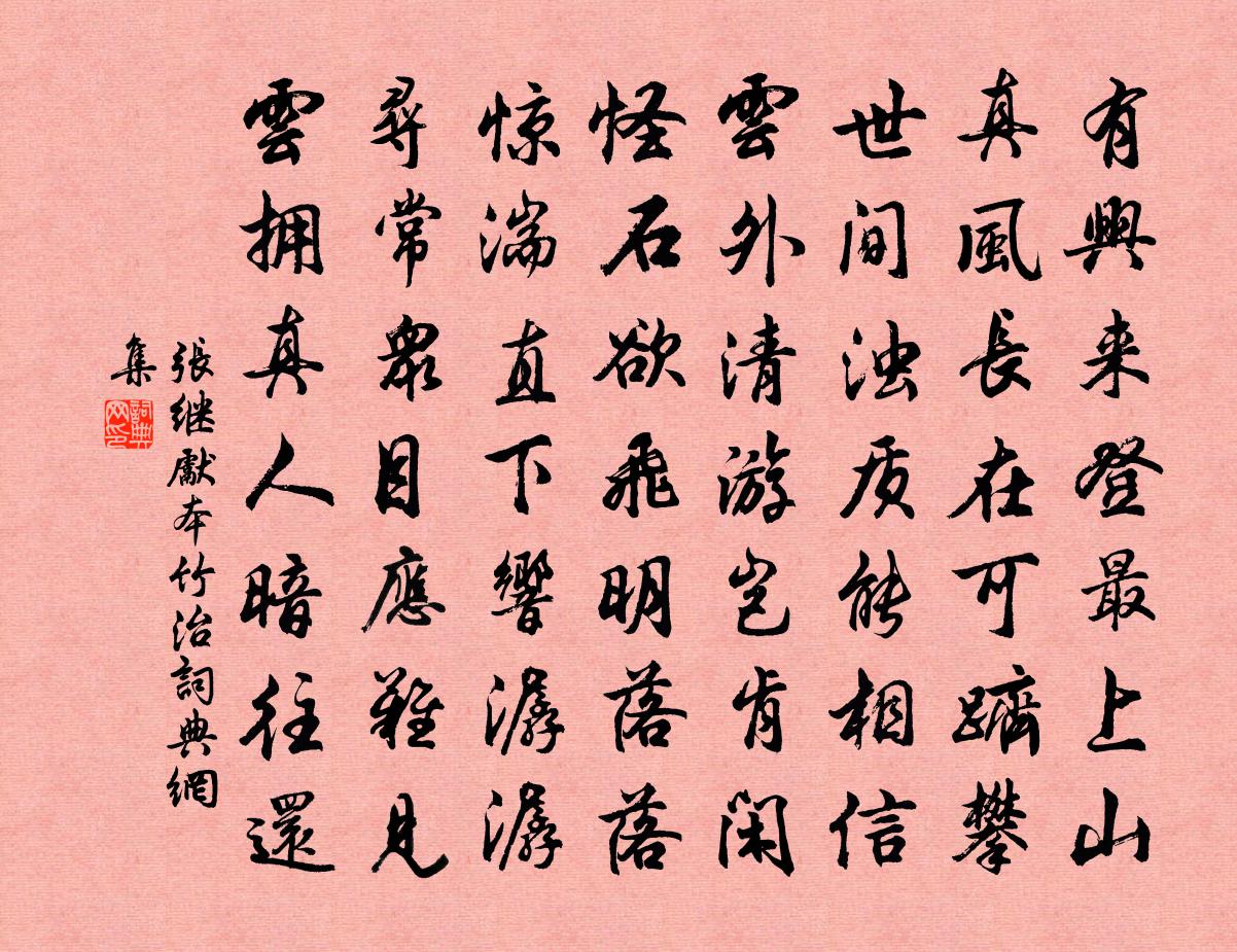詩詞名句歷史字典書法欣賞書法字典國語詞典說文解字康熙字典古漢語字典標 題 作 者 詩 句 本竹治作者:張繼先 朝代:宋代本竹治原文有興來登最上山,真風長在可躋攀。世間濁質能相信,雲外清游豈肯閒。怪石欲飛明落落,驚湍直下響潺潺。尋常眾目應難見,雲擁真人暗往還。詩詞問答問:本竹治的作者是誰?答:張繼先問:本竹治寫於哪個朝代?答:宋代張繼先本竹治書法欣賞本竹治書法作品詩詞推薦碧桃花歌為王丞作戴表元〔宋代〕君不見孔家藏書屋,屋壞猶聞起絲竹。又不見鄭家注書老,書帶後來垂作草。如今王家萬卷文字林,桃花一樹春沈和君倚日本刀歌司馬光〔宋代〕昆吾道遠不復通,世傳切玉誰能窮。寶刀近出日本國,越賈得之滄海東。魚皮裝巾香木鞘,黃白間雜鍮與銅。百金秋懷閻寬〔唐代〕下帷長日盡,虛館早涼生。芳草猶未薦,如何蜻蛚鳴。秋風已振衣,客去何時歸。為問當途者,寧知心有違。漁父/漁歌子陸游〔宋代〕石帆山下雨空濛。三扇香新翠箬篷。苹葉綠,蓼花紅。回首功名一夢中。南山雪王令〔宋代〕世於利祿不擇義,苟可走奪足恐蹉。家儲千金吝銖兩,不敢盡費烏用多。百年到死財幾日,恃若固有理則那。莊生湖上成絕句呈劉伯聲四首張耒〔宋代〕誰道原頭春未回,柳梢黃軟凍齊開。爭驚臘日崢嶸盡,忽問田翁乞野梅。鵲橋仙朱彝尊〔清代〕辛夷花落,海棠風起,朝雨一番新過。狸奴去後繡墩溫,且伴 * 長閒坐。笑言也得,欠伸也得,行處丹鞋婀娜。二禽方戲贈難弟歸歸歸趙孟堅〔宋代〕歸歸歸,三月將盡方始啼。木林翠密陰成幄,花片紅嫣風盪飛。歸歸歸,汝既勸歸胡不歸。歸來深院日正長,煮酒賦得沙際路,送從叔象韋應物〔唐代〕獨樹沙邊人跡稀,欲行愁遠暮鍾時。野泉幾處侵應盡,不遇山僧知問誰。關試後筵上別同人杜荀鶴〔唐代〕日午離筵到夕陽,明朝秦地與吳鄉。同年多是長安客,不信行人慾斷腸。寄劉泗州黃庭堅〔宋代〕萬馬千艘要路津,禪翁新畫兩朱輪。行春定得忘言對,金碧浮圖何姓人。小亭落成都官有詩次韻以謝洪皓〔宋代〕我被儒冠誤此身,公緣何事作流人。瓊葩乍折香勝雪,玉版初嘗暖似春。月桂他年應獨拍,瓊林今日遂重新。披襟送朱山人放越州,賊退後歸山陰別業劉長卿〔唐代〕越州初罷戰,江上送歸橈。南渡無來客,西陵自落潮。空城垂故柳,舊業廢春苗。閭里相逢少,鶯花共寂寥。再賦紅梅王洋〔宋代〕比玉比冰俱未切,恰是紅兒兼比雪。東君主掌不堅牢,也作堪憐也堪折。送畢甥之臨邛主簿雜言梅堯臣〔宋代〕自我歷官三十年,有腳未曾行蜀川。李白嘗言道之艱險,長嗟難劇上青天。鳥悲猿嚎馬蹄脫,苔梯雨棧愁傾顛。蒼後九首劉克莊〔宋代〕默默回光反照,津津勿藥有喜。八荒入吾闥中,四海在我牆裡。偈二十二首釋洵〔宋代〕昔人三箭定天山,自謂英雄蓋世間。何似雪峰一隻箭,等閒穿過石門關。至分陝駱賓王〔唐代〕陝西開勝壤,召南分沃疇。列樹巢維鵲,平渚下睢鳩。憩棠疑勿剪,曳葛似攀樛。至今王化美,非獨在隆周。漁村雜句十首薛嵎〔宋代〕野水微茫路欲迷,重重沙渚自高低。鷺鸞飛過無心泊,直入殘陽樹杪棲。代內蘇泂〔宋代〕孟光書寄與梁鴻,薪粲年年幸可同。觸熱忘歸渾細事,笑人應有北窗風。名句推薦人生如寄,何事辛苦怨斜暉。朱熹《水調歌頭·隱括杜牧之齊山詩》 慈母手中線,遊子身上衣。孟郊《遊子吟 / 迎母漂上作》 童孫未解供耕織,也傍桑陰學種瓜。范成大《夏日田園雜興·其七》 今歲早梅開,依舊年時月。張孝祥《卜運算元·雪月最相宜》 得其所利,必慮其所害;樂其所成,必顧其所敗。劉向《說苑·敬慎》 河水洋洋,北流活活詩經《碩人》 有孫母未去,出入無完裙。杜甫《石壕吏》 誰知萬里客,懷古正躊躕。陳子昂《峴山懷古》 勾引東風,也知芳思難禁。韓疁《高陽台·除夜》 中原事業如江左,芳草何須怨六朝。納蘭性德《秣陵懷古·山色江聲共寂寥》