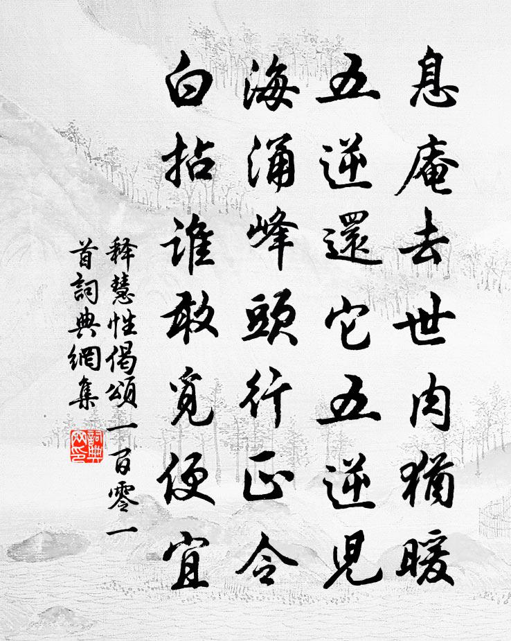 詩詞名句歷史字典書法欣賞書法字典國語詞典說文解字康熙字典古漢語字典標 題 作 者 詩 句 偈頌一百零一首作者:釋慧性 朝代:宋代偈頌一百零一首原文息庵去世肉猶暖,五逆還它五逆兒。海涌峰頭行正令,白拈誰敢覓便宜。詩詞問答問:偈頌一百零一首的作者是誰?答:釋慧性問:偈頌一百零一首寫於哪個朝代?答:宋代釋慧性偈頌一百零一首書法欣賞偈頌一百零一首書法作品詩詞推薦和馬伯庸尚書四絕句王邁〔宋代〕絲絲垂柳拂金溝,學就宮娃舞態柔。莫遣落紅飄一點,長門春色不禁愁。浣沙溪/浣溪沙黃升〔宋代〕鍾磬泠泠夜未央。梨花庭院月如霜。步虛聲里拜瑤章。紫極清都雲渺渺,紅塵濁世事茫茫。未知誰有返魂香。台上(得涼字)杜甫〔唐代〕改席台能迥,留門月復光。雲行遺暑濕,山谷進風涼。老去一杯足,誰憐屢舞長。何須把官燭,似惱鬢毛蒼。讀曾景建四詩羅椅〔宋代〕騷客詩翁死有靈,君行亦足慰飄零。甫雲來共長沙醉,原謂何如澤畔醒。一瓣誰堪續香供,四詩今擬當埋名。黃花贈李子永泳趙蕃〔宋代〕漫刺平生不妄投,不知我者謂何求。平生願作李君御,問事況聞他秩抽。驛舍夜涼陪麈尾,野田風晚從遨頭。可嗟登樓釋紹嵩〔宋代〕二月春方好,登樓望欲迷。關情山簇簇,餘思草萋萋。小浦依林曲,長天向水低。鄉心正無限,恰恰一鶯啼。驃國樂-欲王化之先邇後遠也(貞元十七年來獻之)白居易〔唐代〕驃國樂,驃國樂,出自大海西南角。雍羌之子舒難陀,來獻南音奉正朔。德宗立仗御紫庭,黈纊不塞為爾聽。玉螺祥符寺得句許必勝〔宋代〕安蔬自足慰平生,峰靜松閒澗水平。山意悟時僧不語,落花聲間梵音清。山中李涉〔唐代〕無奈牧童何,放牛吃我竹。隔林呼不應,叫笑如生鹿。欲報田舍翁,更深不歸屋。又即事四首劉克莊〔宋代〕塞氛未靜鐵衣寒,愁絕江南庾子山。誰使石郎捐一道,僅聞柴氏復三關。西當太白餘孤壘,北望神州隔幾寰。猶憶村捨得近報有感陸游〔宋代〕莫謂山村僻,時聞詔令傳。寬民除宿負,募士戍新邊。霜重瓦欲裂,月明人少眠。殘年抱遺恨,終媿祖生鞭。奉和人日宴大明宮恩賜彩縷人勝應制馬懷素〔唐代〕日宇千門平旦開,天容萬象列昭回。三陽候節金為勝,百福迎祥玉作杯。就暖風光偏著柳,辭寒雪影半藏梅。何幸送王錄事卻歸華陰岑參〔唐代〕相送欲狂歌,其如此別何。攀轅人共惜,解印日無多。仙掌雲重見,關門路再過。雙魚莫不寄,縣外是黃河。與政仲端夫敬叟季仙至舊圃采采芙蓉金菊之妙劉學箕〔宋代〕秋陽杲杲秋月明,秋風泠冷秋露沮。蕭騷池上萬松竹,鳳笙龍管吹秋聲。山亭與客坐夕陰,眼照萬象前橫陳。一年贈秘書王監丞文天祥〔宋代〕君不見秘書外監賀放翁,鏡湖一曲高清風。又不見太子師傅兩疏氏,東門祖帳羅群公。人生晚節良不易,頹波下下念奴嬌(八月十三夜,與宋卿對月賞桂花于光遠庵,和李漢老詞)佚名〔宋代〕素秋向晚,正洞庭木落,疏林凋綠。惟有岩前雙桂樹,翠葉香浮金粟。皓月飛來,徘徊樹杪,光射林間屋。夜深人過樓觀李尊師(一作過李尊師院)盧綸〔唐代〕城闕望煙霞,常悲仙路賒。寧知樵子徑,得到葛洪家。犬吠松間月,人行洞裡花。留詩千歲鶴,送客五雲車。訪世奉和聖制答張說南出雀鼠谷崔翹〔唐代〕硤路繞河汾,晴光拂曙氛。笳吟中嶺樹,仗入半峰雲。頓覺山原盡,平看邑里分。早行芳草迥,晚憩好風熏。嘉頌奉和襲美太湖詩二十首崦里陸龜蒙〔唐代〕山橫路若絕,轉楫逢平川。川中水木幽,高下兼良田。溝塍墮微溜,桑柘含疏煙。處處倚蠶箔,家家下魚筌。騃犢句孫信臣〔宋代〕王粲初開井,山翁舊醉池。林掩羊公廟,淵沈杜預碑。名句推薦酒闌更喜團茶苦,夢斷偏宜瑞腦香。李清照《鷓鴣天·寒日蕭蕭上瑣窗》 若問相思甚了期,除非相見時。晏幾道《長相思·長相思》 黃鳥翩翩楊柳垂,春風送客使人悲。高適《東平別前衛縣李寀少府 / 送前衛縣李宷少府》 以天下為沈濁,不可與莊語。莊子《莊子·雜篇·天下》 晝短苦夜長,何不秉燭游!佚名《生年不滿百》 馬影雞聲,諳盡倦郵荒館。張翥《陌上花·有懷》 寺憶曾游處,橋憐再渡時。杜甫《後游》 雨落不上天,水覆難再收。李白《妾薄命》 風光人不覺,已著後園梅。史青《應詔賦得除夜》 湖上春來似畫圖,亂峰圍繞水平鋪。白居易《春題湖上》