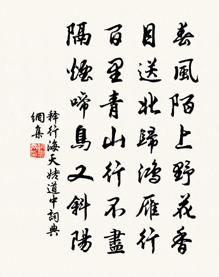 詩詞名句歷史字典書法欣賞書法字典國語詞典說文解字康熙字典古漢語字典標 題 作 者 詩 句 天姥道中作者:釋行海 朝代:宋代天姥道中原文春風陌上野花香,目送北歸鴻雁行。百里青山行不盡,隔煙啼鳥又斜陽。詩詞問答問:天姥道中的作者是誰?答:釋行海問:天姥道中寫於哪個朝代?答:宋代釋行海天姥道中書法欣賞天姥道中書法作品詩詞推薦赴洛道中作詩陸機〔魏晉〕總轡登長路。嗚咽辭密親。借問子何之。世網嬰我身。永嘆遵北渚。遺思結南津。行行遂已遠。野途曠無人。山澤送滑道人游廬山蘇頌〔宋代〕康王觀里采芝田,董奉家邊種杏壇。雙屩一筇行到處,應尋岩室養神丹。哭張融耿湋〔唐代〕早歲能文客,中年與世違。有家孀婦少,無子吊人稀。繐帳塵空暗,銘旌雨不飛。依然舊鄉路,寂寞幾回歸。沁園春晁端禮〔宋代〕絡緯催涼,斷虹收雨,庭梧報秋。繞郡城、千頃煙波綠,正魚肥酒美,名冠東州。芰荷風細,蒹葭煙淡,宛在瀟湘西省北院新構小亭種竹開窗東通騎省…隔窗小飲各題四韻白居易〔唐代〕結托白須伴,因依青竹叢。題詩新壁上,過酒小窗中。深院晚無日,虛檐涼有風。金貂醉看好,回首紫垣東。送僧釋可士〔宋代〕一缽即生涯,隨緣度歲華。是山皆有寺,何處不為家。笠重吳天雪,鞋香楚地花。他年訪禪室,寧憚路岐賒。述九頌經文程公許〔宋代〕天不椓兮斯文,寄命脈兮哲人。爛鹹陽兮焰虐,不可燬兮六經。苟日月兮可晦,何天地兮長存。言不文兮行不遠,華亭十詠秦始皇馳道唐詢〔宋代〕秦德衰千祀,江演道不修。相傅大堤在,曾是翠華游。玉趾如將見,金椎豈復留。悵然尋舊跡,蔓草蔽荒丘。五柳先生傳陶淵明〔魏晉〕先生不知何許人也,亦不詳其姓字,宅邊有五柳樹,因以為號焉。閒靜少言,不慕榮利。好讀書,不求甚解;每有玉樓春(五之二·大石調)柳永〔宋代〕鳳樓鬱郁呈嘉瑞。降聖覃恩延四裔。醮台清夜洞天嚴,公宴凌晨簫鼓沸。保生酒勸椒香膩,延壽帶垂金縷細。幾行楊廷秀秘監萬花川谷中洛花甚富乃用野人韻為周必大〔宋代〕萬花川谷第芳菲,也許湘靈媵伏妃。翠葉迎風牽荇帶,紅綃浴日濕宮衣。共船不妒龍陽釣,警乘猶疑洛渚飛。誰把點絳唇(五月二日,和昌甫所寄,並簡叔通)韓淲〔宋代〕竹隱高深,夏涼日有清風度。薴衣繩屨。鶴髮空相顧。翠撲流煙,又向溪翁去。青山路。要當同住。長占無塵處。送別釋永頤〔宋代〕送別春湖動客心,荇花無浪颭寒金。晴山望極連江郡,沙鳥風檣度遠林。含鄱口曹龍樹〔清代〕高空誰劈紫金芙,遠水長天手可揄。擬似巨鯨張海口,兩江不吸吸翻湖。次韻舍弟題牛氏園二首黃庭堅〔宋代〕春與園林共晚,人將蜂蝶俱來。樽前鳥歌花舞,歸路星翻漢回。送光後堂釋祖欽〔宋代〕春風惡,春風惡,一夜梅花盡吹落。人來話別欲游吳,踏斷東南天一角。【雙調】清江引 苕溪徐再思〔元代〕駝風兩橋分燕尾,人物風流地。白雲四面山,明月雙溪水,身在董元圖畫裡。 盤龍寺 山僧定回月半吐,叱吒冬日雜興王偘〔宋代〕澤國風饕霜力緊,黃落凋殘碧成錦。最憐柿葉與楓林,平園物色正瀟凜。造化不翕何所張,獨怪廷朝漏融景。天理沁園春(壬寅餞余宣諭入蜀)李曾伯〔宋代〕畫舸呼風,長劍倚天,半哉此行。指洞庭彭蠡,遍觀吳楚,瞿塘灩澦,直上峨岷。帝語春溫,軍聲秋肅,手濟時屯偶詠不才明主棄多病故人疏之句感孟浩然事作趙蕃〔宋代〕吾評孟浩然,雅意作詩人。死經四百載,賦詩名愈新。爵祿豈不賞,不義寧賤貧。身雖遭放還,未必非得亡。名句推薦柳葉隨歌皺,梨花與淚傾。黃庭堅《南歌子·槐綠低窗暗》 朽木不可雕也,糞土之牆不可圬也!佚名《宰予晝寢》 驅雞上樹木,始聞叩柴荊。杜甫《羌村三首·其三》 金柳搖風樹樹,系彩舫龍舟遙岸。柳永《破陣樂·露花倒影》 開荒南野際,守拙歸園田。陶淵明《歸園田居·其一》 一片春愁待酒澆。江上舟搖,樓上簾招。蔣捷《一剪梅·舟過吳江》 投我以桃,報之以李。即此言愛人者必見愛也,而惡人者必見惡也。墨子《墨子·16章 兼愛(下)》 問別來、解相思否。吳文英《惜秋華·七夕前一日送人歸鹽官》 惱亂橫波秋一寸。斜陽只與黃昏近。趙令畤《蝶戀花·卷絮風頭寒欲盡》 寄言燕雀莫相啅,自有雲霄萬里高。李白《觀放白鷹二首》