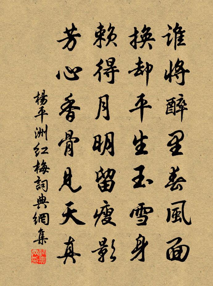 詩詞名句歷史字典書法欣賞書法字典國語詞典說文解字康熙字典古漢語字典標 題 作 者 詩 句 紅梅作者:楊平洲 朝代:宋代紅梅原文誰將醉里春風面,換卻平生玉雪身。賴得月明留瘦影,芳心香骨見天真。詩詞問答問:紅梅的作者是誰?答:楊平洲問:紅梅寫於哪個朝代?答:宋代楊平洲紅梅書法欣賞紅梅書法作品詩詞推薦將相棄國第十九文天祥〔宋代〕扈聖登黃閣,大將赴朝廷。胡為入雲霧,浩蕩乘滄溟。答仲肅梅洪咨夔〔宋代〕巡檐索笑為疏花,便未開花亦自佳。帶月折歸香在手,鬧觀塞破路三丫。送余直卿廷對葛紹體〔宋代〕吟卷閒晚窗,捷音閧春郵。推幾舞影急,踏門步蹤稠。黃冊幾載傳,青衫今日酬。學舍丈人行,文場少年儔。倚天大寧以雨復留借榻老僧禪室李彌遜〔宋代〕乞得禪房半日留,臥看岩雨瀉清溝。浮雲豈是塵中物,又逐秋風天外游。浣溪紗張先〔宋代〕樓倚春江百尺高,煙中還未見歸橈。幾時期信似江潮?花片片飛風弄蝶,柳陰陰下水平橋。日長才過又今宵。柳梢青吳文英〔宋代〕翠嶂圍屏。留連訊景,花外油亭。澹色煙昏,濃光清曉,一幅閒情。輞川落日漁罾。寫不盡、人間四並。亭上秋聲春日雜興方岳〔宋代〕野性最於魚鳥親,自知不是世間人。生成雪壑冰崖面,收得煙蓑雨笠身。楊柳春來青眼舊,山林老去白頭新。毋多廬山香林訪趙德麟吳可〔宋代〕艤舟星渚得幽尋,問訊先生隱翠岑。欲禮光明依淨社,便隨氣類老香林。貂金且換陶潛醉,囊錦聊追白傅吟。坡客西江月(再賦送行)周必大〔宋代〕藉甚新除刺史,歸然魯殿靈光。詔書催發棹謳忙。沙路從今穩上。有喜刊除戎索,無勞遠撫閩疆。日高龍影轉槐廊長水竹枝詞黃燮清〔清代〕蠶種須教覓四眠,買桑須買枝頭鮮。蠶眠桑老紅閨靜,燈火三更作繭圓。桃花元稹〔唐代〕桃花淺深處,似勻深淺妝。春風助腸斷,吹落白衣裳。詠貧士 其四陶淵明〔魏晉〕安貧守賤者,自古有黔婁。好爵吾不榮,厚饋吾不酬。一旦壽命盡,弊服仍不周。豈不知其極,非道故無憂。從來渚宮蘇軾〔宋代〕渚宮寂莫依古郢,楚地荒茫非故基。二王台閣已鹵莽,何況遠問縱橫時。楚王獵罷擊靈鼓,猛士操舟張水嬉。釣魚暮春陳允平〔宋代〕柳外宮鶯囀曉寒,萬花開盡正春殘。沉香亭北欄乾曲,獨抱琵琶看牡丹。過翔鸞院留題僧房張鎡〔宋代〕頻年雖並住,今日偶能來。水檻因蓮設,風窗為客開。詩凡慚鮑謝,社近憶宗雷。莫問通衢隔,輕舟自往回。次韻務觀城西書事二首韓元吉〔宋代〕川搖百艇陸千車,多是淮南避地家。黃紙赦來戎馬去,兒歌婦笑總呦啞。資聖寺送甘二王維〔唐代〕浮生信如寄。薄宦夫何有。來往本無歸。別離方此(一作正)受。柳色藹春余。槐陰清夏首。不覺御溝上。銜悲執再和潛說友〔宋代〕句落孤山壓老林,橫枝解識燮調心。眾賢戛擊宗韶頀,外域流傳洗靺任。不有鹿磯功許大,好壞能兔苑樂如今。非喜七兄疾愈二首張耒〔宋代〕南鄰隱士龍虎鼎,東寺比丘堅密身。欲知十室有信處,顧此兩賢非世人。戰勝天魔初起定,寶成丹灶不妨貧。何時睡起黃庚〔宋代〕滿階竹影掃斜陽,一枕秋風桂子香。夢裹不知身是客,覺來依舊在他鄉。名句推薦東風吹柳日初長,雨余芳草斜陽。秦觀《畫堂春·春情》 平岡細草鳴黃犢,斜日寒林點暮鴉。辛棄疾《鷓鴣天·陌上柔桑破嫩芽》 軍井成而後飲,軍食熟而後飯,軍壘成而後舍,勞佚必以身同之。尉繚《尉繚子·戰威》 床前明月光,疑是地上霜。李白《靜夜思》 如是滅度無量無數無邊眾生。實無眾生得滅度者。鳩摩羅什譯《金剛經·大乘正宗》 梧桐樹,三更雨,不道離情正苦。溫庭筠《更漏子·玉爐香》 佳人亦何念,淒斷陽關曲。蘇軾《送頓起》 雙星何事今宵會,遺我庭前月一鉤。德容《七夕二首·其一》 溪壑可盈,志欲無滿。姚察、姚思廉《梁書·列傳·卷五十三》 雉雊麥苗秀,蠶眠桑葉稀。王維《渭川田家》
