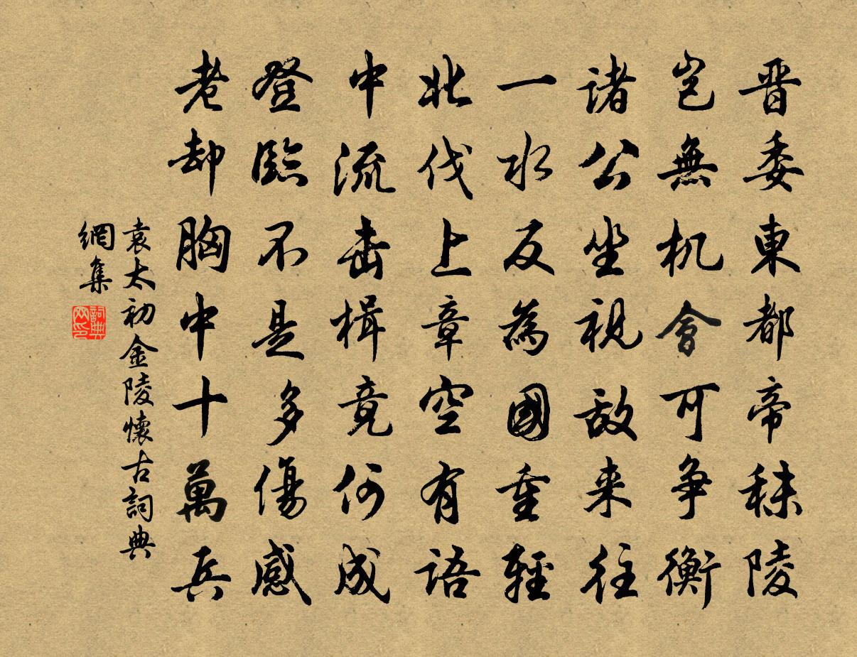 詩詞名句歷史字典書法欣賞書法字典國語詞典說文解字康熙字典古漢語字典標 題 作 者 詩 句 金陵懷古作者:袁太初 朝代:宋代金陵懷古原文晉委東都帝秣陵,豈無機會可爭衡。諸公坐視敵來往,一水反為國重輕。北伐上章空有語,中流擊楫竟何成。登臨不是多傷感,老卻胸中十萬兵。詩詞問答問:金陵懷古的作者是誰?答:袁太初問:金陵懷古寫於哪個朝代?答:宋代袁太初金陵懷古書法欣賞金陵懷古書法作品詩詞推薦開塗田道者求語釋亮〔宋代〕大海波濤涌,道人願力堅。當頭一截斷,萬頃看平田。戈陽縣學北堂見夾竹桃花有感而書李覯〔宋代〕暖碧覆晴殷,依依近朱欄。異類偶相合,勁節何能安。同地盡妖艷,無地容檀欒。移根既不可,潔心誠為難。外貌和張無垢胡澹庵二先生清江亭記劉黻〔宋代〕一靜心境融,飛躍昭上下。大道元不磨,人情自榮謝。兩翁投遐荒,浩然獨餘暇。悲此當道狐,羞彼立伏馬。命義紅梅 十五王冕〔元代〕仙子歸來逸興賒,夢中猶說舊繁華。春風轉首情何已?卻向江南認杏花。扇子詩李石〔宋代〕黑風吹海立,雲水渺三韓。蓑笠漁舟里,無心下釣竿。泌生日二首陳著〔宋代〕莧藜並日不充飢,玉女於成在此時。道義於人堪雋永,膏粱從古豢愚痴。亭上茅寄生陳宓〔宋代〕生長天垂力,孤懸有作奇。最先承曉露,終不墮春泥。初夏即事楊萬里〔宋代〕旋作東陂已水聲,才經急雨恰新晴。提壺醒眼看人醉,布穀催農不自耕。一似老夫堪笑死,萬方口業拙謀生。嘲紅失調名佚名〔宋代〕花開時節連風雨。暮春于山谷寺上方遇恩命加官賜服酬皇甫侍御見賀之作獨孤及〔唐代〕天書到法堂,朽質被榮光。自笑無功德,殊恩謬激揚。還登建禮署,猶忝會稽章。佳句慚相及,稱仁豈易當。古詩四首奉寄陳宗之兼簡敖臞翁陳鑒之〔宋代〕君隱萬人海,嘯詠足勝流。我墮寂寞濱,嵌岩一筇秋。蟠郁向誰吐,天圍蘆荻洲。劈箭客帆去,何日回吾舟。和居簡師韻高似孫〔宋代〕恨不相從早,分渠月半寮。墨飛春澗石,茶袞夕鐺潮。詩到如今瘦,情從此處消。為君料理極,參秀碧寥寥。題六和塔徐僑〔宋代〕慈恩昔日寄題名,此作江頭長短亭。潮去潮來知幾恨,酣歌漁父許誰聽。更始徐鈞〔宋代〕三精霧塞未能收,諸將俄興翼戴謀。誰謂庸才能戮莽,人心畢竟尚思劉。夜坐二首宋庠〔宋代〕省戶沈沈奉秘齋,通宵簫唱九天來。如愚默坐將何比,維斗虛名本不材。浦湘曲(為金壇教諭乾壽道考滿悵詞)蔡士裕〔宋代〕功名早。步武青雲繚繞。斯文近有成效。絳紗拍拍春風滿,香動一池芹藻。瓜期到。便勇撤皋比,此去應光耀。立偈頌七十一首釋了惠〔宋代〕明星照得眼睛穿,眼睛覷得明星落。夜半依前是子時,敢保不曾成正覺。石州慢元好問〔金代〕兒女籃輿,田舍老盆,隨意林壑。三重屋上黃茅,賴是秋風留著。舊家年少,也曾東抹西塗,鬢毛爭信星星卻。歲吳江汪元量〔宋代〕吳江潮水化蟲沙,兩岸垂楊噪亂鴉。舟子魚羹分宰相,路人麥飯進官家。莫思後事悲前事,且向天涯到海涯。回首黃梅東禪寺王之道〔宋代〕南晉今黃梅,東禪舊青蓮。曹溪竟何許,龍朔知幾年。我聞二祖師,屬袂茲褊{左衤右遷}。片言道有契,千古衣名句推薦乃翁知國如知兵,塞垣草木識威名。黃庭堅《送范德孺知慶州》 十年磨一劍,霜刃未曾試。賈島《劍客 / 述劍》 前村深雪裡,昨夜一枝開。齊己《早梅》 惜別傷離方寸亂。忘了臨行,酒盞深和淺。李清照《蝶戀花·淚濕羅衣脂粉滿》 細看茱萸一笑,詩翁健似常年。張可久《風入松·九日》 君子之學也,入乎耳,著乎心荀子《荀子·勸學》 杖劍對尊酒,恥為遊子顏。陸龜蒙《別離》 桃花一簇開無主,可愛深紅愛淺紅?杜甫《江畔獨步尋花·其五》 文武之政,布在方策。其人存,則其政舉;其人亡,則其政息。子思《中庸·第二十章》 卻是有,年年塞雁,歸來曾見開時。晁沖之《漢宮春·梅》
