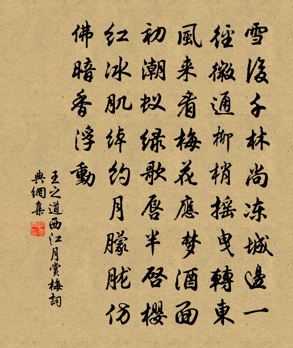 詩詞名句歷史字典書法欣賞書法字典國語詞典說文解字康熙字典古漢語字典標 題 作 者 詩 句 西江月(賞梅)作者:王之道 朝代:宋代西江月(賞梅)原文雪後千林尚凍,城邊一徑微通。柳梢搖曳轉東風。來看梅花應夢。酒面初潮蟻綠,歌唇半啟櫻紅。冰肌綽約月朦朧。仿佛暗香浮動。詩詞問答問:西江月(賞梅)的作者是誰?答:王之道問:西江月(賞梅)寫於哪個朝代?答:宋代王之道西江月(賞梅)書法欣賞西江月(賞梅)書法作品詩詞推薦楚王張耒〔宋代〕十二巫山聳翠巒,楚王宮殿玉漓岏。定知為雨為雲處,不似當初夢裡看。淳熙八年端午帖子詞太上皇帝合六首崔敦詩〔宋代〕竹殿陰陰間綠槐,日長棋罷看流杯。北窗風味沈沈靜,南內時新節節來。秋日山行簡梁大官駱賓王〔唐代〕乘馬陟層阜,回首睇山川。攢峰銜宿霧,疊巘架寒煙。百重含翠色,一道落飛泉。香吹分岩桂,鮮雲抱石蓮。地偏槐李嶠〔唐代〕暮律移寒火, * 長舊栽。葉生馳道側,花落鳳庭隈。烈士懷忠觸,鴻儒訪業來。何當赤墀下,疏乾擬三台。偈頌六十首釋曇華〔宋代〕跛腳雲門言打殺,達之居士示全身。當陽出格無多子,報佛深恩只兩人。水調歌頭(追和東坡)王之道〔宋代〕湖上有佳色, * 傲霜秋。一尊相屬,談詠彼此得無愁。何處鱸魚初薦,錯俎金齏點膾,令我憶東州。雙鷺帶斜日泉南歌謝履〔宋代〕泉州人稠山谷瘠,雖欲就耕無處辟。 州南有海浩無窮,每歲造舟通異域。鶴李中〔唐代〕九皋羽翼下晴空,萬里心難駐玉籠。清露滴時翹蘚徑,白雲開處唳松風。歸當華表千年後,怨在瑤琴別操中。好共送李大著赴闕項安世〔宋代〕玉觀金橋無限時,楚臣漢女不勝悲。如今蕩蕩平平矣,卻合融融洩洩之。八陛加恩須大冊,三朝修史待宏規。回頭初六早過後浦莊丘葵〔宋代〕秋晚村莊憩,青山對掩扉。輕風隨步屧,殘露濕征衣。水滿菰蒲亂,田荒鸛鶴飛。欲行還小立,旅思重依依。題解生山水圖劉宰〔宋代〕長江水水西南來,江北江南圖畫開。君從何處得此景,錦帆似泛長江回。槎牙老樹連荒島,兩兩人家出林杪。鷗飛至日早離張村石介〔宋代〕北闕千官集,南山萬壽長。何人距文石,獨客踏寒霜。指凍只尤落,馬贏時恐僵。豐凶卜來歲,猶喜矞雲黃。上裴侍郎王渙〔宋代〕青衿七十榜三年,建禮含香次第遷。珠彩下連星錯落,桂花曾對月嬋娟。玉經磨琢多成器,劍拔沈埋更倚天。應念新正三首白玉蟾〔宋代〕九重天上星三點,萬頃波心月一鉤。醉有百篇來筆下,愁無半點到眉頭。讀張文潛詩二首楊萬里〔宋代〕晚愛肥仙詩自然,何曾繡繪更琱鐫。春花秋月冬冰雪,不聽陳玄只聽天。二月十七日馬上鄭剛中〔宋代〕愁多發白惟知老,病起花飛不見春。我得此生真偶爾,休貪畫餅作痴人。上清寶鼎詩李白〔唐代〕朝披夢澤雲,笠釣青茫茫。尋絲得雙鯉,中有三元章。篆字若丹蛇,逸勢如飛翔。歸來問天老,奧義不可量。金刀驪山杜甫〔唐代〕驪山絕望幸,花萼罷登臨。地下無朝燭,人間有賜金。鼎湖龍去遠,銀海雁飛深。萬歲蓬萊日,長懸舊羽林。山館潘璵〔宋代〕山館坐秋雨,風吹霽景開。夕陽明遠水,落葉走空階。白髮人誰健,黃花節又催。看雲動孤酌,聊以尉吟懷。山村即事胡仲弓〔宋代〕春風無厚薄,隨分到山村。歌吹行南陌,鞦韆出短垣。稻田喧鳥雀,社鼓賽雞豚。何事條桑月,人家緊閉門。名句推薦渡江天馬南來,幾人真是經綸手。辛棄疾《水龍吟·甲辰歲壽韓南澗尚書》 零落棲遲一杯酒,主人奉觴客長壽。李賀《致酒行》 鳥下綠蕪秦苑夕,蟬鳴黃葉漢宮秋。許渾《鹹陽城東樓 / 鹹陽城西樓晚眺 / 西門》 羅幕輕寒,燕子雙飛去。晏殊《蝶戀花·檻菊愁煙蘭泣露》 高峰入雲,清流見底陶弘景《答謝中書書》 君去滄江望澄碧,鯨鯢唐突留餘跡。李白《赤壁歌送別》 花繁柳密處,撥得開,才是手段;風狂雨急時,立得定,方見腳根。陳繼儒《小窗幽記·集醒篇》 善為吏者樹德,不善為吏者樹怨。韓非及後人《韓非子·外儲說左下》 出犯繁花露,歸穿弱柳風溫庭筠《清明日》 重重蕊葉相憐,似青帔艷妝神仙侶。曹勛《夾竹桃花·詠題》