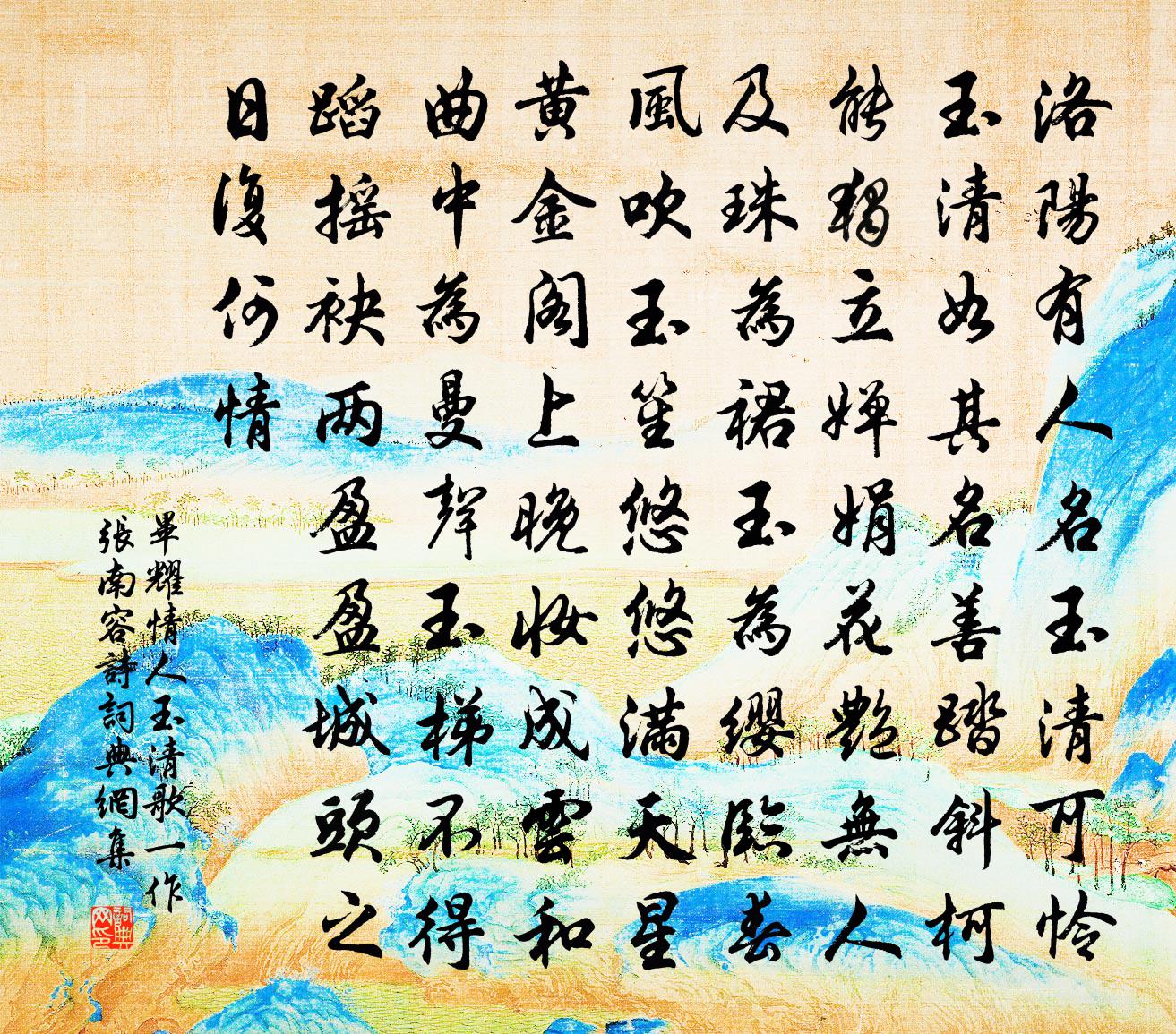 詩詞名句歷史字典書法欣賞書法字典國語詞典說文解字康熙字典古漢語字典標 題 作 者 詩 句 情人玉清歌(一作張南容詩)作者:畢耀 朝代:唐代原文洛陽有人名玉清,可憐玉清如其名。善踏斜柯能獨立,嬋娟花艷無人及。珠為裙,玉為纓。臨春風,吹玉笙。悠悠滿天星。黃金閣上晚妝成,雲和曲中為曼聲。玉梯不得蹈,搖袂兩盈盈。城頭之日復何情。詩詞問答問:《情人玉清歌(一作張南容詩)》的作者是誰?答:畢耀問:該詩寫於哪個朝代?答:唐代書法欣賞情人玉清歌(一作張南容詩)書法作品詩詞推薦送戴朝議歸蜀中蘇轍〔宋代〕岷山招我早歸來,劍閣橫空未易回。北叟忽驚鶗鳺晚,西轅欲及海棠開。避仇賦客親耕來,因亂詩翁著酒杯。但愛雜興陸游〔宋代〕蘭台遺漆書,汲冢收竹簡;辛勤萬卷讀,不負百年眼。圍座浩縱橫,插架高蹇產。一笑顧吾兒;銀艾何足綰!自愛仇遠〔宋代〕金淵豈愛我,我自愛金淵。似蜜醪尤美,如珠米更圓。攜家逾八口,竊祿又三年。書冊盈歸篋,毋嫌載月船。浣溪沙(常山道中)辛棄疾〔宋代〕北隴田高踏水頻。西溪禾早已嘗新。隔牆沽酒□纖鱗。忽有微涼何處雨,更無留影霎時雲。賣瓜聲過竹邊村。讀史羅公升〔宋代〕太初結繩制自好,庖犧倉頡計益疏。拓跋小羌行國字,鐘山丞相著新書。望江南張繼先〔宋代〕西源好,春日日初長。不看人間三月景,常思天上萬花香。幽賞一時狂。歌笑也,空洞大歌章。千景淨來風谷秀,梅花張道洽〔宋代〕天寒共維未能靈,佇立通宵戶不扃。小萼欲爭天下白,數條獨向雪中青。肯教旅雁尋常見,未許游蜂取次經。一片上長史王公責躬儲光羲〔唐代〕覆舟無伯夷,覆車無仲尼。自咎失明義,寧由貝錦詩。松柏日已堅,桃李日以滋。顧己獨暗昧,所居成蒺藜。大賢賦李季章大著書樓項安世〔宋代〕不識書樓夢已登,幽人應在最高層。網羅歆向群言目,搜攪談遷萬古膺。河漢西流清露重,玉霄東望紫煙凝。夜深晚酌翛然閣白玉蟾〔宋代〕殘暑猶拖尾,新涼恰打頭。酒方屯魯郡,舞已徹伊州。西江月(十一月初六日夜偶成)韓淲〔宋代〕日日山迷水癖,年年書惱詩痴。尋思那裡要他知。試比古人猶未。往往眼甜口苦,常常心是身非。如何則甚破他疑句晏殊〔宋代〕青帝迴風初習習,黃人捧日故遲遲。居中饋薏苡青頭雞小詩代簡李新〔宋代〕彈殺能言笑解頤,載歸招謗問誰知。難隨白鶴同時放,且伴黃粱一處炊。與所盤諸君會石幡還和杜老曲江韻丘葵〔宋代〕絮雲初未前成衣,笑踏青莎橋上歸。詩灑堪過春日永,鶯花卻恨海山稀。竹間弄笛留人住,麥外遊絲絆鳥飛。滿院和秦壽之題靖安棲霞觀王之道〔宋代〕飛觀臨無地,江天在目中。晚霞工射日,秋水欲浮空。蓼岸深迷綠,楓林遠映紅。歸歟還可喜,千里一帆風。題顯孝南山寺孔文仲〔宋代〕尋盡城中山,又訪江外寺。蘭舟涉澄漪,隼旌入疏翠。樓台初日升,岩谷宿露墜。飛泉百禽鳴,怪石萬蛇躓。絕庵追和牙坡喜雪用王覿韻王之道〔宋代〕長安一夜雪,酒價涌朝市。何人獨耐寒,翛然立庭砌。盈盈竹間梅,靚妝欲誰媚。冰肌與玉骨,似不勝風袂。豐年蘇幕遮周邦彥〔宋代〕燎沈香,消溽暑。鳥雀呼晴,侵曉窺檐語。葉上初陽乾宿雨,水面清圓,一一風荷舉。故鄉遙,何日去。家住吳門奉和經略龐龍圖延州南城入詠延利渠司馬光〔宋代〕枝分清淺流,縱橫貫城市。還如恩在人,潤澤無終既。前漢門夏賀良周曇〔唐代〕漢代中微亦再昌,忠臣憂國冀修禳。赤精符讖誠非妄,枉殺無辜夏賀良。名句推薦數里黃沙行客路,不堪回首思秦原。周朴《春日秦國懷古》 刻薄不賺錢,忠厚不折本。馮夢龍《醒世恆言·卷三》 汴水流,泗水流,流到瓜州古渡頭。吳山點點愁白居易《長相思·汴水流》 西園何限相思樹,辛苦梅花候海棠。元好問《鷓鴣天·候館燈昏雨送涼》 同聲則異而相應,意合則未見而相親戴聖《大戴禮記·保傅第四十八》 烏絲闌紙嬌紅篆,歷歷春星。納蘭性德《紅窗月·燕歸花謝》 秋波落泗水,海色明徂徠。李白《魯郡東石門送杜二甫》 小立紅橋柳半垂,越羅裙颺縷金衣。納蘭性德《山花子·小立紅橋柳半垂》 看風流慷慨,談笑過殘年辛棄疾《八聲甘州·故將軍飲罷夜歸來》 瞿塘嘈嘈十二灘,此中道路古來難。劉禹錫《竹枝詞九首·其七》