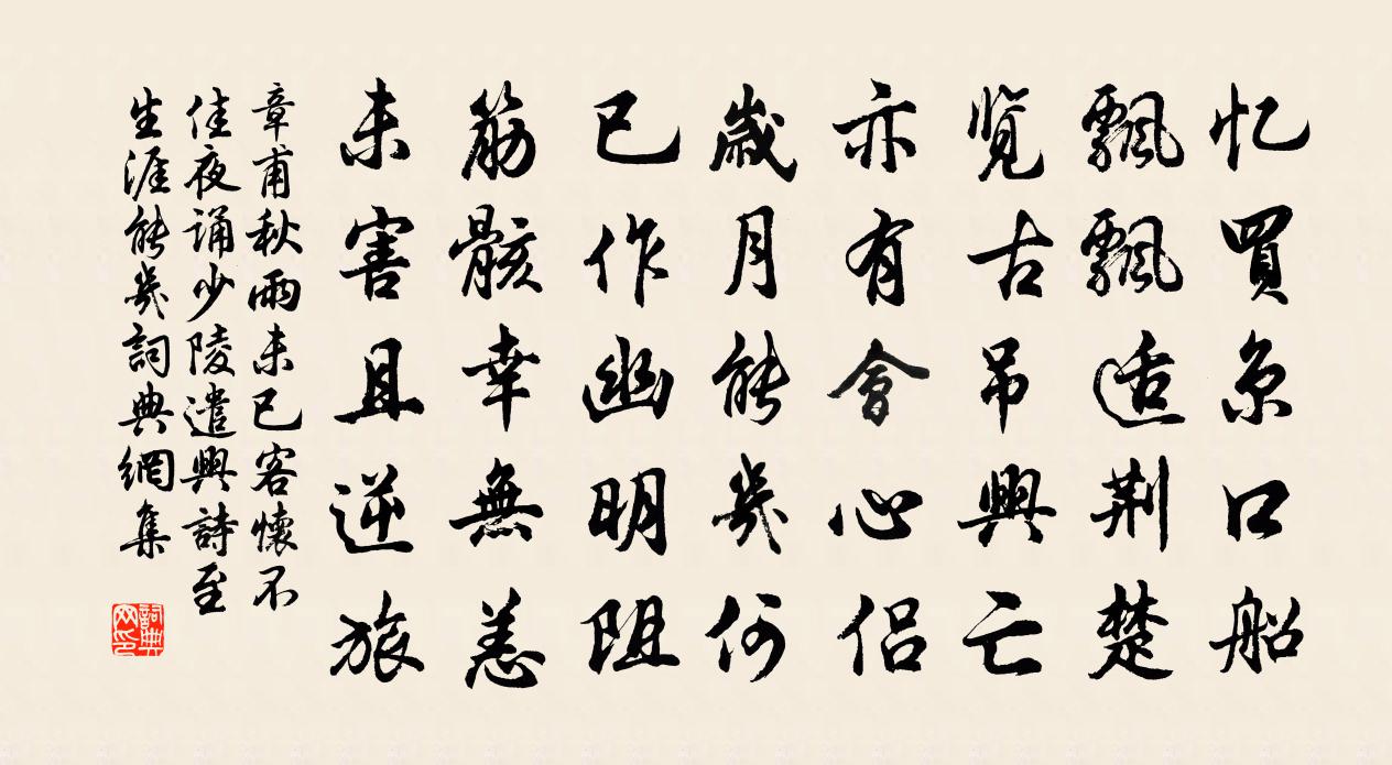 詩詞名句歷史字典書法欣賞書法字典國語詞典說文解字康熙字典古漢語字典標 題 作 者 詩 句 秋雨未已客懷不佳夜誦少陵遣興詩至生涯能幾作者:章甫 朝代:宋代原文憶買京口船,飄飄適荊楚。覽古吊興亡,亦有會心侶。歲月能幾何,已作幽明阻。筋骸幸無恙,未害且逆旅。詩詞問答問:《秋雨未已客懷不佳夜誦少陵遣興詩至生涯能幾》的作者是誰?答:章甫問:該詩寫於哪個朝代?答:宋代書法欣賞秋雨未已客懷不佳夜誦少陵遣興詩至生涯能幾書法作品詩文賞析【原題】:秋雨未已客懷不佳夜誦少陵遣興詩至生涯能幾何常在羈旅中三復增感每字賦一詩詩詞推薦水閣偶成二首蔡戡〔宋代〕小閣枕橫塘,荷花渡晚香。月華秋更白,水氣夜偏涼。地僻人稀到,心閒夢亦長。北窗聊寄傲,身世兩相忘。首尾吟邵雍〔宋代〕堯夫非是愛吟詩,詩是堯夫筆逸時。蒼海有神搜鯨鯢,陸沉無水藏蛟螭。岌{上山下業}五千仞華岳,汪洋十萬頃羅湖八首劉克莊〔宋代〕潁水箕山未脫然,直須斷盡世間緣。野人曾被子朱轓涴,不作天仙作地仙。次韻梁廣文重午弔古陳造〔宋代〕去年重午飲酒歸,賡歌酬酢無俗子。今年重午約同飲,更向詩人閱詩史。平生玩物遊戲爾,把酒孰知情所寄。交朋酬陳頤剛見和前韻陳傅良〔宋代〕離合皆天意,盈虛幾月華。家才辦藜莧,吾亦逐蘆葭。憂世還當路,論兵有故家。深深看踵息,陰火養黃芽。初夏山居有懷長沙從游四首趙蕃〔宋代〕府谷我先契,諸公吾輩流。懸知盍簪際,頗解憶人不。蕙逐光風轉,鸎啼出谷幽。因聲煩為我,傳寫寄荊州。秀州僧本瑩靜照堂蘇軾〔宋代〕鳥囚不忘飛,馬系常念馳。靜中不自勝,不若聽所之。君看厭事人,無事乃更悲。貧賤苦形勞,富貴嗟神疲。作堂題嶽麓西軒三絕胡寅〔宋代〕偶向紅塵得此生,歲寒松竹尚多情。道人亦有生前契,幽處開軒巧見迎。挽呂舍人二首汪應辰〔宋代〕接物初無間,微言獨得聞。相期深造道,不為細論文。自有高山爺,誰知半路分。新阡疑可望,目斷只愁雲。送春李鹹用〔唐代〕四時為第一,一歲一重來。好景應難勝,余花虛自開。相思九個月,得信數枝梅。不向東門送,還成負酒杯。射生戶歐陽修〔宋代〕射生戶,前日獻一豹,今日獻一狼。豹因傷我牛,狼因食我羊。狼豹誠為害人物,縣官賞之縑五匹。射生戶,持縑江行至內牛廟山特奇秀晚舟檥廟下留詩於壁李復〔宋代〕層峰浮支空,亭亭出眾嶠。芬敷如青蓮,飛光亂寒照。霜風雜丹碧,瀑布垂窈窕。秀色紛異狀,爭奇動奔峭。欻失留滯劉學箕〔宋代〕何期蹤跡又遲留,行止於人自不由。夢境固知空似蟻,生涯卻笑拙於鳩。碧涵一鏡晴天闊,翠擁千峰宿雨收。從此頌古十六首釋道寧〔宋代〕春去復春來,桃花依舊開。東風浩浩曾無間,剛地靈雲道不猜。寄同年宗兄桐江府判去言五首方回〔宋代〕聯翩同掛別闈名,尚得秋崖病體輕。三十四年如一瞬,夢中時見老先生。大雨杜甫〔唐代〕西蜀冬不雪,春農尚嗷嗷。上天回哀眷,朱夏雲鬱陶。執熱乃沸鼎,纖絺成縕袍。風雷颯萬里,霈澤施蓬蒿。敢辭閒甚戲作陸游〔宋代〕酒盡枵樽腹,書拋委架麈。漸能閒過日,始覺老催人。玉麈王夷甫,金龜賀季真。若論方外事,終媿葛天民。張守送羊羔酒將以三絕次韻答之陳造〔宋代〕小槽清凝帶羶香,釀法知非羸角羊。拜賜未辭乾講舌,呼兒留得薦蒸嘗。寧海劉君輓詞樓鑰〔宋代〕不識紫芝眉,空傳有道碑。義方真可法,闇室肯容欺。未覺山川改,深明晝夜知。薤歌慙不稱,冢子素能詩。有感宋伯仁〔宋代〕窗戶清清半掩門,小兒揩淚立黃昏。幾多心事無人問,獨看梅花月半痕。名句推薦故鄉遙,何日去。家住吳門,久作長安旅。周邦彥《蘇幕遮·燎沉香》 離心何以贈,自有玉壺冰。駱賓王《送別》 春日游,杏花吹滿頭。韋莊《思帝鄉·春日游》 雲無心以出岫,鳥倦飛而知還。陶淵明《歸去來兮辭·並序》 春風依舊。著意隨堤柳。趙令畤《清平樂·春風依舊》 雁濕行無次,花沾色更鮮。李世民《詠雨》 斜風細雨不須歸。蘇軾《浣溪沙·漁父》 桃花洞,瑤台夢,一片春愁誰與共?和凝《天仙子·柳色披衫金縷鳳》 故勢不便,非所以逞能也。韓非及後人《韓非子·說林下》 搖落深知宋玉悲,風流儒雅亦吾師。杜甫《詠懷古蹟五首·其二》