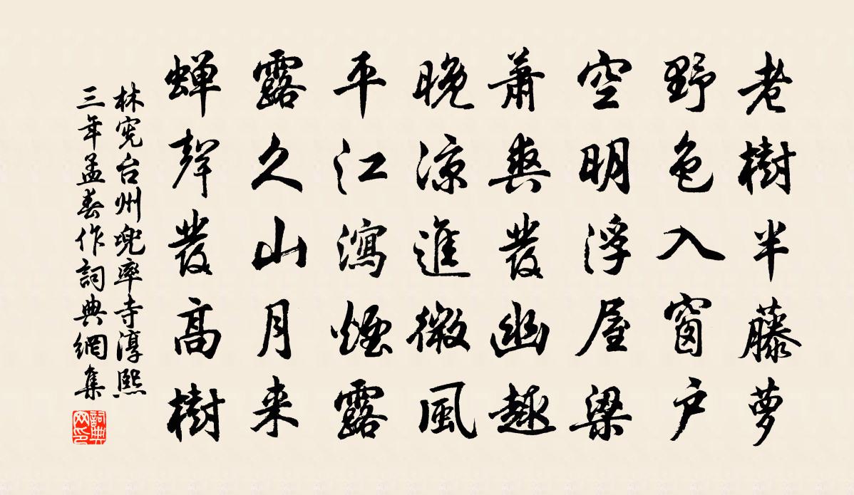 詩詞名句歷史字典書法欣賞書法字典國語詞典說文解字康熙字典古漢語字典標 題 作 者 詩 句 台州兜率寺淳熙三年孟春作作者:林憲 朝代:宋代台州兜率寺淳熙三年孟春作原文老樹半藤蘿,野色入窗戶。空明浮屋樑,蕭爽發幽趣。晚涼進微風,平江瀉煙露。露久山月來,蟬聲發高樹。詩詞問答問:台州兜率寺淳熙三年孟春作的作者是誰?答:林憲問:台州兜率寺淳熙三年孟春作寫於哪個朝代?答:宋代林憲台州兜率寺淳熙三年孟春作書法欣賞台州兜率寺淳熙三年孟春作書法作品詩詞推薦玉樓春(五之二·大石調)柳永〔宋代〕鳳樓鬱郁呈嘉瑞。降聖覃恩延四裔。醮台清夜洞天嚴,公宴凌晨簫鼓沸。保生酒勸椒香膩,延壽帶垂金縷細。幾行縣內閒居贈溫公韋應物〔唐代〕滿郭春風嵐已昏,鴉棲散吏掩重門。雖居世網常清淨,夜對高僧無一言。西江月仲殊〔宋代〕味過華林芳蒂,色兼陽井沈朱。輕勻絳蠟裹團酥。不比人間甘露。神鼎十分火棗,龍盤三寸紅珠。清含冰蜜洗雲腴讀巷伯章宋祁〔宋代〕孤節區區是愛君,危言未達已危身。豺牙虎爪銛於劍,不為詩人食譖人。者提花鄭域〔宋代〕此花移種自招提,借佛為名識者希。優缽曼陀是要何似,並參香問因依。次韻和江鄰幾送客回同過金明池二首梅堯臣〔宋代〕風光猶未老於人,獸口泉聲瀉碧津。一洗塵襟無俗慮,柳條開眼共看春。和劉晉父寒食日從郡掾游花光相祠絕江訪向園廖行之〔宋代〕官事何時了,郊行亦興佳。不因修佛供,端為憶詩家。歌櫂浮春浦,吟筇倚暮花。翻思紅蘂句,想像怨年華。長門怨高蟾〔唐代〕天上何勞萬古春,君前誰是百年人。魂銷尚愧金爐燼,思起猶慚玉輦塵。煙翠薄情攀不得,星茫浮艷采無因。可憐北湖曾鞏〔宋代〕當時泛西湖,已覺煙水永。北堤復誰開,長涵一川靜。久幽繇地偏,跬步人跡屏。我初得之喜,指顧辟榛梗。種花詠襪杜牧〔唐代〕鈿尺裁量減四分,纖纖玉筍裹輕雲。五陵年少欺他醉,笑把花前出畫裙。立秋日悲懷令狐楚〔唐代〕清曉上高台,秋風今日來。又添新節恨,猶抱故年哀。淚豈揮能盡,泉終閉不開。更傷春月過, * 示無縗。會諸官韓亭章元振〔宋代〕我愛韓亭好,文公像逼真。音容雖已往,英概恍如新。句程大昌〔宋代〕著許謹護籜龍兒,養就堅高抗雪姿。次韻戴石屏見簡二首高斯得〔宋代〕采玉探珠遍九圍,先容分不到離奇。委心自信天行止,用世定慚道覺知。且可謾持東海釣,終期不負北山移。杜陵賦張舍人抱嘯堂五首姜特立〔宋代〕長身躕躕萬夫雄,抵掌燕然立駿功。韜略故家傳圯上,行藏高志似隆中。減字木蘭花 右初五日巽配震王吉昌〔元代〕巽榮春谷。辛水溶溶滋震木。五返雲雷。玉桂蟾宮應候開。月娥清寫。風震庚金調木馬。功顯強兵。火袞深淵四海一篙范成大〔宋代〕一篙新綠浦東西,雪絮漫江鴈不飛。宿雨才晴風又轉,片帆那得及時歸。水龍吟·金陵雪後西望黎廷瑞〔宋代〕不知玄武湖中,一瓢春水何人借。裁冰翦雨,等閒占斷,桃花春社。古阜花城,玉龍鹽虎,夕陽圖畫。是東風吹就哭秘書彭止所文天祥〔宋代〕人物孤中秘,神山返異仙。目穿陪紼處,夢斷曝書年。玉質應無死,韋編豈不傳。奠芻和淚遣,此月向誰圓。曉過州橋孔武仲〔宋代〕曉過蒼涼宿霧東,蓬萊金碧起浮空。滄溟萬里排天去,人物紛紛海市中。名句推薦鼙鼓動時雷隱隱,獸頭凌處雪微微。盧肇《競渡詩 / 及第後江寧觀競渡寄袁州剌史成應元》 無人調護,自去經心。沈復《浮生六記·閨房記樂》 有客躊躇,古庭空自吊孤影。史達祖《齊天樂·中秋宿真定驛》 全一人者德之輕,拯天下者功之重房玄齡《晉書·帝紀·第三章》 不見去年人,淚濕春衫袖。歐陽修《生查子·元夕》 上有流思人,懷舊望歸客。謝朓《送江水曹還遠館》 寧為百夫長,勝作一書生。楊炯《從軍行》 數聲風笛離亭晚,君向瀟湘我向秦。鄭谷《淮上與友人別》 盈盈一水間,脈脈不得語。佚名《迢迢牽牛星》 宦情羈思共淒淒,春半如秋意轉迷柳宗元《柳州二月榕葉落盡偶題》