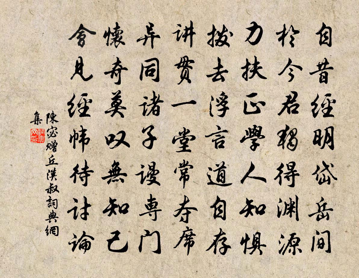 詩詞名句歷史字典書法欣賞書法字典國語詞典說文解字康熙字典古漢語字典標 題 作 者 詩 句 贈丘漢叔作者:陳宓 朝代:宋代贈丘漢叔原文自昔經明岱嶽間,於今君獨得淵源。力扶正學人知懼,撥去浮言道自存。講貫一堂常奪席,異同諸子謾專門。懷奇莫嘆無知己,會見經幃待討論。詩詞問答問:贈丘漢叔的作者是誰?答:陳宓問:贈丘漢叔寫於哪個朝代?答:宋代陳宓贈丘漢叔書法欣賞贈丘漢叔書法作品詩詞推薦源里劉克莊〔宋代〕一洞沾秦俗,疑非太古民。盡將源里事,報與世間人。大洲湖周弼〔宋代〕人居澤國勝居陵,十月陂塘未結冰。殘葦亂茭收拾後,斷筐分曬折腰菱。題陳復祖節推留遠齋劉克莊〔宋代〕曾讀蔡公詩,夫君志可知。試看鸞鎩翼,豈若豹留皮。寒柏無陽艷,朝花有夕披。長公真樣子,何必遠求師。金陵雜興二百首蘇泂〔宋代〕甫見梅花方結子,即看燕子已生見。青春遊盪不知返,留住金陵又幾時。過楚州用霍希文韻袁說友〔宋代〕夜入山陽鷁首東,腳踏車出郭更匆匆。欲知勢扼三江近,政以城高百尺雄。此恨終天身未老,何人抵掌氣凌空。連雲第一山王信〔宋代〕禺跡茫茫萬里天,望中皆我舊山川。誰將淮水分南北,直到幽燕始是邊。贈別王侍御赴上都韓翃〔唐代〕翩翩馬上郎,執簡佩銀章。西向洛陽歸鄠杜,回頭結念蓮花府。朝辭芳草萬歲街,暮宿春山一泉塢。青青樹色傍行暮春感事寇準〔宋代〕春至又春暮,閒心成古心。花光隨雨薄,草色共煙深。粉蝶稀狂影,黃鸝送好音。餘芳留不得,還共夕陽沉。八月八日發潭州後得絕句四十首趙蕃〔宋代〕午風吹坼稻花香,晨雨翻掀稻葉涼。道中塵埃猶淨盡,田間歡樂詎能量。春初驟暄一夕梅盡開明日大風花落成積戲作陸游〔宋代〕暖逼梅花爛漫開,飄零便恐付蒼苔。更堪連夜風如許,似妒愁人把一杯。初夏三首王鎡〔宋代〕芳歇紅稀蝶懶來,瀟瀟風雷送春回。綠陰如許無人看,軟玉枝頭已有梅。山中寄梁判官李山甫〔唐代〕歸臥東林計偶諧,柴門深向翠微開。更無塵事心頭起,還有詩情象外來。康樂公應頻結社,寒山子亦患多才。星郎秋試歸訪綠煙亭林亦之〔宋代〕竹逕縈紆去,相逢情若何。江從木杪見,秋向菊邊多。謾有風濤想,如今歲月過。唯於交舊里,聽取碧雲歌。讀賈區、賈島集貫休〔唐代〕區終不下島,島亦不多區。冷格俱無敵,貧根亦似愚。青雲終嘆命,白閣久圍爐。今日成名者,還堪為爾吁。偈頌一百六十首釋宗杲〔宋代〕徑山無寸土莊田,今夏隨宜結眾緣。慵論道,嫩談禪,拄杖桃來個個圓。不用息心除妄想。大家吃飯了瞳眠。重陽再和乙丑歲韻吳芾〔宋代〕老去逢秋倍感傷,此生能風幾重陽。喜君綠蟻初浮瓮,容我黃花滿泛觴。幸返丘園如素志,況陪新舊話中腸。已拼程山人歸歙州梅堯臣〔宋代〕新安固與吾鄉鄰,山水清絕殊可擬。我今暫來子亦歸,空聽杜鵑雲樹里。句馬戴〔唐代〕申胥任向秦庭哭,靳尚終貽楚國憂。贈畫魚李生艾性夫〔宋代〕李生畫魚天下無,得心應手神為徒。虛堂素壁掃塵土,遠趣一筆移江湖。青魚洋洋翻荇帶,鱖魚獵獵穿蒲稗。醉來永明樂 二謝朓〔南北朝〕民和禮樂富。世清歌頌徽。鴻名軼卷領。稱首邁垂衣。名句推薦積土成山,風雨興焉;荀子《勸學》 妾家高樓連苑起,良人執戟明光里。張籍《節婦吟·寄東平李司空師道》 雁聲遠過瀟湘去,十二樓中月自明。溫庭筠《瑤瑟怨》 深秋寒夜銀河靜,月明深院中庭。尹鶚《臨江仙·深秋寒夜銀河靜》 想子胥今夜見嫦娥,沉冤雪。史達祖《滿江紅·中秋夜潮》 凡道字,重且舒。勿急疾,勿模糊。李毓秀《弟子規·信》 綠葉翠莖,冒霜停雪。左思《三都賦》 謙謙君子,卑以自牧佚名《易傳·象傳上·謙》 輪匠執其規、矩,以度天下之方圓墨子《墨子·天志(上)》 做弄得、酒醒天寒,空對一庭香雪。張炎《疏影·梅影》