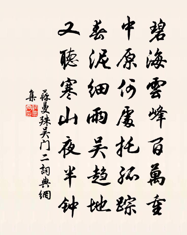 詩詞名句歷史字典書法欣賞書法字典國語詞典說文解字康熙字典古漢語字典標 題 作 者 詩 句 吳門 二作者:蘇曼殊 朝代:近現代吳門 二原文碧海雲峰百萬重,中原何處託孤蹤?春泥細雨吳趨地,又聽寒山夜半鍾。詩詞問答問:吳門 二的作者是誰?答:蘇曼殊問:吳門 二寫於哪個朝代?答:近現代書法欣賞吳門 二書法作品詩詞推薦同王秘校和同年五使君韶餞送嚴文守江陰趙善括〔宋代〕欲說澄江好,丹青百雉樓。山明新雨澤,潮湧亂雲流。賢守聲先至,疲民疾已瘳。中興待良佐,千里未分憂。贈劉琨詩二十首 十八盧諶〔魏晉〕爰造異論。肝膽楚越。惟同大觀。萬塗一轍。死生既齊。榮辱奚別。處其玄根。廓焉靡結。和應之蝎虎張耒〔宋代〕蝎虎捕蠅君嘆息,爾胡縱蠍蠅遭食。畏難侮易真可尤,能捕飛蠅猶有益。君不見世上虛名相借與,號以千鈞實無縷琴操十首。岐山操韓愈〔唐代〕(周公為太王作。本詞云:狄戎侵兮,土地遷移。邦邑適於岐山,烝民不憂兮誰者知。嗟嗟奈何兮,予命遭斯)我續南有樛木曾豐〔宋代〕費迷性元,靈主長存。靈主長存,馴入乎妙門。即事樓鑰〔宋代〕睡重不知曉,山高意得秋。風來已落葉,潦去忽中洲。幽閴素所願,登臨儘自由。瀕溪千萬壑,何日上扁舟。自彭蠡湖初入江張九齡〔唐代〕江岫殊空闊,雲煙處處浮。上來群噪鳥,中去獨行舟。牢落誰相顧,逶迤日自愁。更將心問影,於役復何求。滬州大將第四文天祥〔宋代〕西南失大將,帶甲滿天地。高人憂祝胎,感嘆亦歔欷。再次韻二首陳造〔宋代〕自揖高人擁鼻吟,湖濱詩酒便論心。天教聯綬同民社,日許挑燈訂古今。刺眼未妨翻著襪,躍爐寧問不祥金。簡編天津橋王同祖〔宋代〕行闕千重鎖暮煙,山如洛邑水如瀍。黃塵障斷中原路,忍立橋頭聽杜鵑。重九姜特立〔宋代〕淵明頗愛重九名,我亦愛飽重九酒。已辦 * 與紅萸,喚起陶公為四友。嘉興寒食徐凝〔唐代〕嘉興郭里逢寒食,落日家家拜掃回。唯有縣前蘇小小,無人送與紙錢來。送心淨頭釋心月〔宋代〕處塵勞界住深禪,幾度悲心碎復圓。得失是非都放下,頭頭皆我舊山川。白首蘇泂〔宋代〕白首百歲期,青春三月暮。荒涼雞下柵,寂寞鶯啼樹。山水越王城,行人雨中去。山居寂寥與世如隔是非不到榮辱兩忘因憶秋崖吳錫疇〔宋代〕我愛山居好,軒窗傍水開。游魚吹墮絮,閒鶴啄荒苔。有字人誰問,無租吏不來。寂寥門逕側,數尺長蒿萊。涼夜王鎡〔宋代〕斷階露草濕鳴蛩,桐樹涼生落葉中。月上小樓人未睡,曲欄敲遍倚西風。將歸一絕白居易〔唐代〕欲去公門返野扉,預思泉竹已依依。更憐家醞迎春熟,一瓮醍醐待我歸。詠史上魏相陳普〔宋代〕人倫大變歲二百,蕭曹以來誰在心。相業更生王吉疏,文學春秋猶未深。四仙韻馬鈺〔元代〕譚仙通正。悟徹長真修玉性。馬鈺山侗。豁豁洋洋似害風。劉仙通妙。把握長生真了了。通密丘仙。修養長春不夜病起據案無緒輒書二十五韻呈簿尉虞儔〔宋代〕只役來異鄉,瘧鬼巧伺便。寒熱四五行,大小六七戰。初如蹈陰壑,赤身臥冰霰。繼若煽紅爐,虐焰工煆煉。先生名句推薦千步虹橋,參差雁齒,直趨水殿。柳永《破陣樂·露花倒影》 昔歲逢太平,山林二十年。元結《賊退示官吏》 過雨西風,數葉井梧愁舞。吳文英《荔枝香近·七夕》 桃花塢裏桃花庵,桃花庵裏桃花仙。唐寅《桃花庵歌》 長相思,摧心肝。李白《長相思三首》 鴛鴦俱是白頭時,江南渭北三千里。賀鑄《惜余春·急雨收春》 青衫匹馬萬人呼,幕府當年急急符。辛棄疾《送湖南部曲》 君者,源也;水者,流也。源清則流清,源濁則流濁。李昉、李穆、徐鉉《太平御覽·治道部·卷一》 鳥雀不知郊野好,穿花翻戀小庭中。高珩《春日雜詠》 離堂思琴瑟,別路繞山川。陳子昂《春夜別友人二首·其一》