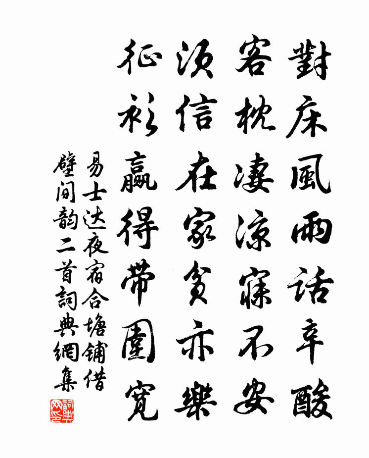 詩詞名句歷史字典書法欣賞書法字典國語詞典說文解字康熙字典古漢語字典標 題 作 者 詩 句 夜宿合塘鋪借壁間韻二首作者:易士達 朝代:宋代夜宿合塘鋪借壁間韻二首原文對床風雨話辛酸,客枕淒涼寐不安。須信在家貧亦樂,征衫贏得帶圍寬。詩詞問答問:夜宿合塘鋪借壁間韻二首的作者是誰?答:易士達問:夜宿合塘鋪借壁間韻二首寫於哪個朝代?答:宋代易士達夜宿合塘鋪借壁間韻二首書法欣賞夜宿合塘鋪借壁間韻二首書法作品詩詞推薦陳季常見過三首蘇軾〔宋代〕送君四十里,只使一帆風。江邊千樹柳,落我酒杯中。此行非遠別,此樂固無窮。但願長如此,來往一生同。挽京口使君豐郎中十首劉宰〔宋代〕南徐開府未旬時,一掃煩苛布惠慈。孺子竟孤縣榻望,伯牙空有絕弦悲。題江湖偉觀劉黻〔宋代〕柳殘荷老客淒涼,獨對西風立上方。萬井人煙環魏闕,千年王氣到錢塘。湖澄古塔明寒嶼,江遠歸舟動夕陽。北望夏中雜興陸游〔宋代〕梳發高舂後,投床甲夜初。語艱愁對客,手倦怕催書。美睡那思覺,甘餐不願余。更應慚造化,無事到幽居。延祥寺孫直臣〔宋代〕雷雨隨車上寶坊,僧夸山味最悠長。地靈終日無塵到,天淨常時見海光。神雀羽毛多隱晦,臥龍頭角本軒昂。石樓離亭賦得折楊柳二首李商隱〔唐代〕暫憑尊酒送無憀,莫損愁眉與細腰。人世死前唯有別,春風爭擬惜長條。含煙惹霧每依依,萬緒千條拂落暉。為報寄家書佚名〔宋代〕南軒北牖又東扉,取次園林待我歸。當路莫栽荊棘草,他年免掛子孫衣。偈頌八十七首釋慧開〔宋代〕薰風自南來,殿閣生微涼。百年渾似醉,三萬六千場。休擬議,莫思量。錦鱗一躍化龍去,無限痴人戽夜塘。觀湖丘葵〔宋代〕飛飛洲上禽,亦能戾於天。聖域尚能臻,吾車安敢旋。餞康侯二首楊公遠〔宋代〕古歙何多幸,民叨撫育恩。清聲冠今古,浩氣滿乾坤。夜月一船載,秋風三逕存。莫能攀去轍,戀戀勸金樽。上湖南孫漕四首廖行之〔宋代〕湘雨湘田處處同,誰知公意與天通。愛民天亦憂民事,望歲公應喜歲豐。自古強兵先足食,從今積粟可平戎。關中和普公賦東園十題其九紫竹梅堯臣〔宋代〕西南產修竹,色異東筠綠。裁筆映檀唇,引枝宜鳳宿。移從幾千里,不改生幽谷。靜夜相思李群玉〔唐代〕山空天籟寂,水榭延輕涼。浪定一浦月,藕花閒自香。漁家傲(七夕)蘇軾〔宋代〕皎皎牽牛河漢女。盈盈臨水無由語。望斷碧雲空日暮。無尋處。夢回芳草生春浦。鳥散餘花紛似雨。汀洲苹老香風和仲弟十絕劉克莊〔宋代〕雁回杳杳渾無報,鵲語啾啾似有憑。忽得遠書看百過,眼昏自起剔殘燈。暮春二首貢性之〔元代〕惜花公子愛春晴,駿馬驕嘶曉出城。半醉歸來人共看,笑將金彈打流鶯。遇旅鶴孫昌胤〔唐代〕靈鶴產絕境,昂昂無與儔。群飛滄海曙,一叫雲山秋。野性方自得,人寰何所求。時因戲祥風,偶爾來中州。中州滿江紅佚名〔宋代〕瑞靄長安,京城裡、非煙非霧。須信道、岳鍾神秀,再生商傅。節過重陽才一日,祥開蓬島群仙聚。見箕星、昴宿九鎖山十詠王易簡〔宋代〕天吳泣海枯,化石空山中。陵谷歷千變,倒倚蓬萊風。鐵壁立峭絕,轂波漾玲瓏。前岩寄游屧,大巧藏神功。素屏次韻楊明叔見餞十首黃庭堅〔宋代〕松柏生澗壑,坐閱草木秋。金石在波中,仰看萬物流。抗髒自抗髒,伊優自伊優。但觀百歲後,傳者非公侯。名句推薦自是浮生無可說。人間第一耽離別。王國維《蝶戀花·滿地霜華濃似雪》 春風依舊。著意隨堤柳。趙令畤《清平樂·春風依舊》 和氣吹綠野,梅雨灑芳田。李世民《詠雨》 雲母屏風燭影深,長河漸落曉星沉。李商隱《嫦娥》 壯別天涯未許愁,盡將離恨付東流李大釗《口占一絕(壯別天涯未許愁)》 未老莫還鄉,還鄉須斷腸。韋莊《菩薩蠻·人人盡說江南好》 萬里橋西一草堂,百花潭水即滄浪。杜甫《狂夫》 清露晨流,新桐初引,多少遊春意。李清照《念奴嬌·春情》 儒以文亂法,俠以武犯禁。韓非及後人《韓非子·五蠹》 強龍不壓地頭蛇。吳承恩《西遊記·第四十五回》
