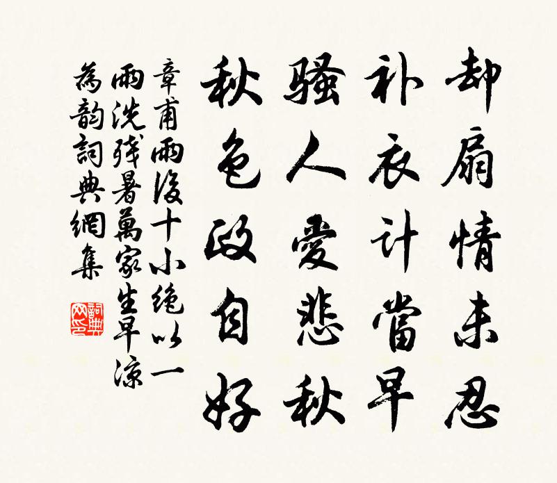 詩詞名句歷史字典書法欣賞書法字典國語詞典說文解字康熙字典古漢語字典標 題 作 者 詩 句 雨後十小絕以一雨洗殘暑萬家生早涼為韻作者:章甫 朝代:宋代原文卻扇情未忍,補衣計當早。騷人愛悲秋,秋色政自好。詩詞問答問:《雨後十小絕以一雨洗殘暑萬家生早涼為韻》的作者是誰?答:章甫問:該詩寫於哪個朝代?答:宋代書法欣賞雨後十小絕以一雨洗殘暑萬家生早涼為韻書法作品詩詞推薦代書答姜七崔九張說〔唐代〕婀娜金閨樹,離披野田草。雖殊兩地榮,幸共三春好。花殊鳥飛處,葉鏤蟲行道。真心獨感人,惆悵令人老。入道詩十九首王慶升〔宋代〕閭閻小子不明心,執著旁門學采陰。坐臥三峰終作鬼,疇知仙遒有浮沉。送高士安下第歸岷南寧覲歐陽詹〔唐代〕偕隱有賢親,岷南四十春。棲雲自匪石,觀國暫同塵。就養思兒戲,延年愛鳥伸。還看謝時去,有類潁陽人。天仙子周紫芝〔宋代〕雪似楊花飛不定。枝上凍禽昏欲暝。寒窗相對話分飛,簫鼓靜。燈炯炯。一曲陽關和淚聽。酒入離腸愁欲凝。往事和酬宋竹坡韻郭鈺〔元代〕寄詩問我山中事,性懶家貧一事無。春瓮酒香梅未落,午窗夢起鳥相呼。舊來叔夜交遊絕,老去文通筆硯枯。鷗社菩薩蠻舒亶〔宋代〕綺櫳深閉桃園曲。劉郎老向花間宿。笑臉抹流霞。心知是小琶。纖纖垂素玉。掠鬢春雲綠。彈了醉思仙。小窗紅日安人鄭氏輓詞樓鑰〔宋代〕勤儉佐家肥,猶齊舉案眉。錦封俱被寵,鸞鑑可勝悲。謝砌森群玉,郄林先一枝。木華文雋麗,銘德粲堂碑。甥館五首許月卿〔宋代〕冬至思吾侄,樊川示阿宜。驅羊官易取,觀象易難知。不遠復三字,大音聲一詩。屏山宗邵子,晦木不忘歸。偈傾一百三十三首釋法薰〔宋代〕巧盡拙出,水到渠成。舉足下足,十字縱橫。三千里外,已被南山換卻眼晴。滿江紅佚名〔宋代〕綠鬢將軍,是人道、天生韓霍。最奇處、虎頭燕頷,龍韜豹略。臥護懶通天子詔,長驅愛把匈奴縛。我皇家、許樣送田使君都統離夔赴合州陽枋〔宋代〕英雄才略暫臨夔, * 依紅詫小兒。肯同稠人認毛遂,甘從走督得神師。魚城人喜景星出,象澦猿驚仙仗移。七十題梅山張景端〔宋代〕作尉南昌日,投書北闕頻。忠言不悟主,直節恥為臣。漢室多災異,吳門念隱淪。掛冠忘寵辱,蒙袂出埃塵。虹屈詩挽陳提刑釋寶曇〔宋代〕清苦諸生節,廉平御史知。一飢曾忍可,千里舍公誰。落落天人際,拳拳骨鯁詞。秋風又凋物,空有老成悲。少日白菊三首史鑄〔宋代〕幽芳天與不尋常,逆鼻渾疑雪亦香。把酒可能追靖節,素英一色混瑤觴。以新涼入郊墟為韻簡葉孟我丈陳耆卿〔宋代〕日月不相貸,四序如昏晨。話秋即秋隨,化工一何神。今年既悲秋,明年復懷春。人心有去來,天道無故新。所種竹鞭盛行曾幾〔宋代〕獨繞篔簹徑,令人喜欲顛。已持蘇老節,更著祖生鞭。傍舍應除地,新梢擬上天。真成時夜卵,煨茁想明年。次韻雨絲雲鶴二首黃庭堅〔宋代〕煙雲杳靄合中稀,霧雨空濛密更微。園客繭絲抽萬緒,蛛蝥網面罩群飛。風光錯綜天經緯,草木文章帝杼機。願染自問行何遲白居易〔唐代〕前月發京口,今辰次淮涯。二旬四百里,自問行何遲。還鄉無他計,罷郡有餘資。進不慕富貴,退未憂寒飢。以此鄂州節推陳榮緒惠示沿檄崇陽道中六詩老懶不黃庭堅〔宋代〕頭陀全盛時,宮殿梯空級。城中望金碧,雲外僧戢戢。人亡經禪盡,屋破龍象泣。惟有簡棲碑,文字巋然立。過方舟墓下度正〔宋代〕突兀方舟天下豪,文如神禹決江河。挽開岷峽歸伊洛,一點光明萬丈高。名句推薦石門流水遍桃花,我亦曾到秦人家。李白《下途歸石門舊居》 黑髮不知勤學早,轉眼便是白頭翁。佚名《增廣賢文·上集》 思牽今夜腸應直,雨冷香魂吊書客。李賀《秋來》 舊曲梅花唱,新正柏酒傳。孟浩然《歲除夜會樂城張少府宅》 瑤草一何碧,春入武陵溪。黃庭堅《水調歌頭·遊覽》 林深藏卻雲門寺,回首若耶溪。張可久《人月圓·會稽懷古》 善禦敵者,正兵先合,而後扼之,此必勝之術也。尉繚《尉繚子·兵令上》 起來搔首,梅影橫窗瘦。汪藻《點絳唇·新月娟娟》 愛人者此為博焉,利人者此為厚焉。墨子《墨子·26章 天志(上)》 蜀道之難,難於上青天!李白《蜀道難》