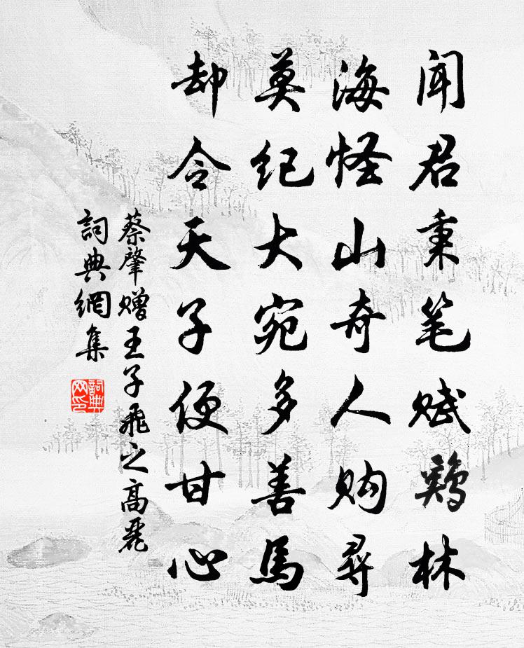 詩詞名句歷史字典書法欣賞書法字典國語詞典說文解字康熙字典古漢語字典標 題 作 者 詩 句 贈王子飛之高麗作者:蔡肇 朝代:宋代贈王子飛之高麗原文聞君秉筆賦雞林,海怪山奇人購尋。莫紀大宛多善馬,卻令天子便甘心。詩詞問答問:贈王子飛之高麗的作者是誰?答:蔡肇問:贈王子飛之高麗寫於哪個朝代?答:宋代蔡肇贈王子飛之高麗書法欣賞贈王子飛之高麗書法作品詩詞推薦送遷客虛中〔唐代〕倏忽墮鵷行,天南去路長。片言曾不諂,獲罪亦何傷。象戀藏牙浦,人貪賣子鄉。此心終合雪,去已莫思量。紹興以後祀五方帝六十首佚名〔宋代〕貳觴具舉,承神嘉虞。神具醉止,眷焉化都。我幾方新,我畝伊殖。時陽時雨,翳神之力。李憲仲哀詞蘇軾〔宋代〕大夢行當覺,百年特未滿。遑哀已逝人,長眠寄孤館。念我同年生,意長日月短。鹽車困騏驥,烈火廢圭瓚。後生送居厚弟二首劉克莊〔宋代〕少日魚同隊,中年雁失群。寧師楚勝舍,不羨洛機雲。春夢謝池草,冰銜漢合人。向來麾節處,盡說小馮君。白龍洞磨崖史少南〔宋代〕一自凌空降節飛,日瞻華表望翁歸。今猶香氣浮丹灶,時有仙韶殷翠微。青鳥山深藏宿霧,白猿洞敞納晨暉。榴房宿新安江深渡館寄鄭州王使君朱長文〔唐代〕霜飛十月中,搖落眾山空。孤館閉寒木,大江生夜風。賦詩忙有意,沈約在關東。滿江紅(壽留守正·月初三)劉仙倫〔宋代〕鳳歷更端,才信宿、年華方好。深院宇、祥風飄蕩,瑞煙繚繞。聞道君侯當誕日,歡聲解壓春寒峭。更九衢、煙火浪淘沙惠洪〔宋代〕山徑晚樵遠。深壑孱顏。孫山背後泊船看。手把遺編披白帔,剩卻清閒。籬落竹叢寒。漁業凋殘。水痕無底照秋寬與公曄飲西山坐上再和前韻李彌遜〔宋代〕了無一物可當情,休數行年問丙丁。世事於今渾似夢,醉魂從此不須醒。江流帶月分清濁,星漢無雲見緯經。酒盡長汀煙雨釋智愚〔宋代〕漪漪遠水漾明邊,沙鷺風晴刷羽翰。借使輞川收拾得,江湖莫作畫圖看。牡丹趙彥端〔宋代〕沉香亭北無訊息,魏國姚家亦寂寥。不見君王殿中見,溪園堂下雨瀟瀟。題龍潭石岩馬大同〔宋代〕攬轡觀風只課程,風雲要挹楚鄉清。晨旌幾礙觀山目,夜柝翻驚夢月情。觀者寧知部使者,平生元是老書生。滄浪頌證道歌證道歌釋印肅〔宋代〕多劫曾為忍辱仙,未曾頓悟此心源。遭人活剝如斯苦,學者當同救腦然。南鄉子(詠棣棠菊)陳師道〔宋代〕亂蕊壓枝繁。堆積金錢鬧作團。晚起塗黃仍帶酒,看看。衣剩腰肢故著單。薄瘦卻禁寒。牽引人心不放闌。擬折一次韻石芝蘇轍〔宋代〕雞鳴東海朝日新,光蒙洲島霧雨勻。一曦石上遍生耳,幽子自食無來賓。寄書乞取久未許,箬籠蕉囊海神戶。一掬次韻葉茵〔宋代〕燕入虛檐教子飛,風簾不捲和新詩。綠陰滿逕晴蜓小,正是梅黃欲雨時。銅瓶杜甫〔唐代〕亂後碧井廢,時清瑤殿深。銅瓶未失水,百丈有哀音。側想美人意,應非寒甃沉。蛟龍半缺落,猶得折黃金。為三狀元詠乾道民謠〔宋代〕翀峰龜嶺與龍嶼,三處山川實壯哉。相去之間不百里,七年三度狀元來。時司理求頌釋正覺〔宋代〕淨磨心鑒絕游塵,本際靈明自照神。個裡機回圓歷歷,化分百億大千身。朝日一曝背王安石〔宋代〕朝日一曝背,欣然忘夜寒。樵松煮澗水,既食取琴彈。彈作南風歌,歌罷坐長嘆。寤彼棲棲者,遺世良獨難。名句推薦萬里不惜死,一朝得成功。高適《塞下曲》 當君懷歸日,是妾斷腸時。李白《春思》 梨花院落溶溶月,柳絮池塘淡淡風。晏殊《無題·油壁香車不再逢》 君子修道立德,不謂窮困而改節佚名《孔子家語·在厄》 藥醫不死病,死病無藥醫。張南莊《何典·第三回》 時不可再,機不可失魏徵《隋書·列傳·卷三》 逢流星兮問路,顧我指兮從左。王逸《九思》 地白風色寒,雪花大如手。李白《嘲王歷陽不肯飲酒》 羈心積秋晨,晨積展游眺。謝靈運《七里瀨》 江心雲帶蒲帆重,樓上風吹粉淚香。嚴仁《鷓鴣天·惜別》