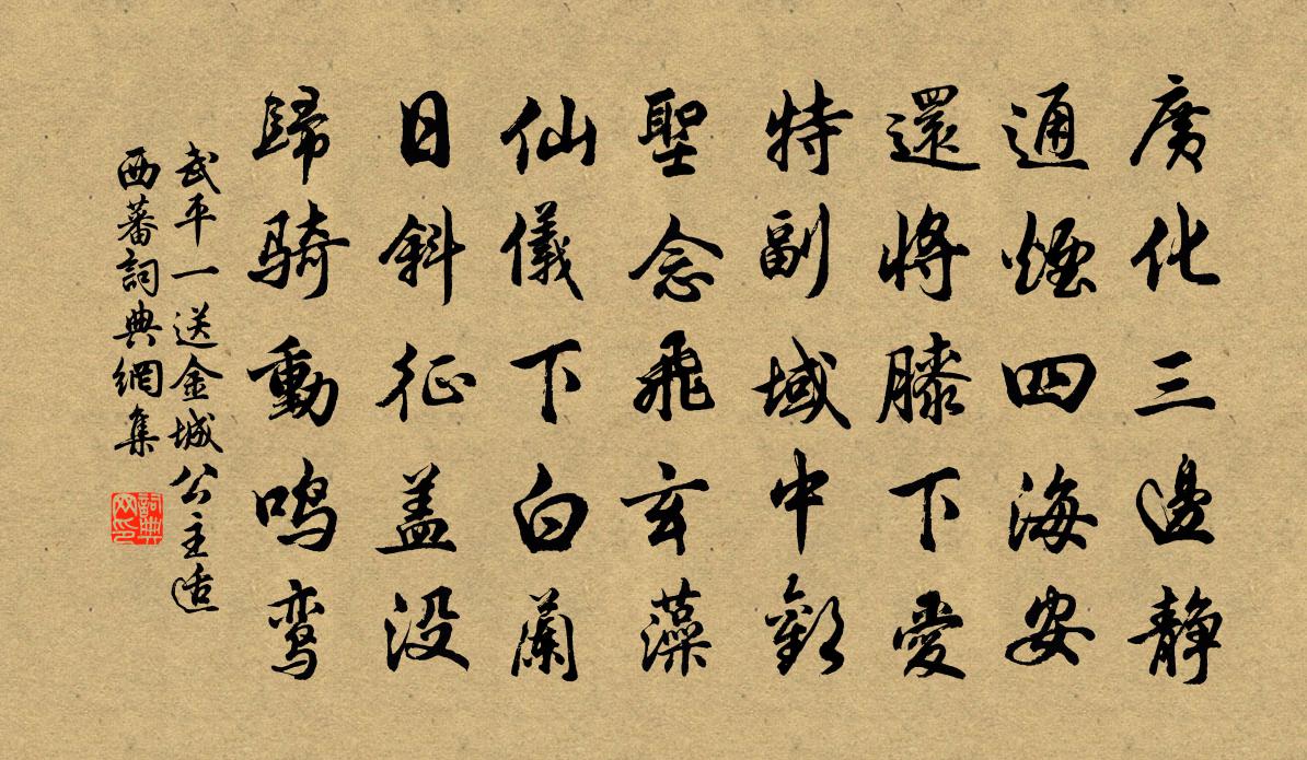 詩詞名句歷史字典書法欣賞書法字典國語詞典說文解字康熙字典古漢語字典標 題 作 者 詩 句 送金城公主適西蕃作者:武平一 朝代:唐代送金城公主適西蕃原文廣化三邊靜,通煙四海安。還將膝下愛,特副域中歡。聖念飛玄藻,仙儀下白蘭。日斜征蓋沒,歸騎動鳴鸞。詩詞問答問:送金城公主適西蕃的作者是誰?答:武平一問:送金城公主適西蕃寫於哪個朝代?答:唐代問:送金城公主適西蕃是什麼體裁?答:五律武平一送金城公主適西蕃書法欣賞送金城公主適西蕃書法作品注釋全唐詩:卷102_6詩詞推薦次韻陳殿丞除夜感懷李覯〔宋代〕浮世因循過。流年次第新,回思舊來事,都似夢中人。不飲偏嫌雪,多愁卻怕春。星魁欲寅位,五鼓莫頻頻。菩薩蠻(辛亥二月雪)趙師俠〔宋代〕東皇不受人間俗。為嫌花柳紛紅綠。特地閟春和。連延雨雪多。梅梢封玉蕊。春半開猶未。還恐怨韶華。吹綿作柳禁直楊億〔宋代〕鳳樓鴛瓦蟾波濕,眾籟聲沉百蟲蟄。仙盤雲表露成霜,何人夜斗年衣泣。芝泥香熟封詔書,河漢西傾移斗車。陰風【南呂】罵玉郎帶感皇恩採茶歌張可久〔元代〕富山元宵賞燈朱衣錦帶黃金鐙,前後羽林兵。當空皓月懸秋鏡,蘭麝馨。簫鼓鳴,天街淨。燈界珠繩,春藹花屏、秀亭秋懷十五首方回〔宋代〕薜荔絡奇石,芙蓉艷荒垣。寓目信所之,行行陟秋原。南州 * 月,已涼仍復暄。林樹略改色,沙湍才減痕。憶在胡騰兒李端〔唐代〕胡騰身是涼州兒,肌膚如玉鼻如錐。桐布輕衫前後卷,葡萄長帶一邊垂。帳前跪作本音語,拾襟攪袖為君舞。安西春陰偶成柬枯崖蒲壽宬〔宋代〕砌蘚頻侵綠,野花相避紅。不知昏與晝,惟見雨和風。有酒為寒盡,無詩非景窮。地爐煨芋火,時約老僧同。挽陸君實尹應許〔宋代〕誰使權奸釀禍深,末流無復救危枰。君臣霄壤難同死,杜稷丘墟可再生。叔寶井中空大辱,魯連海上特虛名。一家游茅山二首李中〔唐代〕綠蘚深迎步,紅霞爛滿衣。洞天應不遠,鸞鶴向人飛。茅許仙蹤在,煙霞一境清。夷希何許叩,松徑月空明。武陵春(賡何顯夫小舟有景)盧炳〔宋代〕紅荻黃蘆秋已老,妝點楚江頭。更有吳姬撥小橈。來往自妖嬈。款款艤舟臨別岸,短纜系花梢。料得前身是莫愁。齊謳行陸機〔魏晉〕營丘負海曲。沃野爽且平。洪川控河濟。崇山入高冥。東被姑尤側。南界聊攝城。海物錯萬類。陸產尚千名。孟諸次陳秘書韻釋慧遠〔宋代〕保福當年閒借問,鵝湖驟步入僧堂。定盤星上無深意,莫認鉤頭些子香。和梨花文同〔宋代〕素質靜相依,清香暖更飛。笑從風外歇,啼向雨中歸。江令歌瓊樹,甄妃夢玉衣。畫堂明月地,常此惜芳菲。九日懷京都舊遊賀鑄〔宋代〕昔年九日登臨處,把酒梁王舊吹台。今年九日登臨處,江上黃華殊未開。一川落日隨朝下,萬里西風送雁來。節物送二子從子宜讀書劉翼〔宋代〕三代讀書無寸功,又將此法教兒童。旁人笑我背時好,不背旁人背樂翁。望蓬萊王哲〔元代〕真大道,能結坎和離。認取五行不到處,須知父母未生時。此理勿難知。須速省,下手便修持。上有三光常照耀,南柯子(塔院僧閣)陳與義〔宋代〕矯矯千年鶴,茫茫萬里風。闌乾三面看秋空。背插浮屠千尺、冷煙中。林塢村村暗,溪流處處通。此間何似玉霄峰薄了固保義寫予真請贊釋正覺〔宋代〕靈靈而真,默默而神。眉毛低蓋眼,鼻孔真欺唇。千華上何須問佛,百草頭自然有春。一微塵里也來說法,三千界柏學士茅屋杜甫〔唐代〕碧山學士焚銀魚,白馬卻走身岩居。古人已用三冬足,年少今開萬卷餘。晴雲滿戶團傾蓋,秋水浮階溜決渠。富貴制除工部廊中出入署王禹偁〔宋代〕溫樹陰中別玉堂,應星猶得入文昌。莫嫌工部官曹慢,杜甫才名是外郎。名句推薦忠告而善道之,不可則止,毋自辱焉。孔子弟子《論語·顏淵篇》 楊柳青青江水平,聞郎江上唱歌聲。劉禹錫《竹枝詞二首·其一》 一夜嬌啼緣底事,為嫌衣少縷金華。韋莊《與小女》 深居俯夾城,春去夏猶清。李商隱《晚晴》 一重山,兩重山。山遠天高煙水寒,相思楓葉丹。李煜《長相思·一重山》 風蕭蕭而異響,雲漫漫而奇色。江淹《別賦》 數畝荒園留我住,半瓶濁酒待君溫。蘇軾《正月二十日往岐亭郡人潘古郭三人送余於女王城東禪莊院》 花明柳暗繞天愁,上盡重城更上樓。李商隱《夕陽樓》 楊柳散和風,青山澹吾慮。韋應物《東郊》 吹燈窗更明,月照一天雪。袁枚《十二月十五夜》