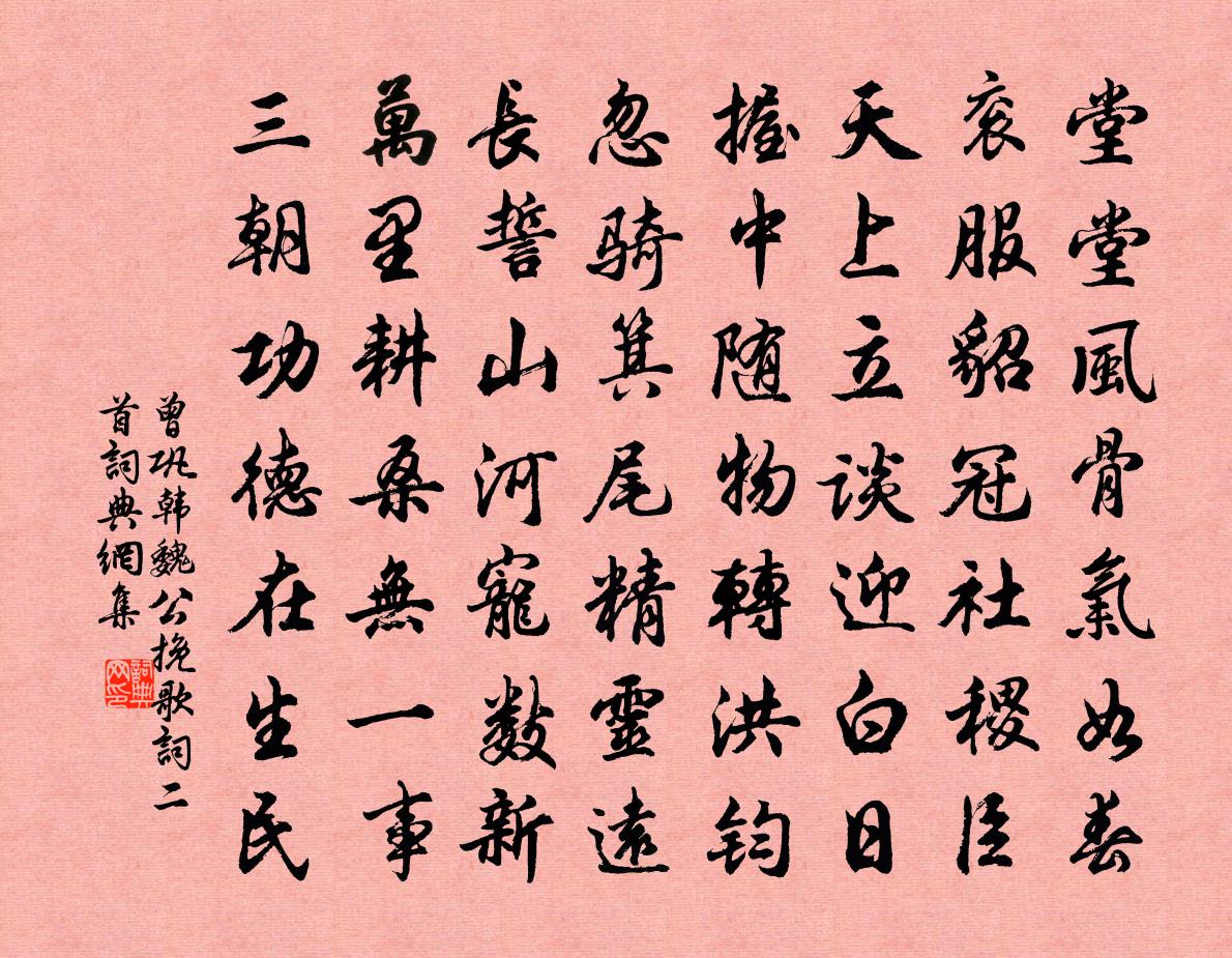 詩詞名句歷史字典書法欣賞書法字典國語詞典說文解字康熙字典古漢語字典標 題 作 者 詩 句 韓魏公輓歌詞二首作者:曾鞏 朝代:宋代韓魏公輓歌詞二首原文堂堂風骨氣如春,袞服貂冠社稷臣。天上立談迎白日,握中隨物轉洪鈞。忽騎箕尾精靈遠,長誓山河寵數新。萬里耕桑無一事,三朝功德在生民。詩詞問答問:韓魏公輓歌詞二首的作者是誰?答:曾鞏問:韓魏公輓歌詞二首寫於哪個朝代?答:宋代曾鞏韓魏公輓歌詞二首書法欣賞韓魏公輓歌詞二首書法作品詩詞推薦明發鴨步楊萬里〔宋代〕雨歲春船各一時,今年船快去年遲。青山面目何曾改,清曉看來別樣奇。應天長·一鉤初月臨妝鏡李璟〔唐代〕一鉤初月臨妝鏡,蟬鬢鳳釵慵不整。重簾靜,層樓迥,惆悵落花風不定。柳堤芳草徑,夢斷轆轤金井。昨夜更闌酒偈傾一百三十三首釋法薰〔宋代〕五祖鵓鳩啼,當機直下提。隔山尋蟻跡,能有幾人知。寄題密州蘇學士快哉亭太史雲此城之西北送客文同〔宋代〕出城送客客未來,主人到此先徘徊。地臨濰水極清曠,每為送客雙眼開。客來既坐歌管作,紅袖勸酒無停杯。主人頌古一百二十一首釋宗杲〔宋代〕金鰲一掣滄溟竭,徒自悠悠泛小舟。今日煙波無可釣,不須新月更為鉤。點絳唇(細香竹)王十朋〔宋代〕秀色娟娟,最宜雨沐風梳際。徑幽香細。草滴青襟袂。一日才無,便覺生塵態。軒窗外。數竿相對。不減王猷愛。反遠遊陸游〔宋代〕賣卻貂裘買釣舟,久將身世付悠悠。行歌西郭紅橋路,爛醉東關白塔秋。夜泊驛亭觀月上,曉登僧閣聽猿愁。一生題東丁水黃庭堅〔宋代〕古人題作東丁水,自古東丁直到今。我為改名方響洞,要知山水有清音。西上辭母墳陳去疾〔唐代〕高蓋山頭日影微,黃昏獨立宿禽稀。林間滴酒空垂淚,不見丁寧囑早歸。廨後木芙蓉梅堯臣〔宋代〕托根地雖卑,凌霜花亦茂。物稟固不遷,人情自為陋。幸與時菊開,誰嗟發孤秀。楚人搴木末,已見離騷就。妃子園范成大〔宋代〕露葉風枝驛騎傳,華清天上一嫣然。當時若識陳家紫,何處 * 更有園。白鶴山吳世范〔宋代〕靈壇古蹟自來夸,四望峰巒錦簇花。白鶴何來歸洞府,青山竟日鎖煙霞。言尋庭下燒丹灶,爭羨天邊返斗槎。我欲淳化鄉飲酒三十三章佚名〔宋代〕洋洋嘉魚,儜以芳罟。君子有德,嘉賓式歌且舞。送范景仁游洛中蘇軾〔宋代〕小人真暗事,閒退豈公難。道大吾何病,言深聽者寒。憂時雖早白,駐世有還丹。得酒相逢樂,無心所遇安。去年酬國子崔博士立之見寄劉禹錫〔唐代〕健筆高科早絕倫,後來無不揖芳塵。遍看今日乘軒客,多是昔年呈卷人。胄子執經瞻講坐,郎官共食接華茵。煩君戲題大年防禦蘆雁黃庭堅〔宋代〕揮毫不作小池塘,蘆荻江村落雁行。雖有珠簾藏翡翠,不忘煙雨罩鴛鴦。隱居二首釋文珦〔宋代〕流水保嘗有競,閒雲本亦無心。靜者不殊雲水,悠然自樂山林。醉蓬萊佚名〔宋代〕望秋高梨嶺,星下莆陽,慶生賢哲。問瑞蓂留兩莢。小試宏才,暫勞雕邑,布陽春仁澤。庭有馴禽,村無吠犬,稻玉清昭應宮上尊號三首真宗〔宋代〕皇靈垂祐,洪福彌隆。祗率綿宇,潔祀真容。嚴恭奉冊,對越清躬。睟容肅穆,懿號尊榮。禮成樂舉,福祿來同。亂石李商隱〔唐代〕虎踞龍蹲縱復橫,星光漸減雨痕生。不須並礙東西路,哭殺廚頭阮步兵。名句推薦路遙知馬力,日久見人心。佚名《增廣賢文·上集》 輪台東門送君去,去時雪滿天山路。岑參《白雪歌送武判官歸京》 人有不為也,而後可以有為。孟子《孟子·離婁章句下·第八節》 落紅不是無情物,化作春泥更護花。龔自珍《己亥雜詩·其五》 百畝庭中半是苔,桃花淨盡菜花開。劉禹錫《再游玄都觀》 俱懷逸興壯思飛,欲上青天攬明月。李白《宣州謝朓樓餞別校書叔雲》 二分塵土,一分流水蘇軾《水龍吟·次韻章質夫楊花詞》 小雨纖纖風細細,萬家楊柳青煙里。朱服《漁家傲·小雨纖纖風細細》 池台竹樹三畝餘,至今人道江家宅。劉禹錫《金陵五題·並序》 催成清淚,驚殘孤夢,又揀深枝飛去。陸游《鵲橋仙·夜聞杜鵑》