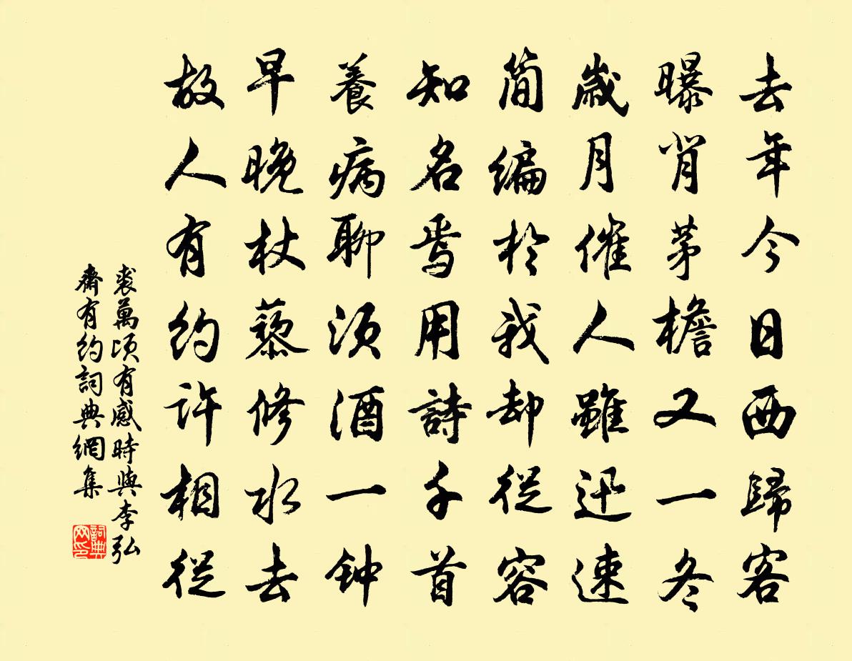 詩詞名句歷史字典書法欣賞書法字典國語詞典說文解字康熙字典古漢語字典標 題 作 者 詩 句 有感時與李弘齋有約作者:裘萬頃 朝代:宋代有感時與李弘齋有約原文去年今日西歸客,曝背茅檐又一冬。歲月催人雖迅速,簡編於我卻從容。知名焉用詩千首,養病聊須酒一鍾。早晚杖藜修水去,故人有約許相從。詩詞問答問:有感時與李弘齋有約的作者是誰?答:裘萬頃問:有感時與李弘齋有約寫於哪個朝代?答:宋代裘萬頃有感時與李弘齋有約書法欣賞有感時與李弘齋有約書法作品詩詞推薦浪淘沙王哲〔元代〕事事少相侵。物物無心。固精養氣本源深。得得仙人添惻隱,猿馬牢擒。玉樹可先臨。花綻黃金。清香窈裊出高岑點絳唇(書事)劉天迪〔宋代〕一笑相逢,依稀似是桃根舊。嬌波頻溜。悄可靈犀透。扶過危橋,輕引纖縴手。頻回首。何時還又。微月黃昏後。持節過京曹勛〔宋代〕與客西遊歷汴都,荒寒不復見吾廬。只今黯黯塵埃起,當日蔥蔥氣象無。雖覺人情猶向化,不知天意竟何如。遙思水次蘚花梅堯臣〔宋代〕秋日日霏霏,碧花生疊疊。水邊有神女,妝去遺翠靨。岸側小家婦,不知所宜愜。未得未還人,自將渾面帖。成都運司園亭十首海棠軒楊怡〔宋代〕花如窈窕人,宛在水中沚。當軒有餘妍,終日玩芳蘤。池清藻壓枝,波動魚爭蕊。錦帳想含春,歸心浩然起。蔣洋道中望太姥山四首陳嘉言〔唐代〕問俗驅王事,齋宮耐可期。寒花明絳節,孤月映摩尼。縹渺浮虛廊,蒼茫弄晚曦。三山如可接,莫遣漢臣歸。雲溪雜詠郭印〔宋代〕竹色琅玕立,花光錦繡舒。物情奚得喪,人意妄分疏。污淨川同納,媸妍鑒本虛。和光聊復爾,看取未形初。南窗偶書方岳〔宋代〕吾徒例迂疏,與世自少可。不工口囁嚅,正坐胸磊砢。折腰迂人情,高論常轗軻。歸哉夜窗雨,喜不失故我。琴尊瑞龍吟陳允平〔宋代〕長安路。還是燕乳鶯嬌,度簾遷樹。層樓十二闌乾,繡簾半卷,相思處處。漫憑佇。因念彩雲初到,瑣窗瓊戶。梨送方君節監丞劉克莊〔宋代〕世論喧啾眾竅鳴,先賢於此極持平。坡稱淳父文經世,沂惜希文諫近名。向去史書將有考,由來公議最無情。我衰暮春陸游〔宋代〕掠面微風吹宿醒,送春空有不勝情。風煙老盡王孫草,時聽桑間小婦聲。山水圖唐寅〔明代〕潦凈泉聲澀,秋高木影疏。天涯來旅雁,江上有鱸魚。郎官岩楊塤〔宋代〕碧玉莫遮千嶂石,黃金難買一溪雲。歌鐘沸地徒夸盛,爭似松風竟夕聞。榮木 其三陶淵明〔魏晉〕嗟予小子,稟茲固陋。徂年既流,業不增舊。志彼不捨,安此日富。我之懷矣,怛焉內疚。句邵雍〔宋代〕始信畫前原有易,自從刪後更無詩。寄送吳公明屯田通判秦州梅堯臣〔宋代〕一聞春禽婆餅焦,竹林山木生蕭條。憶君將向洛門去,胡馬無塵塞路遙。將軍本是漢丞相,玉帳坐辨牙旗梟。白面書事趙蕃〔宋代〕北風卷湖水,萬里雪欲狂。乘勢不自止,雲開日垂光。風伯益振厲,行子立欲殭。青女探其機,變作明日霜。湖水發舟劉過〔宋代〕寶氣亭前首問途,清飈日日送籧篨。丹楓無處不愁客,白路有情如導吾。青竹間垂任子釣,紫鱗時掣季鷹魚。煙波題西岩寺許應龍〔宋代〕修行極則到心安,靜處忙中只一般。談笑打開新鋪席,此身元不離 * 。偈頌一百零四首釋紹曇〔宋代〕聞道金輪出母胎,盡河沙界掃氛埃。想應新整乾坤手,多帶堯風舜日來。普天率土,壽域宏開。林下野人何祝獻,名句推薦搴帷拜母河梁去,白髮愁看淚眼枯。黃景仁《別老母》 楊柳千條送馬蹄,北來征雁舊南飛。納蘭性德《浣溪沙·楊柳千條送馬蹄》 想文君望久,倚竹愁生步羅襪。姜夔《八歸·湘中送胡德華》 大漠西風急,黃榆涼葉飛。田錫《塞上曲》 戰士軍前半死生,美人帳下猶歌舞。高適《燕歌行》 明年豈無年,心事恐蹉跎。蘇軾《守歲》 嫁得瞿塘賈,朝朝誤妾期。李益《江南曲》 長驅入,歌台舞榭,風卷落花愁徐君寶妻《滿庭芳·漢上繁華》 春閨月,紅袖不須啼。元好問《江月晃重山·初到嵩山時作》 黃河水,水闊無邊深無底,其來不知幾千里。貢泰父《黃河行》