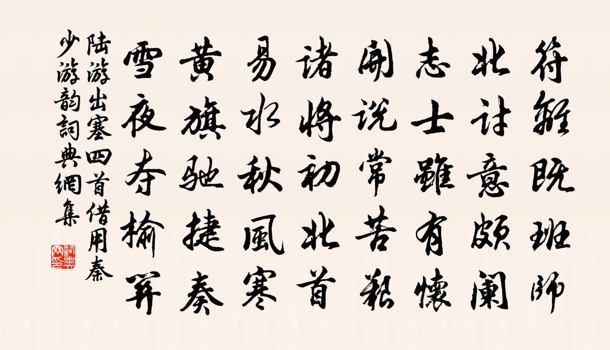 詩詞名句歷史字典書法欣賞書法字典國語詞典說文解字康熙字典古漢語字典標 題 作 者 詩 句 出塞四首借用秦少游韻作者:陸游 朝代:宋代出塞四首借用秦少游韻原文符離既班師,北討意頗闌。志士雖有懷,開說常苦艱。諸將初北首,易水秋風寒。黃旗馳捷奏,雪夜奪榆關。詩詞問答問:出塞四首借用秦少游韻的作者是誰?答:陸游問:出塞四首借用秦少游韻寫於哪個朝代?答:宋代問:陸游的名句有哪些?答:陸游名句大全陸游出塞四首借用秦少游韻書法欣賞出塞四首借用秦少游韻書法作品詩詞推薦代贊羅漢釋紹曇〔宋代〕靠葛藤樁,握龜毛拂。絕學無為,黑山鬼窟。直饒瞥轉機輪,眼裡聞香,耳中觀色。我且問,瓶內底是何物。木蘭花慢 贈吹觱篥者張嘴兒暨乃婦田氏合曲元好問〔金代〕要新聲陶寫,奈聲外有聲何。愴銀字安清,珠繩瑩滑,怨感相和。風流故家人物,記諸郎、吹管念奴歌。落日邯鄲和僕射相公朝回見寄韓愈〔唐代〕盡瘁年將久,公今始暫閒。事隨憂共減,詩與酒俱還。放意機衡外,收身矢石間。秋颱風日迥,正好看前山。洞庭立峰袁說友〔宋代〕絕壁橫翔勢,當軒偉岸姿。一峰雲欲下,亂蘚雨頻滋。獨立霜寒耐,銜空月影篩。緬懷黃石事,猶想谷城時。掃花游(李仁山別墅)趙文〔宋代〕結廬勝境,似舊日曾游,玉連佳處。萬花織組。愛迴廊宛轉,楚腰束素。度密穿青,上有燕支萬樹。探梅去。正竹扇子詩李石〔宋代〕眠界琉璃鳥度,腹中沉瀣蟬清。猗蘭羲獻父子,瘦竹夷齊弟兄。伯父《送先人下第歸蜀》詩云︰人稀野店休安蘇軾〔宋代〕瘦骨寒將斷,衰髯摘更稀。未甘為死別,猶恐得生歸。次韻趙克勤吏部六首劉克莊〔宋代〕籬邊雪畔影橫斜,應訝何鄉太瘦些。未可被渠瞞老眼,玉堂茅舍一般花。送新酒糟蟹與賈之奇五首曹勛〔宋代〕新詩慰我勝浮醅,豈待杯盤更舉罍。但原車中無折齒,何憂舉案乏持杯。黃蜀葵文同〔宋代〕錦江何日別,漆水今朝見。清露染顏色,秋鵝一分淺。念奴嬌(壽洪運管·五月初五)王邁〔宋代〕見山堂上,畫簾卷、猶是清和天氣。綠水紅蓮,雅稱得、瑤碧冰壺標緻,名在丹台,籍通紫府,遊戲人間世。三洪送李介甫赴官塘湯氏館仇遠〔宋代〕東盧山下義門中,弘開講席招蜀翁。主人擇客又擇主,童蒙求我我求童。俊傑識時審出處,道義結交全始終。惟應為九華王此山賦寧石鄭起〔宋代〕我謂此山天作石,石不是石人不識。千年野鶴獨見君,石上采芝石上吃。曹主簿涇自卜壽藏追范石湖韻謹依虛谷使君例汪炎昶〔宋代〕一抔早已瞰陬隅,君子從渠自犬鳥。誰泄天機似文展,爭持地券與堯夫。新阡競奪前人隴,高家多踰舊日模。隨分喜雨石介〔宋代〕學作昇平喜雨吟,東皋微破滿犁深。已開萬乘焦勞慮,應解三公燮理心。天捉乖龍鞭見血,雷驅和氣泄為霖。農夫上行杯孫光憲〔唐代〕草草離亭鞍馬,從遠道、此地分襟。燕宋秦吳千萬里,無辭一醉。野棠開,江草濕,佇立,沾泣,征騎駸駸。離棹太廟樂章皇帝閣六首周麟之〔宋代〕翠水冰融盡,雕櫳日上遲。東風報花信,先拂萬年枝。和吳夢授韻王炎〔宋代〕卷舒有道在隨時,隱約何須感慨為。末路老夫甘退縮,華途吾友尚驅馳。準繩行義當趨正,淘練文章自出奇。舉世秋熱白玉蟾〔宋代〕槐窗過兩頃雨,竹榻無一張涼。風揭蓮花白起,月篩桂子黃香。點絳唇(別自和)向子諲〔宋代〕綠水池塘,笑看野鴨雙飛過。正當呆坐。紉鼻須還我。盡日張弓,許久無人和。還知麽。難得全個。不免須明破。名句推薦不畏浮雲遮望眼,自緣身在最高層。王安石《登飛來峰》 從時者,猶救火、追亡人也,蹶而趨之,唯恐弗及。左丘明《國語·越語·越興師伐吳而弗與戰》 郎到斷橋須有路,儂住處,柳如金。張惠言《江城子·填張春溪西湖竹枝詞》 辭柯霜葉,飛來就我題紅。朱庭玉《天淨沙·秋》 不須更上新亭望,大不如前灑淚時。虞集《挽文丞相》 淮水東邊舊時月,夜深還過女牆來。劉禹錫《金陵五題·石頭城》 迎醉面,暮雪飛花,幾點黛愁山暝。吳文英《十二郎·垂虹橋》 盤飧市遠無兼味,樽酒家貧只舊醅。杜甫《客至》 宮中彩女顏如花,飄然揮手凌紫霞,從風縱體登鸞車。李白《飛龍引二首·其一》 欲祭疑君在,天涯哭此時。張籍《沒蕃故人》
