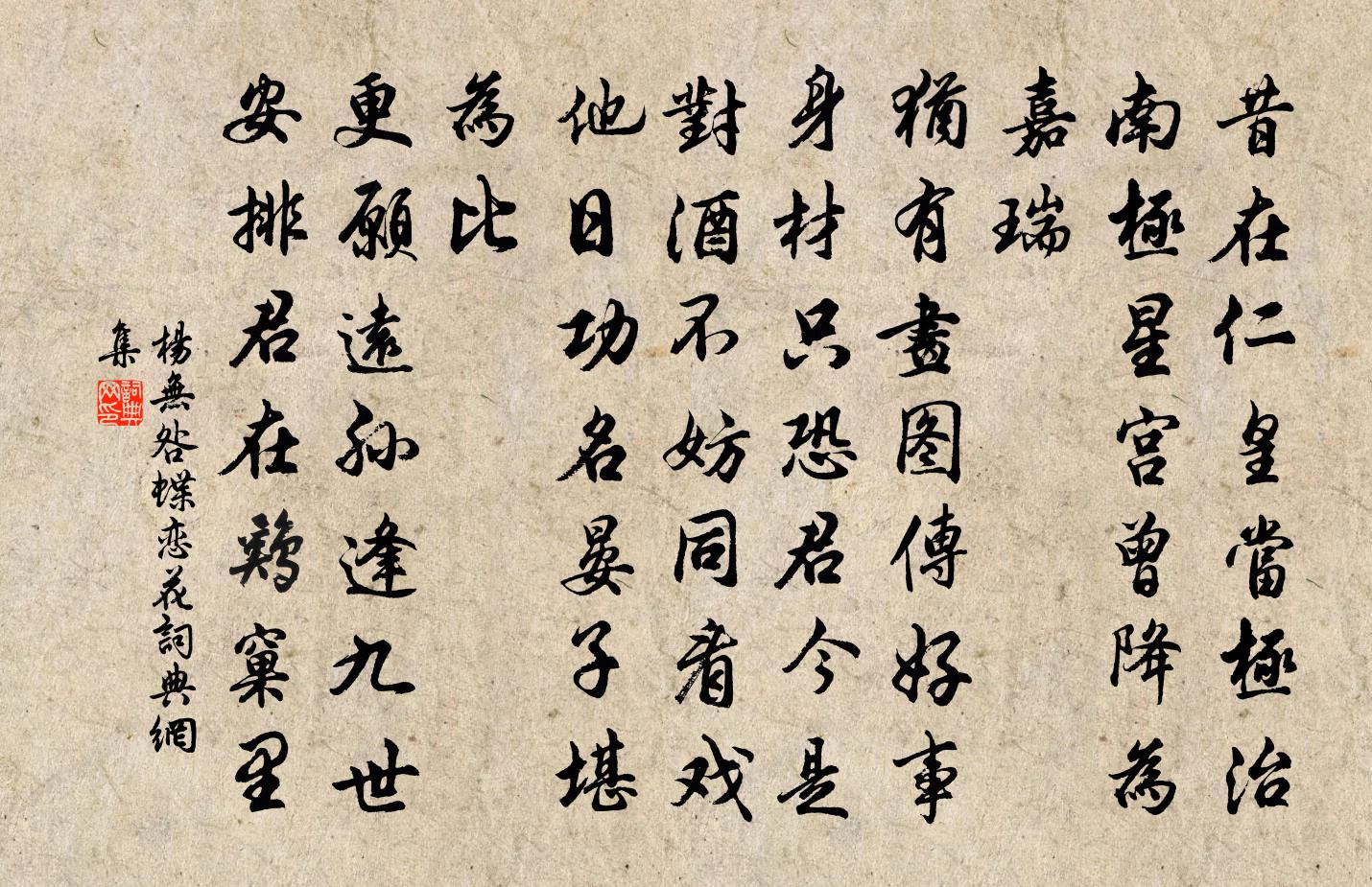 詩詞名句歷史字典書法欣賞書法字典國語詞典說文解字康熙字典古漢語字典標 題 作 者 詩 句 蝶戀花作者:楊無咎 朝代:宋代蝶戀花原文昔在仁皇當極治。南1~1極1*1星宮,曾降為嘉瑞。猶有畫圖傳好事。身材只恐君今是。對酒不妨同看戲。他日功名,晏子堪為比。更願遠孫逢九世。安排君在雞窠里。詩詞問答問:蝶戀花的作者是誰?答:楊無咎問:蝶戀花寫於哪個朝代?答:宋代問:蝶戀花是什麼體裁?答:詞楊無咎蝶戀花書法欣賞蝶戀花書法作品詩詞推薦臨江仙(西湖)孫居敬〔宋代〕觸事老來情緒懶,西湖債未曾還。試呼小艇訪孤山。昔年鷗鶴侶,總笑鬢斕斑。仙去坡翁山耐久,煙霏空翠憑闌。陸參議輓詞樓鑰〔宋代〕中外衣冠盛,流傳識後凋。聲名三語掾,身世半僧寮。寶晉書尤逸,坡仙隱可招。梅溪殘月墮,蕪沒舊風標。清明日自西午橋至瓜岩村有懷張繼〔唐代〕晚霽龍門雨,春生汝穴風。鳥啼官路靜,花發毀垣空。鳴玉慚時輩,垂絲學老翁。舊遊人不見,惆悵洛城東。送梅龍圖王安石〔宋代〕子真家世子云鄉,風力才華豈易當。回首古人多隱約,致身今日獨輝光。謨明久合分三府,治劇聊須試一方。從此懷蔣力父鑒倉王邁〔宋代〕人生聚散類團沙,偶得聊驂餞歲華。竹杖徐忘了木橋,村醪小酌勝如茶。鄉情喜似輕千里,詩味相投各一家。便好戴時芳時可學子吳叔度文可載酒西坑勞苦陳著〔宋代〕驚魂何事到西坑,豈是三生願莫償。兩寺鼓鍾醒客夢,一村草木助吟香。人情物變多時樣,水色山光自古妝。我本舟中和陳子東王柏〔宋代〕低垂紙帳絕纖埃,冷透孤衾夢易回。宿霧未收沙瀨黑,大江才近水程開。細搜景物歸詩句,盡逐羈愁入酒杯。最是十五弟生日項安世〔宋代〕合宮雷雨下江城,重把賢書舊貢升。入月穿天搜伏兔,摶風系水化新鵬。當年吉夢渾身喜,今日成名望汝能。千歲妙相寺清節軒徐良弼〔宋代〕此君高節抗浮雲,環寺幽亭分外清。凌歷雪霜真有守,招邀日月處多情。更無一點紅塵到,但覺中襟爽氣生。爭似上丞相壽戴栩〔宋代〕天地深仁不自知,物才有識荷恩私。前年倉鑰塵遮面,今日朝班笏拄頤。宛若凌虛生羽翮,了無報效及毫絲。平生夜宴石魚湖作元結〔唐代〕風霜雖慘然,出遊熙天正。登臨日暮歸,置酒湖上亭。高燭照泉深,光華溢軒楹。如見海底日,曈曈始欲生。夜寒偈頌七十一首釋了惠〔宋代〕撥亂乾坤老賊精,天教化火 * 身。賊心賊行難磨滅,二月依前是仲春。風入松周紫芝〔宋代〕禁菸過後落花天。無奈輕寒。東風不管春歸去,共殘紅、飛上鞦韆。看盡天涯芳草,春愁堆在闌乾。楚江橫斷夕陽贈嶺上老人蘇軾〔宋代〕鶴骨霜髯心已灰,青松合抱手親栽。問翁大庾嶺頭住,曾見南遷幾個回。龍學尚書新安侯羅公輓詞范成大〔宋代〕今代丹台籍,頻年綠野居。鐵冠真御史,革履舊尚書。短世浮雲盡,平生半稿余。人言公不朽,蘭玉照前除。題妙寂僧無礙明碧軒陳宓〔宋代〕何處便宜養性情,禪床更著玉縱橫。應是高人幽隱地,開軒遠月迥雙明。送司馬季思通守沿檄天台二首謝伋〔宋代〕靜聽天台事,茲行毋憚勞。水和青嶼出,霞起赤城高。佛寺炊烏飯,仙宮壓白醪。奉符須少緩,處處可游遨。中秋無月複次韻范成大〔宋代〕屋山從卷杜陵茅,門徑慵芟仲蔚蒿。澹澹白虹風暈壯,紛紛蒼狗雨雲高。凌空累箸仙無術,半夜撞鐘句謾豪。枵腹寄劉秀才釋重顯〔宋代〕遠遠飛來一幅書,愈風誠重複何如。相逢相見未期日,目斷千山插太虛。奉答岑參補闕見贈杜甫〔唐代〕窈窕清禁闥,罷朝歸不同。君隨丞相後,我往日華東。冉冉柳枝碧,娟娟花蕊紅。故人得佳句,獨贈白頭翁。名句推薦思君如滿月,夜夜減清輝。張九齡《賦得自君之出矣》 苔深不能掃,落葉秋風早。李白《長干行二首》 喪禮者,以生者飾死者也,大象其生以送其死也。故事死如生,事亡如存,終始一也。荀子《荀子·禮論》 飢而欲食,寒而欲暖,勞而欲息,好利而惡害,是人之所生而有也。荀子《荀子·榮辱》 不忍覆余觴,臨風淚數行納蘭性德《菩薩蠻·催花未歇花奴鼓》 八月湖水平,涵虛混太清孟浩然《望洞庭湖贈張丞相/臨洞庭湖贈張丞相》 秋到邊城角聲哀,烽火照高台。陸游《秋波媚·七月十六日晚登高興亭望長安南山》 長江悲已滯,萬里念將歸。王勃《山中》 尋尋覓覓,冷冷清清,淒悽慘慘戚戚。李清照《聲聲慢·尋尋覓覓》 桃花三十六陂,鮫宮睡起,嬌雷乍轉。吳文英《瑞龍吟·德清清明競渡》