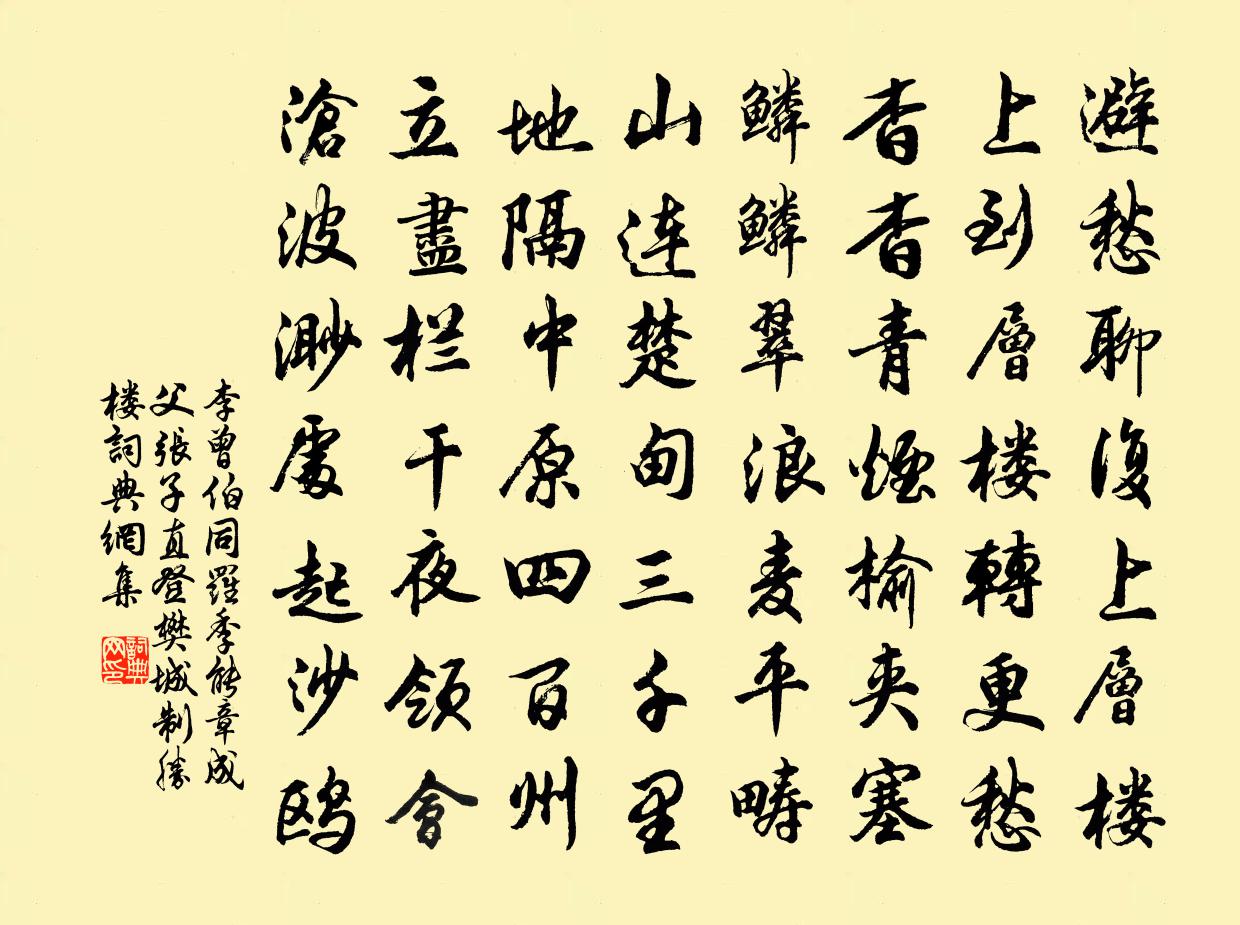 詩詞名句歷史字典書法欣賞書法字典國語詞典說文解字康熙字典古漢語字典標 題 作 者 詩 句 同羅季能章成父張子直登樊城制勝樓作者:李曾伯 朝代:宋代原文避愁聊復上層樓,上到層樓轉更愁。杳杳青煙榆夾塞,鱗鱗翠浪麥平疇。山連楚甸三千里,地隔中原四百州。立盡欄乾夜領會,滄波渺處起沙鷗。詩詞問答問:《同羅季能章成父張子直登樊城制勝樓》的作者是誰?答:李曾伯問:該詩寫於哪個朝代?答:宋代書法欣賞同羅季能章成父張子直登樊城制勝樓書法作品詩詞推薦夢中絕句蘇軾〔宋代〕楸樹高花欲插天,暖風遲日共茫然。落英滿地君方見,惆悵春光又一年。金縷曲顧貞觀〔清代〕我亦飄零久!十年來,深恩負盡,死生師友。宿昔齊名非忝竊,只看杜陵窮瘦,曾不減,夜郎孱愁,薄命長辭知已和人雪詩衛博〔宋代〕白玉樓台近廣寒,冷侵銀海眩光翻。只應天上梨花老,聊作人間柳絮繁。慶卜有年先一白,喜隨寬令到千門。使君奔亡道中五首李白〔唐代〕蘇武天山上,田橫海島邊。萬重關塞斷,何日是歸年。亭伯去安在,李陵降未歸。愁容變海色,短服改胡衣。談笑辛丑中秋曲阜橋倚樓方回〔宋代〕月漸高雖小,星全隱不明。老夫偶有酒,獨酌過三更。世間千萬戶,誰是倚樓人。今夜中秋月,危欄一病身。飲馬歌·邊頭春未到曹勛〔宋代〕邊頭春未到。雪滿交河道。暮沙明殘照。塞烽雲間小。斷鴻悲。隴月低。淚濕征衣悄。歲華老。瑤台聚八仙/新雁過妝樓張炎〔宋代〕老圃堪嗟。深夜雨、紫英猶傲霜華。暖宿籬根,飛去想怯寒沙。採摘浮杯如戲水,晚香淡似夜來些。背風斜。翠苔滕子京以真籙相示因以贈之范仲淹〔宋代〕泰山采芝人,吏隱清淮濱。金函秘實籙,奉之如高真。謂子有仙志,興言一相示。叩頭鳴天鼓,玉書粲然異。白雲閱萬曆、泰昌、天啟實錄偶成王扌炎〔清代〕紅丸應是誤庸醫,梃擊風癲事可疑。 獨有移宮宜早決,楊漣當日系安危。 牧牛詞高啟〔明代〕爾牛角彎環,我牛尾禿速,共拈短笛與長鞭,南隴東岡去相逐。日斜草遠牛行遲,牛勞牛飢唯我知;牛上唱歌牛下君子有所恨晁說之〔宋代〕君子有所恨,擊指血不躁。相望已千古,欲語安得到。荊卿無劍術,商君棄霸道。二子苟不然,功烈回穹昊。嗟哉庵居史彌寧〔宋代〕倒影晴溪蘸碧峰,庵居活計盡從容。懶能著眼看時事,相約梅花住過冬。懷州客舍方乾〔唐代〕誤飲覃懷酒,誰知滯去程。朝昏太行色,坐臥沁河聲。白道穿秦甸,嚴鼙似戍城。鄰雞莫相促,遊子自晨征。閉門陳杰〔宋代〕閉門風雨九十日,生物趨新曾未休。適見桃枝暗明月,漸聞柳絮逐江流。詳定試卷二首王安石〔宋代〕童子常夸作賦工,暮年羞悔有楊雄。當時賜帛倡優等,今日論才將相中。細甚客卿因筆墨,卑於爾雅注魚蟲。漢家酬王秀才齊己〔唐代〕相於分倍親,靜論到吟真。王澤曾無外,風騷甚少人。鴻隨秋過盡,雪向臘飛頻。何處多幽勝,期君作近鄰。失題王昌齡〔唐代〕奸雄乃得志,遂使群心搖。赤風盪中原,烈火無遺巢。一人計不用,萬里空蕭條。醉垂鞭(錢塘送祖擇之·般涉調)張先〔宋代〕酒面灩金魚。吳娃唱。吳潮上。玉殿白麻書。待君歸後除。勾留風月好。平湖曉。翠峰孤。此景出關無。西州空畫挽德慶塗守二首陳元晉〔宋代〕鄉粉生也晚,嶺外偶同寅。齒我子侄行,情如兄弟親。不嫌同幕辯,要作一州春。滿澗題字見,回頭更愴神。痴兒王邁〔宋代〕痴兒纏五歲,器局稍精明。弄筆夸郎罷,窺鸞效女兄。顧瞻眸子俊,酬答舌頭輕。但願身長健,看渠骨骼成。名句推薦歸去來兮,吾歸何處?蘇軾《滿庭芳·歸去來兮》 憐不可存,憐人者無證其忠。友宜重懲,援友者惟其害。來俊臣《羅織經·問罪卷第十》 有才無德,如家無主而奴用事矣,幾何不魍魎猖狂。洪應明《菜根譚·概論》 輕舟泛月尋溪轉,疑是山陰雪後來李白《東魯門泛舟二首》 雪虐風饕愈凜然,花中氣節最高堅。陸游《落梅》 江上陰雲鎖夢魂,江邊深夜舞劉琨。譚用之《秋宿湘江遇雨》 陽關萬里道,不見一人歸。庾信《重別周尚書》 夕陽鳥外,秋風原上,目斷四天垂。柳永《少年游·長安古道馬遲遲》 落日照大旗,馬鳴風蕭蕭。杜甫《後出塞五首》 回頭流水小橋東,煙掃畫樓出。雷應春《好事近·梅片作團飛》