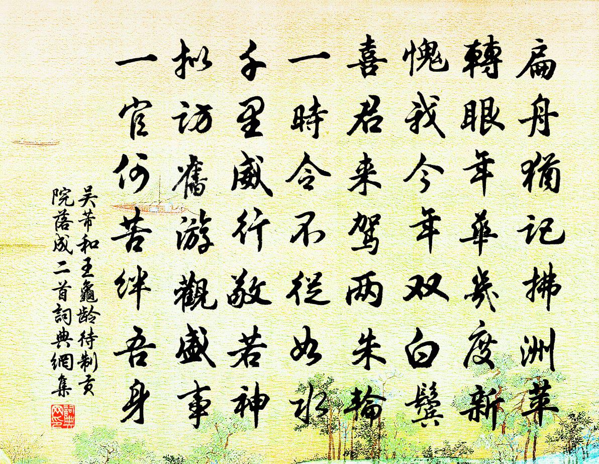 詩詞名句歷史字典書法欣賞書法字典國語詞典說文解字康熙字典古漢語字典標 題 作 者 詩 句 和王龜齡待制貢院落成二首作者:吳芾 朝代:宋代和王龜齡待制貢院落成二首原文扁舟猶記拂洲苹,轉眼年華幾度新。愧我今年雙白鬢,喜君來駕兩朱輪。一時令不從如水,千里威行敬若神。擬訪舊遊觀盛事,一官何苦絆吾身。詩詞問答問:和王龜齡待制貢院落成二首的作者是誰?答:吳芾問:和王龜齡待制貢院落成二首寫於哪個朝代?答:宋代吳芾和王龜齡待制貢院落成二首書法欣賞和王龜齡待制貢院落成二首書法作品詩詞推薦瀟湘八景詩瀟湘夜雨張經〔宋代〕終夜雨瀟瀟,悶殺孤舟客。滴滴打蓬聲,錯訝靈妃瑟。蝶戀花(佳人)蘇軾〔宋代〕一顆櫻桃樊素口。不愛黃金,只愛人長久。學畫鴉兒猶未就。眉間已作傷春皺。撲蝶西園隨伴走。花落花開,漸解雪車劉叉〔唐代〕臘令凝綈三十日,繽紛密雪一復一。孰雲潤澤在枯荄,闤闠餓民凍欲死。死中猶被豺狼食,官車初還城壘未完備。浪淘沙(汴州)裴湘〔宋代〕萬國仰神京。禮樂縱橫。蔥蔥佳氣鎖龍城。日御明堂天子聖,朝會簪纓。九陌六街平。萬國充盈。青樓弦管酒如澠汪正夫為人撰墓誌有中金之贈因以二絕戲之鄭獬〔宋代〕寶字奇文刻夜台,黃金論價未當才。諸生可是無豪氣,不就韓公乞取來。擁鼻吟/吳音子賀鑄〔宋代〕別酒初銷,憮然弭棹蒹葭浦。回首不見高城,青樓更何許。大艑軻峨,越商巴賈。萬恨龍鍾,篷下對語。指征路。次韻王鞏代書蘇轍〔宋代〕去年河上送君時,我醉看君倒接籬。一笑便成經歲隔,扁舟重到滿城知。舊傳北海偏憐客,新怪東方苦訴飢。應笑空酒壺陸游〔宋代〕銅壼受五升,中貯太古醇。相從亦已久,一朝委流塵。我豈少恩哉?白頭乃如新。誰知矮道士,亦作斥仙人?益壽美金花侯善淵〔元代〕忽然省悟。兒女妻奴全不顧。萬事都忘。一性恬然道自常。天霓清福。契道登真明上德。微宴心光。丹碧瑛華益壽雜吟 其三王冕〔元代〕巢父誠辟世,許由真隱淪。勢利既已忘,天子不得臣。棲身碧山中,洗耳清澗濱。悠悠太古懷,坐看花鳥春。所以蠟梅四首楊萬里〔宋代〕{上艹下含}頭元不是花房,融蠟熬酥戲滴將。忽見微舒金爪甲,不知中有紫香囊。持國遺食梅堯臣〔宋代〕乞食非為貧,妻病妾且死。晨爨不暖釜,朝飯亦輟匕。遺我我所恤,食我我所恥。我恥曾我求,我恤寧我止。應乏句張嵲〔宋代〕歸家淨洗如椽筆,準擬燕然勒駿功。別陳景明二首黃公度〔宋代〕董晁大策無今古,曾據龍頭拜未央。天府帶頒腰覺重,露門茗賜齒餘香。麻詞一掃千言就,玉節三持萬里強。自是三界蘇泂〔宋代〕風日催曛暮,江溪半濁清。春寒歸雁急,沙遠落鷗驚。有志詩書誤,無家去就輕。短篷扃不寐,高枕念平生。句張鵬飛〔宋代〕蒼天定俾期頤壽,會看芸書聘五吏。劉益之判院挽章姜特立〔宋代〕傾蓋如今五十春,中間還得綴華姻。單于萬里同哀使,馬援一鄉稱善人。告老已能官及子,頒恩更喜爵榮親。佳城賦決月陳文蔚〔宋代〕每薦盤餐自覺清,嘗於雨後擷其英。未言服餌收奇效,翠葉黃花眼早明。奉和魯望早春雪中作吳體見寄皮日休〔唐代〕威仰噤死不敢語,瓊花雲魄清珊珊。溪光冷射觸鸀鳿,柳帶凍脆攢欄桿。竹根乍燒玉節快,酒面新潑金膏寒。全吳將離澧浦置酒野嶼奉懷沈正字昆弟三人聯登高第李群玉〔唐代〕春月三改兔,花枝成綠陰。年光東流水,浩嘆傷羈心。酌桂煙嶼晚,鴂鳴江草深。良圖一超忽,萬恨空相尋。上國名句推薦柳下桃蹊,亂分春色到人家。秦觀《望海潮·洛陽懷古》 積薄而為厚,聚少而為多劉向《戰國策·秦四·或為六國說秦王》 佳辰強飲食猶寒,隱几蕭條戴鶡冠。杜甫《小寒食舟中作》 天意憐幽草,人間重晚晴。李商隱《晚晴》 寒雨連天夜入吳,平明送客楚山孤。王昌齡《芙蓉樓送辛漸二首》 雲物不殊鄉國異,教兒且覆掌中杯。杜甫《小至》 滿街楊柳綠絲煙,畫出清明二月天。韋莊《丙辰年鄜州遇寒食城外醉吟五首》 積善逢善,積惡逢惡。馮夢龍《喻世明言·卷二十六》 楚天千里清秋,水隨天去秋無際。辛棄疾《水龍吟·登建康賞心亭》 衣不如新,人不如故。佚名《古艷歌》