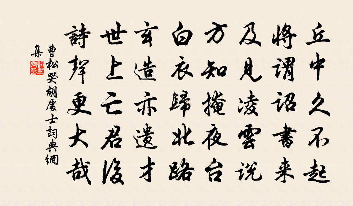 詩詞名句歷史字典書法欣賞書法字典國語詞典說文解字康熙字典古漢語字典標 題 作 者 詩 句 哭胡處士作者:曹松 朝代:唐代哭胡處士原文丘中久不起,將謂詔書來。及見凌雲說,方知掩夜台。白衣歸北路,玄造亦遺才。世上亡君後,詩聲更大哉。詩詞問答問:哭胡處士的作者是誰?答:曹松問:哭胡處士寫於哪個朝代?答:唐代曹松哭胡處士書法欣賞哭胡處士書法作品注釋全唐詩:卷717-10詩詞推薦謝君植矮梅百許株蟠屈如輪臘至皆著花灑灑可喻良能〔宋代〕孤竹低回首陽下,許由偃蹇箕山巔。謝君雅有林泉趣,種得江梅如二賢。南州臘月溫和早,賴有冰花除熱惱。鱗差洛水羅鄴〔唐代〕一道潺湲濺暖莎,年年惆悵是春過。莫言行路聽如此,流入深宮悵更多。橋畔月來清見底,柳邊風緊綠生波。縱然寄題趙山台蓮花方丈釋道璨〔宋代〕四壁縱橫都十尺,門對若耶溪水碧。畫闌漠漠吹香風,綠窗練練浮秋色。中有詩家白玉顏,飲露沐芳度朝夕。當軒山居朱慶餘〔唐代〕歸來青壁下,又見滿籬霜。轉覺琴齋靜,閒從菊地荒。山泉共鹿飲,林果讓僧嘗。時復收新藥,隨雲過石樑。小閣高似孫〔宋代〕料理閒如舊,依還略似家。自添磨硯水,多買入瓶花。有客談游墅,催奴設賜茶。悠悠江海意,風雪滿兼葭。緣識宋太宗〔宋代〕紫檀金線槽偏蹙,撥弄朱弦敲冰玉。指法從來天下聞,翻成盡入昇平曲。傳之世上五音足,希夷道聽化民俗。盤龍答梅聖俞靈烏賦范仲淹〔宋代〕危言遷謫向江湖,放意雲山道豈孤。忠信平生心自許,吉凶何卹賦靈烏。渠流沈說〔宋代〕岸石濕黏萍,一渠流水清。每來疑雨過,少立見魚行。樹隔炎歊遠,橋分午影平。主人契幽事,客到出相迎。送趙令赴江陵項安世〔宋代〕平生所聯趙景明,太阿出匣百壬死。不令赤手□□□,亦合麻鞋見天子。霜風獵獵鬢毛斑,萬里水縣菰蒲間。妻兒次韻游山門寺望文脊山王安石〔宋代〕宣城封百山間,封文脊尤奇封峰。拔出封飛鳥上,圖畫難為容。聞昔有幽人,捫蘿追赤松。遺形此古室,孤坐鹿裘春秋戰國門。莊公周曇〔唐代〕齊甲強臨力有餘,魯莊為戰念區區。魚麗三鼓微曹劌,肉食安能暇遠謨。禪人並化主寫真求贊釋正覺〔宋代〕雲水老身,叢林陳人。發毛已雪,鼻氣猶春。平等應緣也心心佛佛,自然說法也剎剎塵塵。回途復妙,弄假像真。雲沈生梅堯臣〔宋代〕稚子每多疾,始與藥物親。由茲沈生跡,遂歷吾門頻。我居無鳥鼠,乃知屋室貧。舉世競趨利,爾非閭井人。天窗白玉蟾〔宋代〕層頭除卻數條椽,政好臨風對月眠。行客只從門外過,豈知屋裡有青天。白帝城曾慥〔宋代〕白帝城頭路,逶迤一徑遙。高堂臨峽口,暴水沒山腰。隔岸魚施網,橫江鐵貫橋。神妃翻覆手,願賜雨連宵。示槱錢時〔宋代〕詩成正自不因題,看取風人發興時。語到口頭無可奈,未須搜攪古吟詩。七夕李流謙〔宋代〕火金鏖攻電雷擊,風從西來火折北。向來勝負吾已分,物極而顛勢其必。露盤清濯房櫳秋,冰壺冷浸乾坤骨。明河和殷協律琴思白居易〔唐代〕秋水蓮冠春草裙,依稀風調似文君。煩君玉指分明語,知是琴心佯不聞。宮詞王珪〔唐代〕翠鈿帖靨輕如笑,玉鳳雕釵裊欲飛。拂曉賀春皇帝閣,彩衣金勝近龍衣。冬夜聞蟲白居易〔唐代〕蟲聲冬思苦於秋,不解愁人聞亦愁。我是老翁聽不畏,少年莫聽白君頭。名句推薦君子素其位而行,不願乎其外。子思《中庸·第十四章》 自有多情處,明月掛南樓。米芾《水調歌頭·中秋》 無德不貴,無能不官,無功不賞,無罪不罰。荀子《荀子·王制》 朗月清風,濃煙暗雨,天教憔悴度芳姿。李清照《多麗·詠白菊》 玉骨那愁瘴霧,冰姿自有仙風。蘇軾《西江月·梅花》 行雲卻在行舟下,空水澄鮮,俯仰留連,疑是湖中別有天。歐陽修《採桑子·畫船載酒西湖好》 有田不耕倉廩虛,有書不讀子孫愚。佚名《增廣賢文·上集》 當壚秦女,十五語如弦。賀鑄《行路難·縛虎手》 禮者,人道之極也。荀子《荀子·禮論》 教也者,長善而救其失者也。戴聖《禮記·學記》