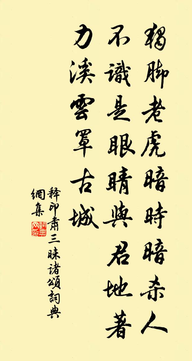 詩詞名句歷史字典書法欣賞書法字典國語詞典說文解字康熙字典古漢語字典標 題 作 者 詩 句 三昧諸頌作者:釋印肅 朝代:宋代三昧諸頌原文獨腳老虎,暗時暗1-1殺人。不識是眼睛,與君地著力,溪雲罩古城。詩詞問答問:三昧諸頌的作者是誰?答:釋印肅問:三昧諸頌寫於哪個朝代?答:宋代釋印肅三昧諸頌書法欣賞三昧諸頌書法作品詩詞推薦和晏尚書宴歸馬上醉題宋庠〔宋代〕寶闕凌雲宴罷初,紛紛歸騎遍春衢。燈光月彩留清玩,不覺車前甚寵呼。陽春歌吳象之〔唐代〕簾低曉露濕,簾卷鶯聲急。欲起把箜篌,如凝彩弦澀。孤眠愁不轉,點淚聲相及。淨掃階上花,風來更吹入。別濠樂主人丘葵〔宋代〕客中四月衣猶裌,桐下今年米似金。惘惘江山歸興動,悠悠歲月主恩深。三春已過仍淫雨,百事無緣空苦心。五十對雪吳錫疇〔宋代〕婆娑舞忽凌空去,散漫狂還掃地來。幾片飛黏梅樹上,恍疑昨夜有花開。壺中天/念奴嬌佚名〔宋代〕古來稀有,只聞道、是個人生七十。還遇小春梅蕊綻,對景裝排綺席。雲帔拖霞,朱顏暈酒,瑞氣明南極。瑤池歡送黃仲委秉少卿知瀘州二首楊萬里〔宋代〕補外公何辛,來歸我尚留。還為萬里別,又費半生愁。安得欹黃帽,相從卻白頭?醉中有話在,欲說忘來休。頌古釋法恭〔宋代〕臘月燒山,對面熟謾。瞥然悟去,身在長安。咄哉無限未歸客,沙裹求油實可憐。上令狐舍人李廓〔唐代〕名利生愁地,貧居歲月移。買書添架上,斷酒過花時。宿客嫌吟苦,乖童恨睡遲。近來唯儉靜,持此答深知。奉送崔侍御和蕃耿湋〔唐代〕萬里華戎隔,風沙道路秋。新恩明主啟,舊好使臣修。旌節隨邊草,關山見戍樓。俗殊人左衽,地遠水西流。日暮巫峽王安石〔宋代〕神女音容詎可求,青山回抱楚宮樓。朝朝暮暮空雲雨,不盡襄王萬古愁。別表兄軍倅許渾〔唐代〕盧橘花香拂釣磯,佳人猶舞越羅衣。三洲水淺魚來少,五嶺山高雁到稀。客路晚依紅樹宿,鄉關朝望白雲歸。交親和遺綃女子張資〔宋代〕濃麝應同瓊體織,輕綃料比杏腮紅。雖然未近來春約,已勝襄王魂夢中。病中鄭獬〔宋代〕丞相新詩懶未酬,一編藥錄在床頭。何時病骨健於鶻,直與秋風萬里游。送謝山人歸江夏陳陶〔唐代〕黃鶴春風二千里,山人佳期碧江水。攜琴一醉楊柳堤,日暮龍沙白雲起。初葺遺老齋二首蘇轍〔宋代〕髭鬚渾白已經歲,腰痛春來日又多。一味安閒猶有礙,卻令朝謁擬如何。築居定作子孫計,好事久遭僧佛呵。尤愧詠圍棋繆鑒〔宋代〕午香簾影靜浮華,對面機心萬里賒。夾騎倒戈窺虎穴,亂烏橫陣占鷗沙。當人不讓爭先著,袖手須饒老作家。欲訪蕭灑桐廬郡十絕范仲淹〔宋代〕蕭灑桐廬郡,清潭百丈餘。釣翁應有道,所得是嘉魚。酬李紺歲除送酒雍陶〔唐代〕歲盡貧生事事須,就中深恨酒錢無。故人充壽能分送,遠客消愁免自沽。一夜四乘傾鑿落,五更三點把屠蘇。已供環波亭曾鞏〔宋代〕水心還有拂雲堆,日日應須把酒杯。楊柳巧含煙景合,芙蓉爭帶露華開。城頭山色相圍出,檐底波聲四面來。誰信同友行山峰隱僧語釋文珦〔宋代〕我本忘世人,有志在岩穴。欣逢會心友,提攜步林樾。雲中野僧居,樹梢清磬發。不憚登陟勞,遂得造石窟。門前名句推薦惆悵南朝事,長江獨至今。劉長卿《秋日登吳公台上寺遠眺》 崑山玉碎鳳凰叫,芙蓉泣露香蘭笑。李賀《李憑箜篌引》 陶令不知何處去, 桃花源里可耕田 * 《七律·登廬山》 煙水茫茫,千里斜陽暮。山無數。亂紅如雨。秦觀《點絳唇·桃源》 路逢俠客須呈劍,不是才人莫獻詩。佚名《增廣賢文·上集》 雨色秋來寒,風嚴清江爽。李白《酬裴侍御對雨感時見贈》 一聲畫角譙門,豐庭新月黃昏,雪裡山前水濱。白樸《天淨沙·冬》 便向夕陽影里,倚馬揮毫。納蘭性德《風流子·秋郊即事》 銅壺漏報天將曉,惆悵佳期又一年。羅隱《七夕》 以其行理也。行理性於染當。墨子《墨子·03章 所染》