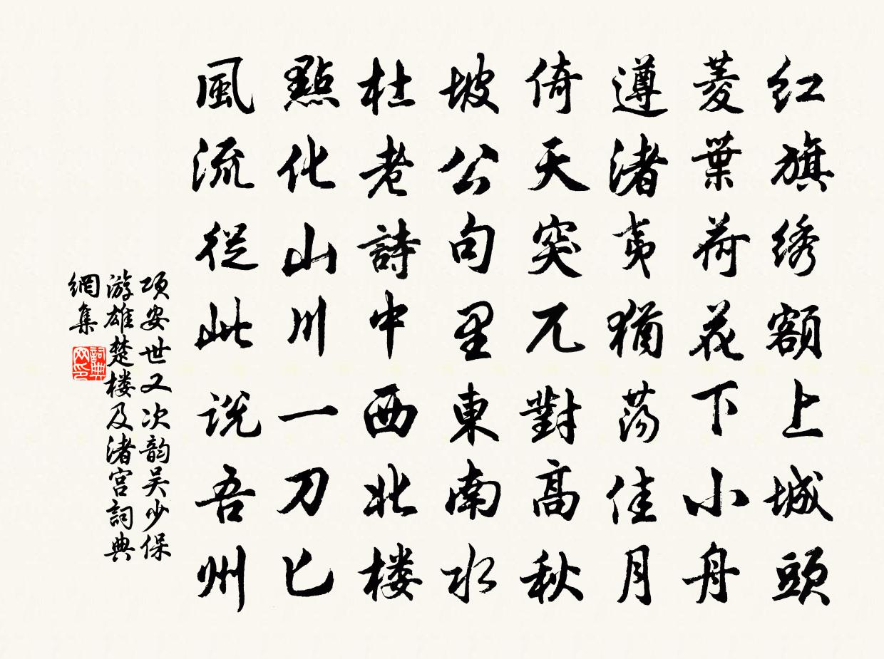 詩詞名句歷史字典書法欣賞書法字典國語詞典說文解字康熙字典古漢語字典標 題 作 者 詩 句 又次韻吳少保游雄楚樓及渚宮作者:項安世 朝代:宋代原文紅旗繡額上城頭,菱葉荷花下小舟。遵渚夷猶盪佳月,倚天突兀對高秋。坡公句里東南水,杜老詩中西北樓。點化山川一刀匕,風流從此說吾州。詩詞問答問:《又次韻吳少保游雄楚樓及渚宮》的作者是誰?答:項安世問:該詩寫於哪個朝代?答:宋代書法欣賞又次韻吳少保游雄楚樓及渚宮書法作品詩詞推薦偈頌一百一十七首釋紹曇〔宋代〕長須翁,久不見。壁角深藏,心灰百鍊。將期休影息陰,豈謂明明弄險。點出夜叉心,擘開菩薩面。醜惡既乖張,王勝之諫議見惠文房四寶內有巨硯尤佳因以謝邵雍〔宋代〕銅雀或常聞,未嘗聞金雀。始愧林下人,識物不甚博。金雀出何所,必出自靈岳。剪斷白雲根,分破蒼岑角。既為雜歌謠辭。漁父歌李珣〔唐代〕水接衡門十里餘,信船歸去臥看書。輕爵祿,慕玄虛,莫道漁人只為魚。避世垂綸不記年,官高爭得似君閒。傾白秋半聞鶯洪咨夔〔宋代〕木葉青黃幾栗留,盡情啼破兩山幽。怕人冷落生秋思,故作春聲為遣愁。句張順之〔宋代〕憑誰為寫無聲詩,清標不減淵明輩。瀟湘神黃公紹〔宋代〕看龍舟。看龍舟。兩堤未斗水悠悠。一片笙歌催鬧晚,忽然鼓棹起中流。蝶劉克莊〔宋代〕莊周言達理,吾以蝶為優。無想亦無夢,有身長有愁。龍門寺一首王阮〔宋代〕傍石尋幽徑,窮源得梵城。塔光侵地發,龍氣逼山清。是處堪吾老,何年遂此生。霜林知客意,一夜戰秋聲。齊雲樓葉適〔宋代〕天下雄諸侯,蘇州數一二。都會自昔稱,陪京今也貴。奕奕撰重樓,岧岧立平地。虛景混空蒼,囂聲收遠肆。闉闍使交河郡,郡在火山腳,其地苦熱無雨雪,獻封大夫岑參〔唐代〕奉使按胡俗,平明 * 台。暮投交河城,火山赤崔巍。九月尚流汗,炎風吹沙埃。何事陰陽工,不遣雨雪來。吾君邳州吳潛〔宋代〕荒城十載路重經,暫艤扁舟坐驛亭。春到梅花何處白,雪晴山色向人青。驚心家遠舊難寄,迎面風寒酒易醒。莫憶謾興陶夢桂〔宋代〕吟情常得閒情助,和氣多為直氣侵。易說難行天下事,未為先懶老來心。公然排闥清風入,悄地窺窗好月尋。風月陳元叟清軒鄭俠〔宋代〕塵坌中軒戶,誰標似水名。物訛空自汩,人性本來清。天上雲藏月,人間石裹英。雲開與石裂,精瑩自分明。幽事絕句陸游〔宋代〕新傳服氣訣,舊喜步虛吟。兒女不難棄,雲山何處深?菩薩蠻高子芳〔宋代〕去年曾祝夫人壽。今歲也又還依舊。鬢綠與顏朱。神仙想不如。骨相真難老。疑是居蓬島。那更舞霓裳。笙歌溢畫題臥龍山查簽〔宋代〕山顛祠貌儼丹青,千載懷人為一登。隱隱故營連白帝,茫茫恨水向西陵。古根蘭芷香無價,雲頂松杉翠作層。人事舟歸富池紀懷董嗣杲〔宋代〕風月幽情藉綠樽,賓士水陸最無根。官舟獨載年窮雪,社鼓相迎晚泊村。到岸茶商期又失,懷家蓴客眼添昏。煙蕪題楊家酒樓白玉蟾〔宋代〕碧落散郎下人世,騎雲鞭霆日日醉。楊家三杯松花醪,眼花渾不醒天地。知有溪山無名利,鐵笛吹破西山翠。無題吟邵雍〔宋代〕昔日不鍊物,嘗為物所誤。今日不鍊人,又為人所怒。物誤亦可辯,人怒難往訴。我對人稱過,人亦為我恕。少年行杜甫〔唐代〕馬上誰家薄媚郎,臨階下馬坐人床。不通姓字粗豪甚,指點銀瓶索酒嘗。名句推薦質勝文則野,文勝質則史。文質彬彬,然後君子。孔子弟子《論語·雍也篇》 嗚呼! 何時眼前突兀見此屋杜甫《茅屋為秋風所破歌》 歸鴻聲斷殘雲碧。背窗雪落爐煙直。李清照《菩薩蠻·歸鴻聲斷殘雲碧》 好問則裕,自用則小。佚名《尚書正義·卷八·仲虺之誥》 耐寒唯有東籬菊,金粟初開曉更清。白居易《詠菊》 娉娉裊裊十三餘,豆蔻梢頭二月初。杜牧《贈別二首》 北國風光,千里冰封,萬里雪飄。 * 《沁園春·雪》 闌乾風冷雪漫漫,惆悵無人把釣竿。姜夔《釣雪亭》 及時當勉勵,歲月不待人。陶淵明《雜詩·人生無根蒂》 君子欲訥於言而敏於行。孔子弟子《論語·里仁篇》