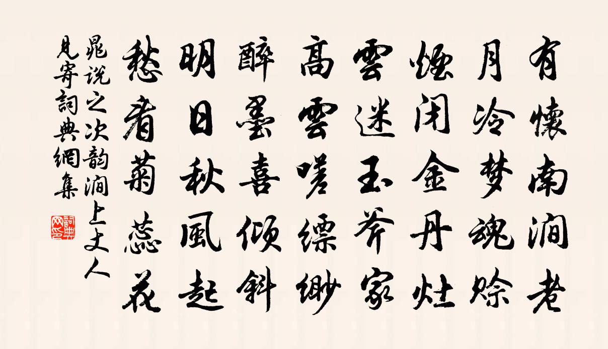 詩詞名句歷史字典書法欣賞書法字典國語詞典說文解字康熙字典古漢語字典標 題 作 者 詩 句 次韻澗上丈人見寄作者:晁說之 朝代:宋代次韻澗上丈人見寄原文有懷南澗老,月冷夢魂賒。煙閉金丹灶,雲迷玉斧家。高雲嗟縹緲,醉墨喜傾斜。明日秋風起,愁看菊蕊花。詩詞問答問:次韻澗上丈人見寄的作者是誰?答:晁說之問:次韻澗上丈人見寄寫於哪個朝代?答:宋代晁說之次韻澗上丈人見寄書法欣賞次韻澗上丈人見寄書法作品詩詞推薦贈閭丘廣文趙汝鐩〔宋代〕奔走異軌轍,聚散水上萍。誰知風月夕,同登藕花亭。駒隙晝夜駃,塵埃鬢俱星。朋舊半埋玉,念此慨頹齡。天涯題畫秋景李用〔宋代〕秋月揚明輝,芙蓉開朵朵。捲起水晶簾,明月清風我。密友花董嗣杲〔宋代〕此花誰謂結朋慳,點染繁枝怯手刪。叢矮暗埋晴徑秀,刺多橫接露籬間。野香雨浥遺春態,茜艷風梢取醉顏。情似重陽客中吳龍翰〔宋代〕愁里重陽近,他鄉酒易酤。秋風詩鬢短,寒夜客燈孤。筍笠月穿破,荷衣霜打枯。有懷吟未就,端不為催租。題巴州光福寺楠木嚴武〔唐代〕楚江長流對楚寺,楠木幽生赤崖背。臨谿插石盤老根,苔色青蒼山雨痕。高枝鬧葉鳥不度,半掩白雲朝與暮。香殿題吟所劉黻〔宋代〕為吟新搆屋,喧寂一溪分。洗竹夜留月,開門朝放雲。佛藏孤塔見,虎嘯別山聞。予喜頻來此,幽情爾共雲。採石渡陳造〔宋代〕大江礙崇山,突起作湍悍。採石天下險,揭厲誰敢玩。戈樓泊千艘,鋒旗麗天漢。昨憶辛已秋,胡馬蜂蟻亂。敢觸走筆次廷藻韻二絕張元乾〔宋代〕風雨聲中過半春,泥深郊水阻遊人。老夫不出渾閒事,但覺年來白髮新。送陳魯叟使君赴廣西漕劉克莊〔宋代〕韓杜曾游處,君行得細尋。那知瘴煙里,忽有福星臨。竭海求珠蚌,搜山采翠禽。定將冰與檗,一洗濁夫心。寄大人二首 其二朱淑真〔宋代〕極目思鄉國,千里更萬津。庭闈勞夢寐 道路壓埃塵。詩禮聞相遠,琴樽誰是親?愁看羅袖上,長搵淚痕新。別母苗氏女〔宋代〕桃花飛盡馬勝春,此日辭家淚滿巾。豈是比鄰無嫁處,千山萬水逐行人。南歌子程大昌〔宋代〕才出滄溟底,旋明紫岫腰。玉光漫漫涌層潮。上有乘流海賈、臥 * 。更上雲台望,翻牽旅思遙。我生何許著簞瓢遷客黨碑劉克莊〔宋代〕人無公議論,天有真是非。佛肯護遷客,雷能碎黨碑。菩薩蠻(水晶膾)高觀國〔宋代〕玉鱗熬出香凝軟。並刀斷處冰絲顫。紅縷間堆盤。輕明相映寒。纖柔分勸處。膩滑難停筋。一洗醉魂清。真成醒酒示祖元禪人釋宗杲〔宋代〕萬仞岩頭解放知,起來依舊卻惺惺。飢餐渴飲渾無事,那論昔人非昔人。橙子四首劉子翬〔宋代〕尚懷細雨初移日,著子已見清霜潸。絕憐面有貴人色。偶致吾儕樽俎間。霜天曉角吳潛〔宋代〕雲收霧辟。萬里天空碧。舟過蛾眉亭下,景似舊、人非昔。年事如梭擲。世事如棋弈。撫掌扣舷一笑,今古恨、問即事六絕王炎〔宋代〕拂拭青奴供晝眠,半晴半雨釀愁天。夢回不到南柯境,風過綠陰號晚蟬。贊徑山音首座釋鹹傑〔宋代〕氣宇雲閒,身心木槁。頂門正眼,紅日杲杲。早投長蘆劃草之機,晚分雙徑人天之座。名山屢招而不赴,一庵超然至論吟邵雍〔宋代〕民於萬物已稱珍,聖向民中更出群。介石不疑何盡日,知幾何患未如神。若無剛果難成善,既有精明又貴純。禍福名句推薦昔人已乘黃鶴去,此地空餘黃鶴樓。崔顥《黃鶴樓 / 登黃鶴樓》 江淮度寒食,京洛縫春衣。王維《送綦毋潛落第還鄉 / 送別》 善有善報,惡有惡報。佚名《增廣賢文·上集》 雲鎖嫩黃煙柳細,風吹紅蒂雪梅殘。閻選《八拍蠻·雲鎖嫩黃煙柳細》 淇則有岸,隰則有泮。佚名《氓》 兵久則力屈,人悉則變生。范曄《後漢書·列傳·桓譚馮衍列傳上》 中心愿,平虜保民安國。宋江《滿江紅·喜遇重陽》 記得綠羅裙,處處憐芳草。賀鑄《綠羅裙·東風柳陌長》 上醫醫國,其次疾人左丘明《國語·晉語·醫和視平公疾》 白馬金羈遼海東,羅帷繡被臥春風。李白《春怨》
