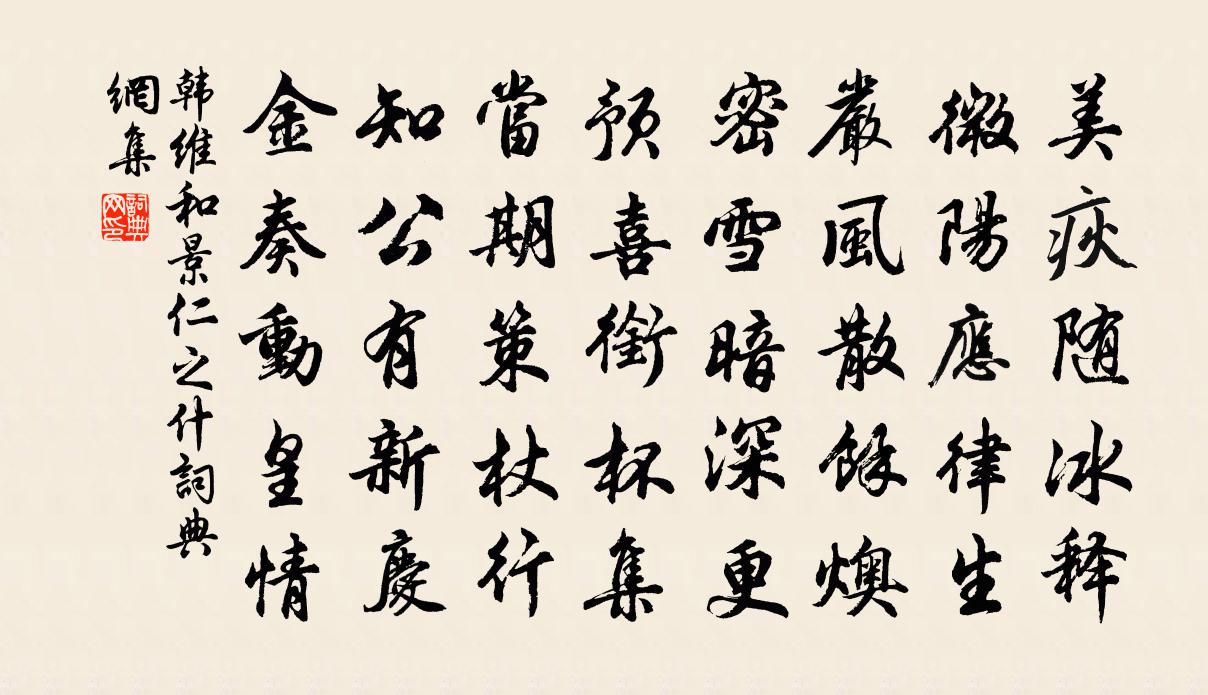 詩詞名句歷史字典書法欣賞書法字典國語詞典說文解字康熙字典古漢語字典標 題 作 者 詩 句 和景仁之什作者:韓維 朝代:宋代和景仁之什原文美疢隨冰釋,微陽應律生。嚴風散余燠,密雪暗深更。預喜銜杯集,當期策杖行。知公有新慶,金奏動皇情。詩詞問答問:和景仁之什的作者是誰?答:韓維問:和景仁之什寫於哪個朝代?答:宋代韓維和景仁之什書法欣賞和景仁之什書法作品詩詞推薦寄豐陽喻長官王禹偁〔宋代〕七十年華鬢未霜,道情偏稱宰豐陽。早衙請印無仇覽,夜榻圍棋祗孟光。庭戶萬重嵐氣潤,盤餐數飣藥苗香。猶言新燕齊己〔唐代〕棲托近佳人,應憐巧語新。風光華屋暖,弦管牡丹晨。遠采江泥膩,雙飛麥雨勻。差池自有便,敢觸杏梁塵。和范元作五絕胡寅〔宋代〕久矣閟大音,無譏鄶以下。一聞入聖處,萬古洗凡馬。松齋秋吟裘萬頃〔宋代〕驕陽赫赫轉秋陰,便覺蕭然鬢影侵。世事炎涼俄忽爾,閒來物理靜推尋。昇平公主舊第羅隱〔唐代〕乘鳳仙人降此時,玉篇才罷到文詞。兩輪水磑光明照,百尺鮫綃換好詩。帶礪山河今盡在,風流樽俎見無期。壇場氐州第一方千里〔宋代〕朝日融怡,天氣艷冶,桃英杏萼猶小。燕壘初營,蜂衙乍散,池面煙光縹緲。芳草如薰,更瀲灩、波光相照。錦繡次韻子由召伯埭見別三首秦觀〔宋代〕冠蓋紛紛不我謀,掩關聊與古人游。會須匹馬淮西去,雲巘風溪遂所求。柳枝詞十三首司馬光〔宋代〕舞腰繽紛長樂東,柳間悵飲送春風。請君試望邯鄲道,青門裊裊徹新豐。送人化修上釋慧空〔宋代〕盡謂黃龍山里龍,彌年翻去碧潭空。君行為報居人道,遐邇雖殊一雨同。菩薩蠻蘇軾〔宋代〕風回仙馭雲開扇。更闌月墮星河轉。枕上夢魂驚。曉檐疏雨零。相逢雖草草。長共天難老。終不羨人間。人間日似喜臘雪潘閬〔宋代〕久早臘月如夏熱,夜來忽降一尺雪。叫謝上天聲應徹,且壓瘴氣不作孽。紹熙甲寅五月十七日從令尹張濟之早飯獅子岩李長庚〔宋代〕朝游獅子晚陽華,玩水看山樂可涯。野鶴沙鷗慣看客,一雙對立流頭沙。【越調】小桃紅_胖妓夜深交王和卿〔元代〕胖妓夜深交頸效鴛鴦、錦被翻紅浪。雨歇雲收那情況,難當:一翻翻在人身上,偌長偌大,偌粗偌胖,壓扁沈東陽菩薩蠻李元膺〔宋代〕彩旗畫柱清明後。花前姊妹爭攜手。先緊繡羅裙。輕衫束領巾。瑣繩金釧響。漸出花梢上。笑里問高低。盤雲嚲玉偈頌十二首釋安永〔宋代〕世出世間稱第一,誰敢當頭正眼觀。今日風雲欣慶會,九重深處現龍顏。次韻答李景陽柯舉〔宋代〕客有扣舷者,悠然太古音。風清來水面,月白滿江心。世既嘆途絕,君何愛我深。愧將瓦缶句,聊以答南金。雜興六言十首劉克莊〔宋代〕昔從西山授業,屢言後村當仁。伯紀蓋同學子,履常真對掌人。補樂歌十首。大濩元結〔唐代〕(《大濩》,有殷氏之樂歌也,其義蓋稱湯救天下,濩然得所。凡二章,章四句)萬姓苦兮,怨且哭,不有聖人兮題仇書圖錢選〔宋代〕兩兩挾策游康衢,聚戲不異同隊魚。忽然兒態起爭競,捐棄篋笥仇詩書。吊盧玉堂趙汝回〔宋代〕金鑾坡上文星落,收拾遺文有幾函。草制空教生白髮,蓋棺只是著青衫。吟魂夜訪林墳木,破屋寒拋謝客岩。自有名句推薦樹荊棘得刺,樹桃李得蔭馮夢龍《警世通言·卷十八》 波瀾誓不起,妾心古井水。孟郊《列女操 / 烈女操》 一日不思量,也攢眉千度。柳永《晝夜樂·洞房記得初相遇》 山路元無雨,空翠濕人衣。王維《山中》 窮則獨善其身,達則兼善天下。孟子《孟子·盡心章句上·第九節》 上苑風煙好,中橋道路平。白居易《洛橋寒食日作十韻》 白日登山望烽火,黃昏飲馬傍交河。李頎《古從軍行》 朽木不可雕也,糞土之牆不可杇也,於予與何誅?孔子弟子《論語·公冶長篇》 記得短亭歸馬,暮衙蜂鬧。吳文英《天香·蠟梅》 圖難於其易,為大於其細老子《老子·德經·第六十三章》